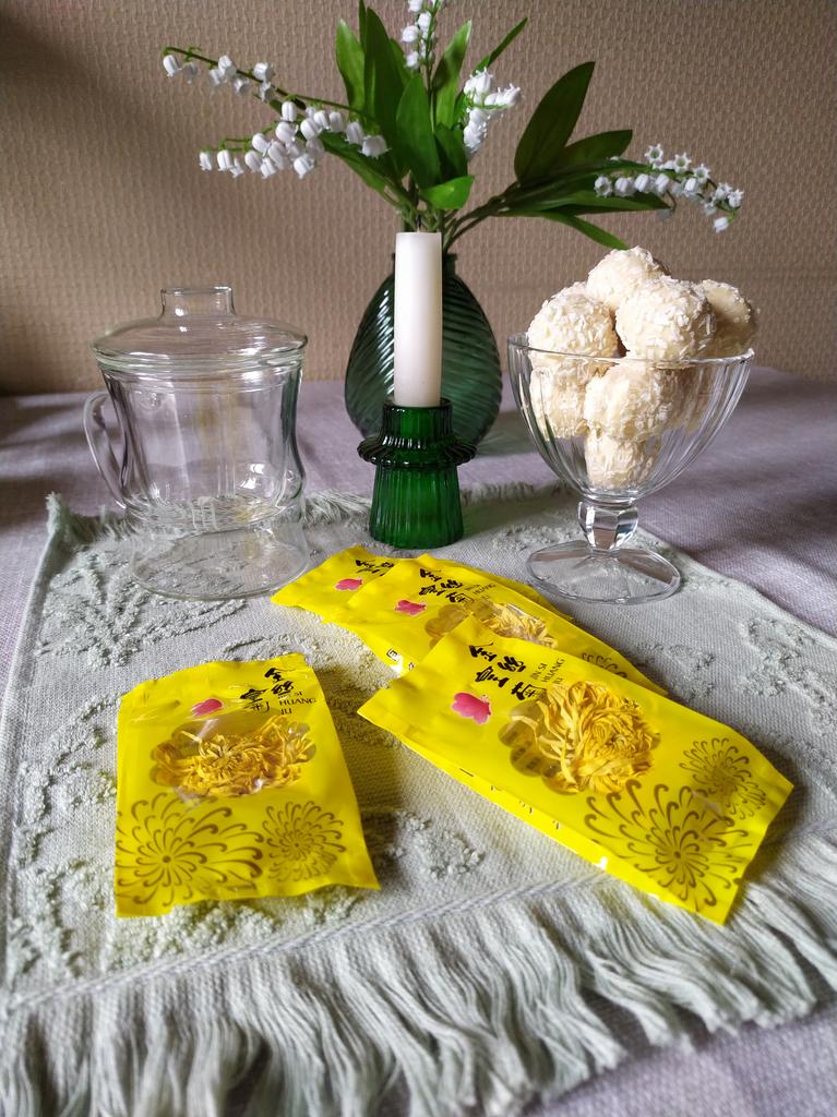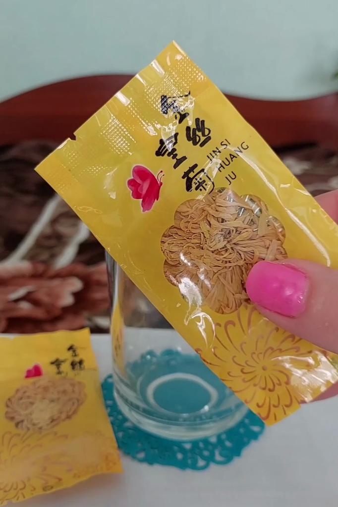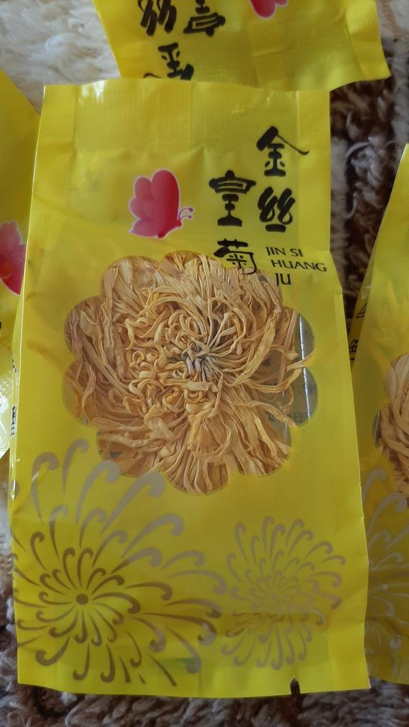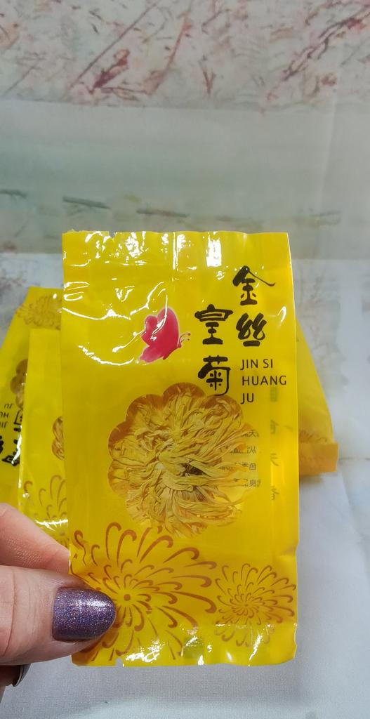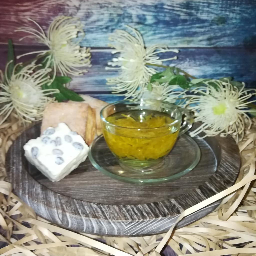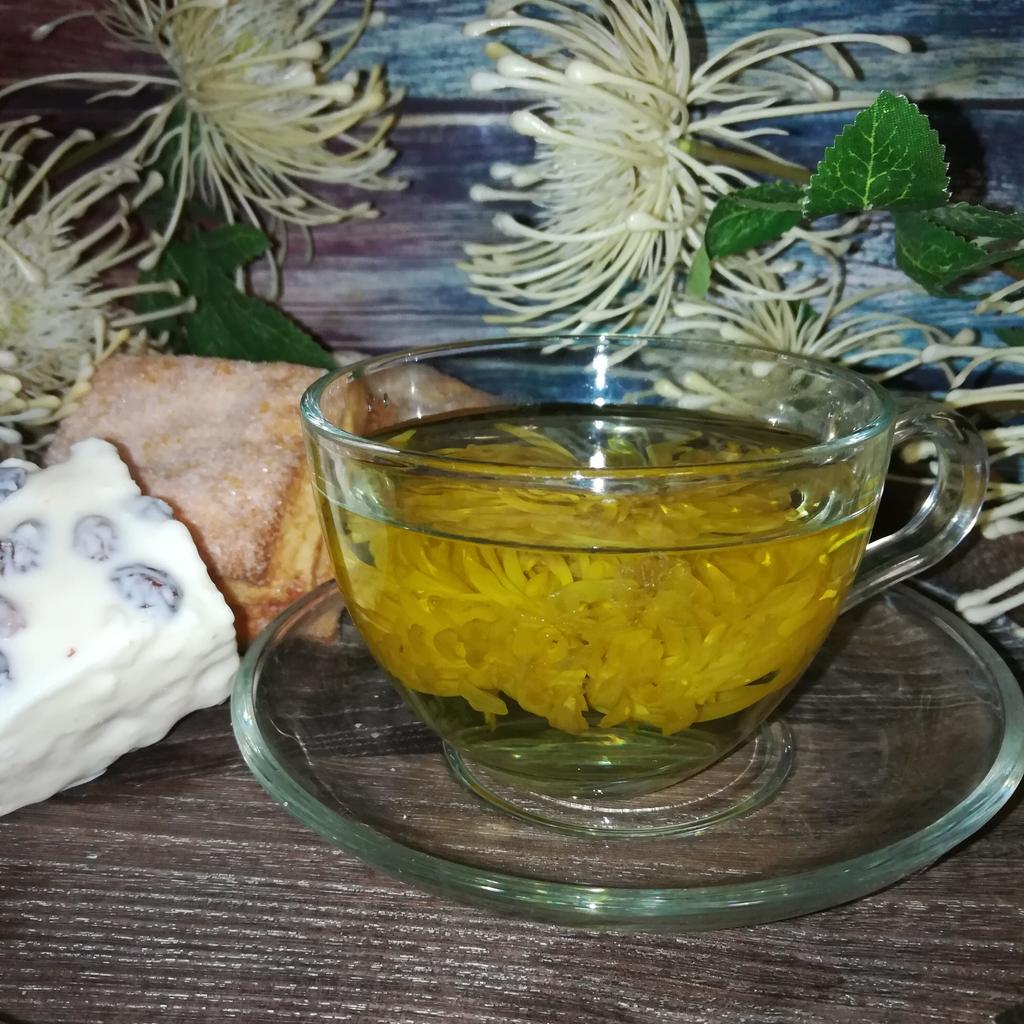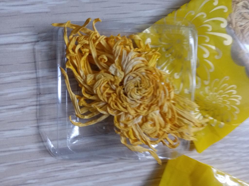Tea with yellow chrysanthemum 4 sachets per set. Inside everyone is a real flower. The taste is pleasant, herbal with a hint of flowers.. Interesting. I like it.