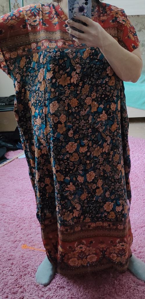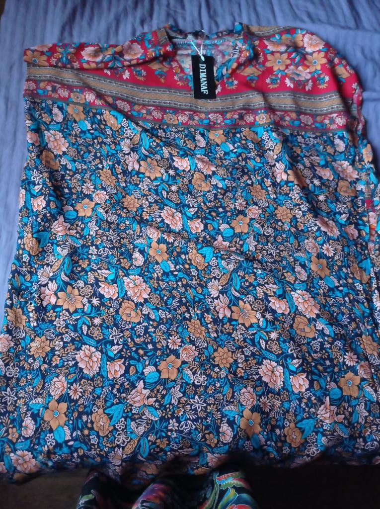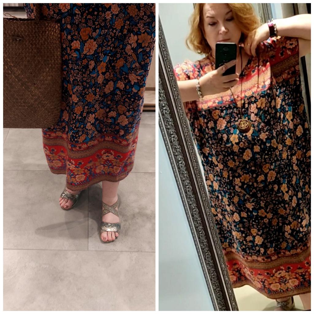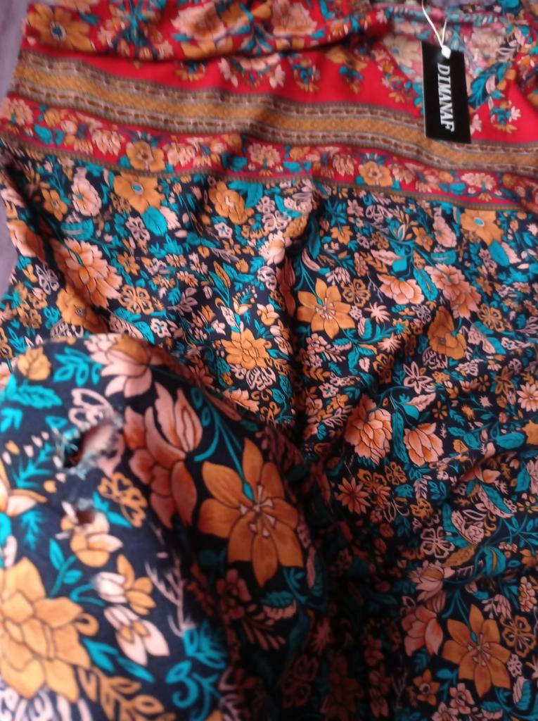 Pretty long sleeveless dress, well colored, bohemian style. 💝💐 The fabric is made of polyester and cotton but very pleasant on the skin. 👎😤 Seams, neckline, hems and finishes are well done. 😍⭐ Too bad the front and back fabric are misaligned. (picture 7)👎👎