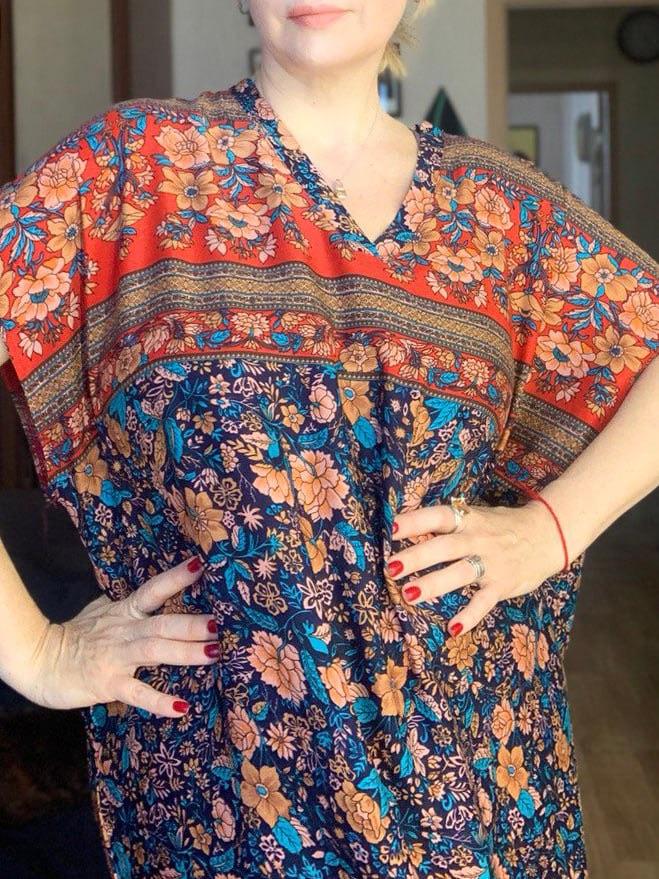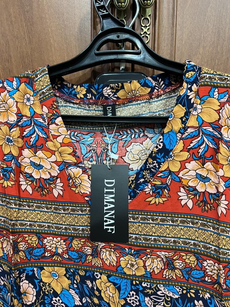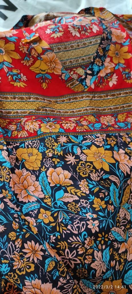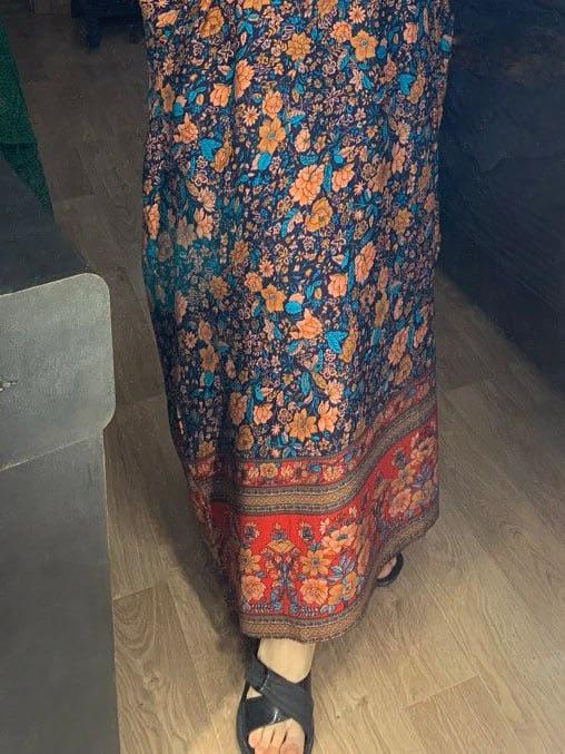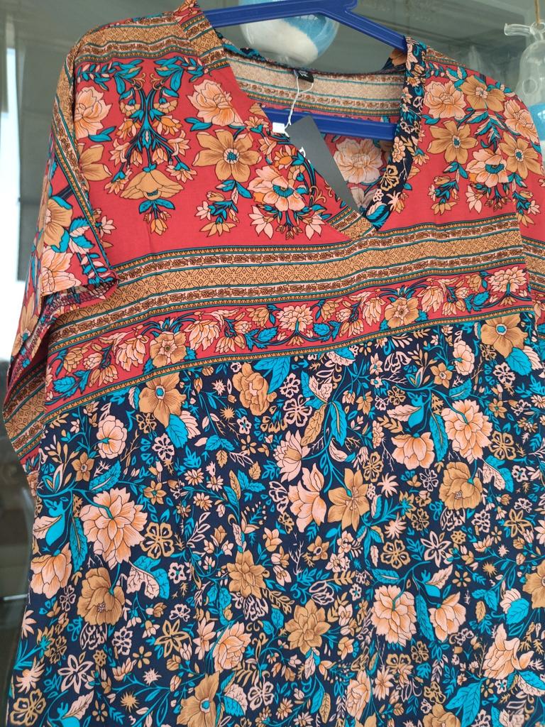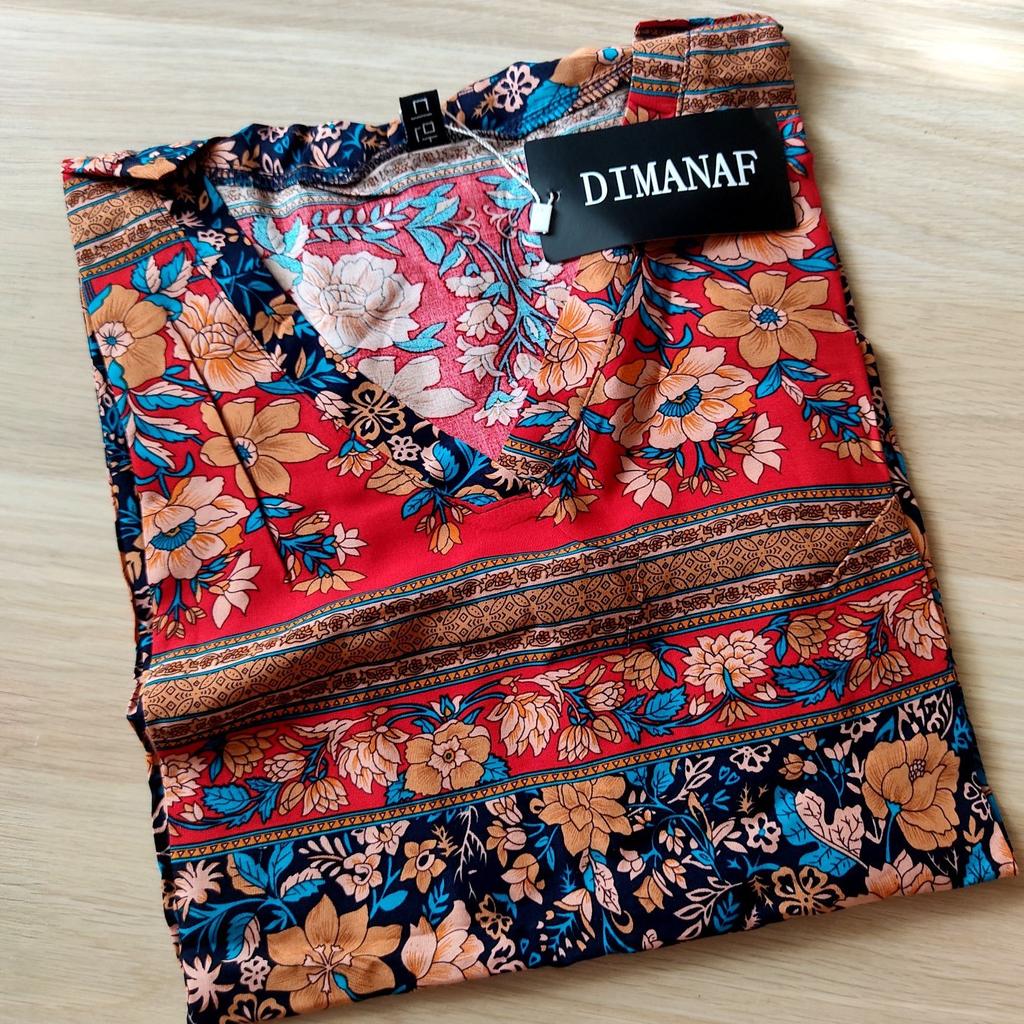 Pretty long sleeveless dress, well colored, bohemian style. 💝💐 The fabric is made of polyester and cotton but very pleasant on the skin. 👎😤 Seams, neckline, hems and finishes are well done. 😍⭐ Too bad the front and back fabric are misaligned. (picture 7)👎👎