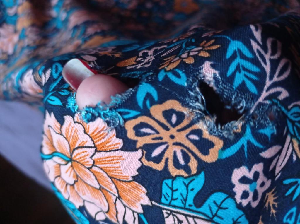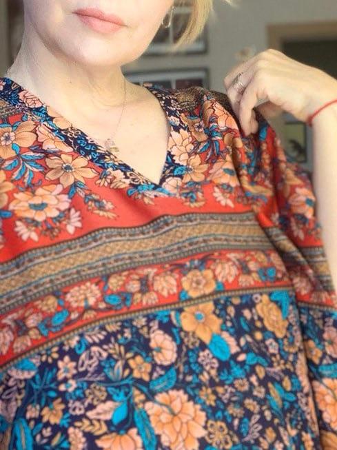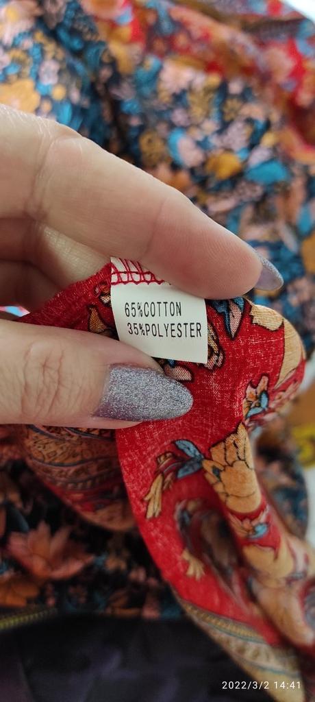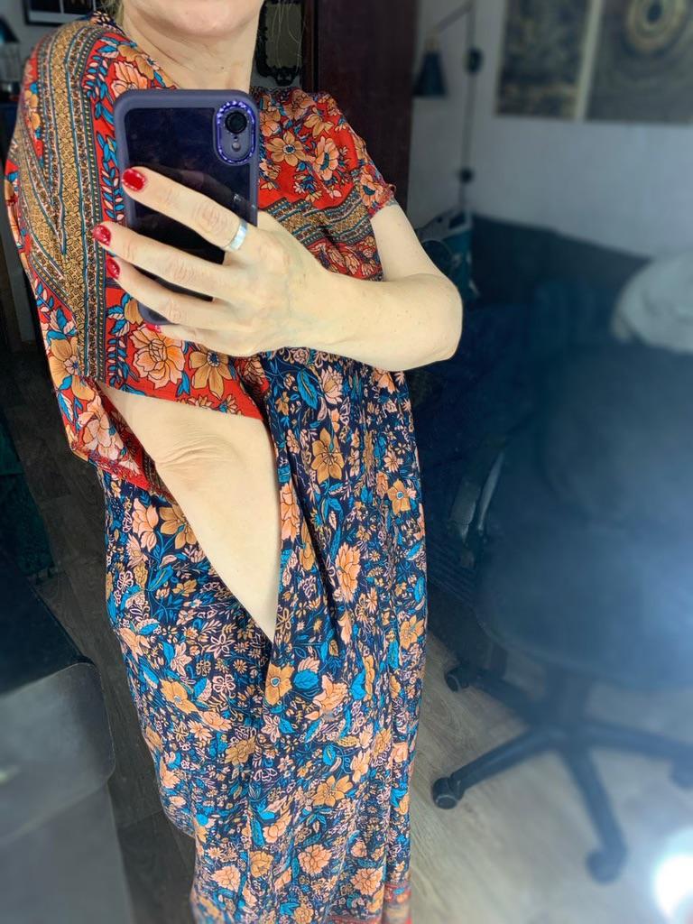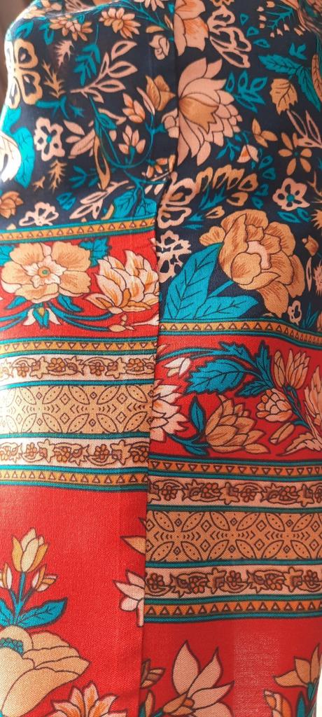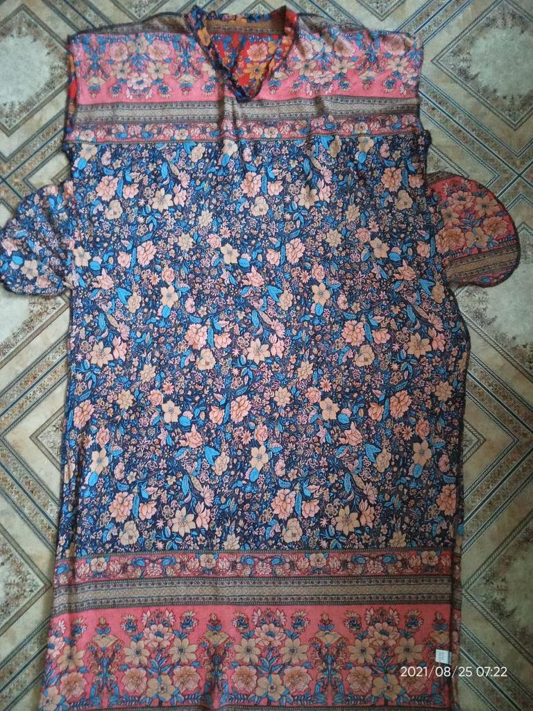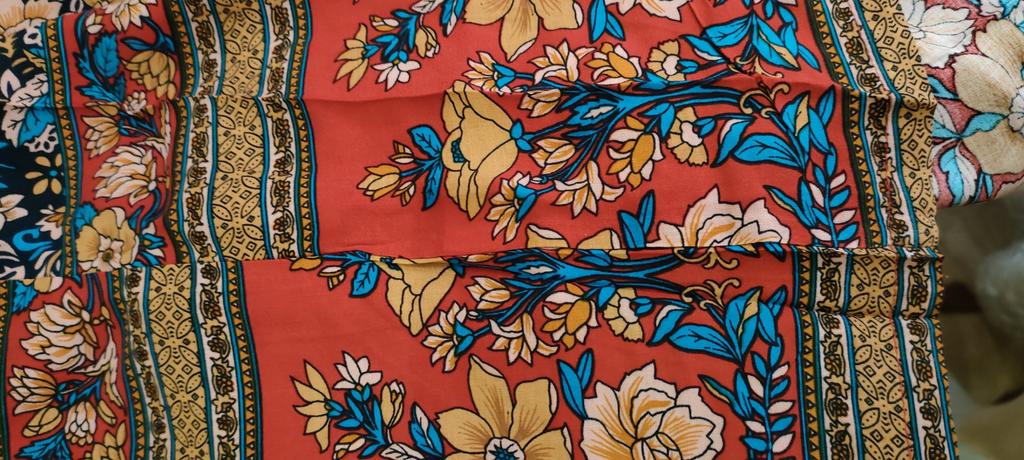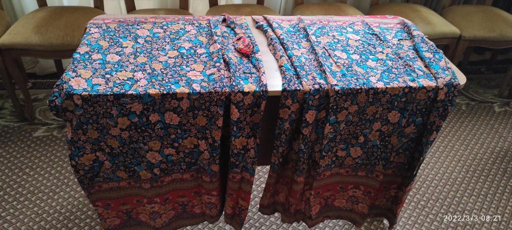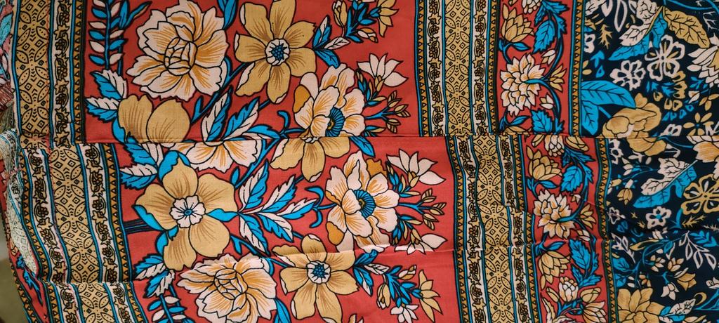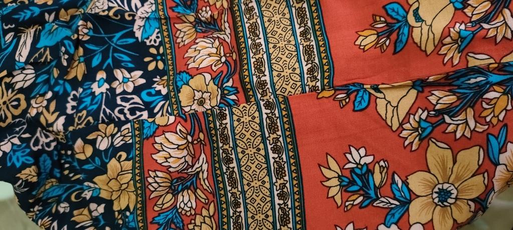 The fabric is beautiful. Well done. But I'll have to hem it, cut the bottom decorative strip, which is a shame. I'm 1.62 meters, it's too long for me.