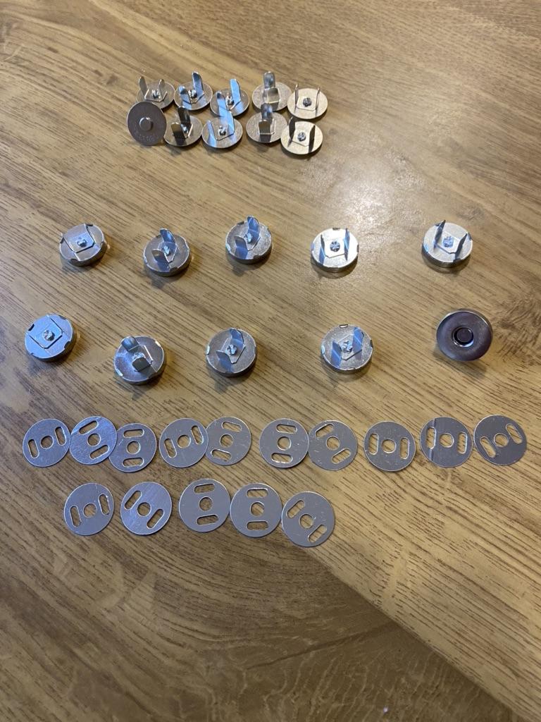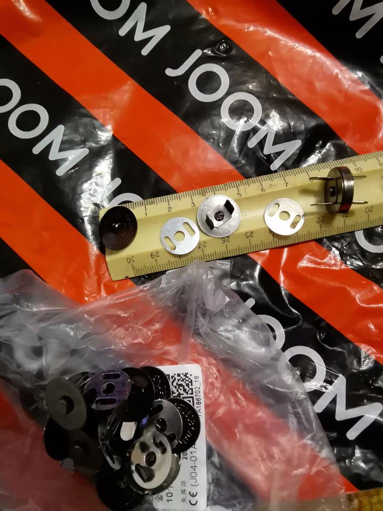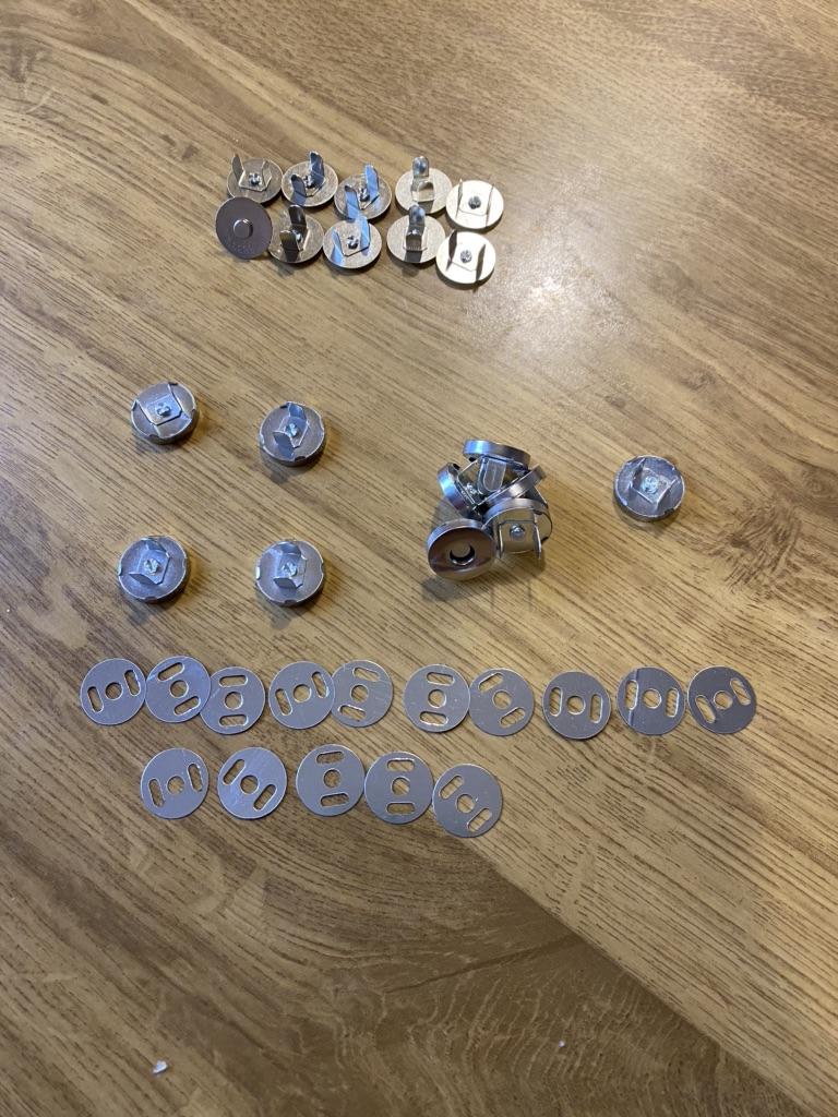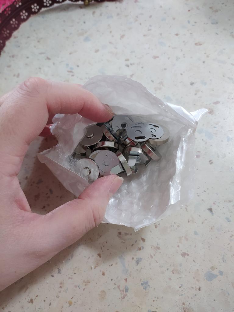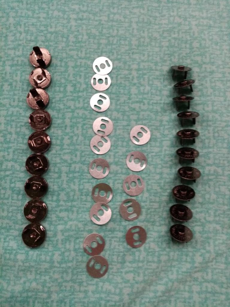 Products received, as described except that 4 small circles are missing that go behind the magnet button. Out of 10 buttons ordered, I can only use 8. Too bad.