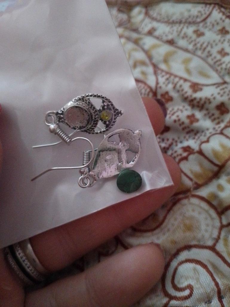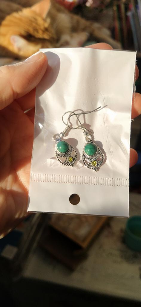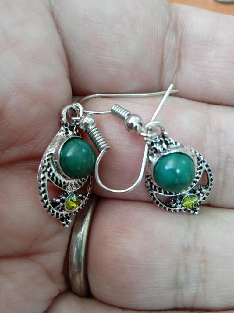 Ethnic EARRINGS Ethnic earrings at a low price. arrived in Italy with tracking in 16 days. Well packed, wrapped in bubble wrap, they arrived perfectly intact. They are splendid 😍😍😍😍 Packaging: simple plastic bag The frame is in metal (zinc alloy) plated with antique silver The earrings have a pendant with a round sphere in green resin in the center. All the stones are perfectly set, firmly in place. No glue stains. The earrings measure 21mm x 13mm Recommended purchase 👍