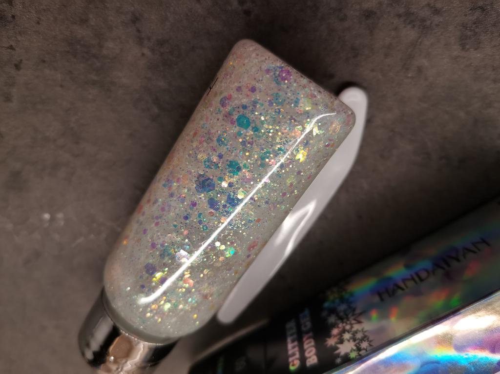 It looks great. Holds up well after drying. The bottle is quite small, but a small amount is enough for the effect. In addition, it has a spoon to apply.