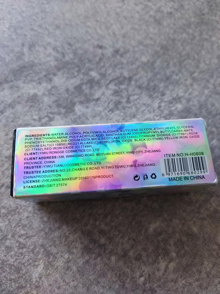 water, polyvinyl alcohol, butylene glycol, ethylhexyl glycerin. triethanolamine, poly-acrylic acid. xanthan gum. iodopropyl butyl carbamate, phenoxyethanol, disodium edta, mica. red 7 lake (ci 15850), titanium dioxide (ci 77891), red 6 sodium salt (ci 15850), red 21 allake (cl 45380), iron oxide black (ci 77499), iron oxide yellow (cl 77492), iron oxide red (ci 77499)