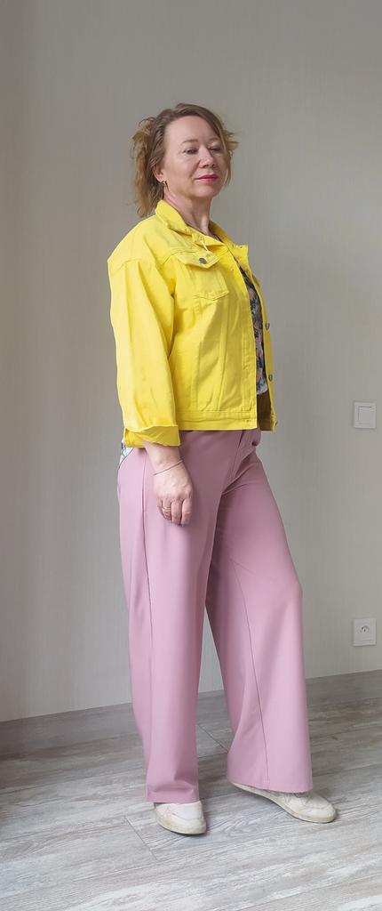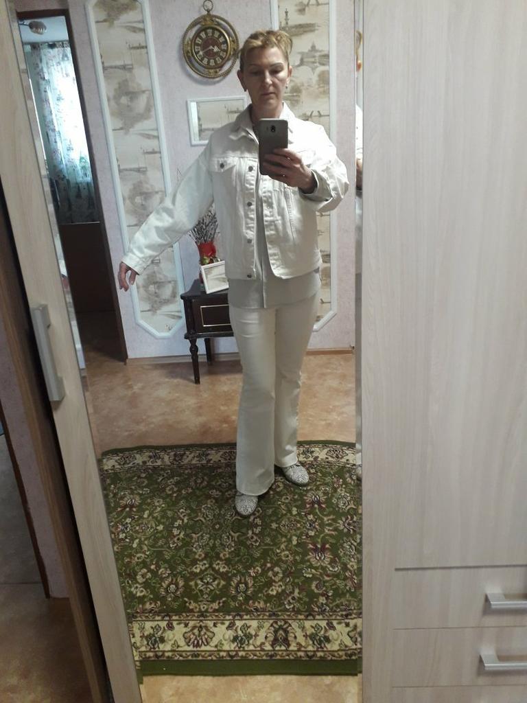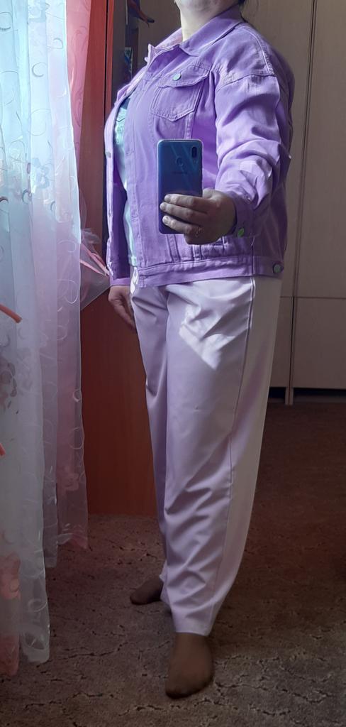 The jacket is beautiful for my size 52, a little too big, the color is as in the photo, the jeans are soft. I recommend to buy.