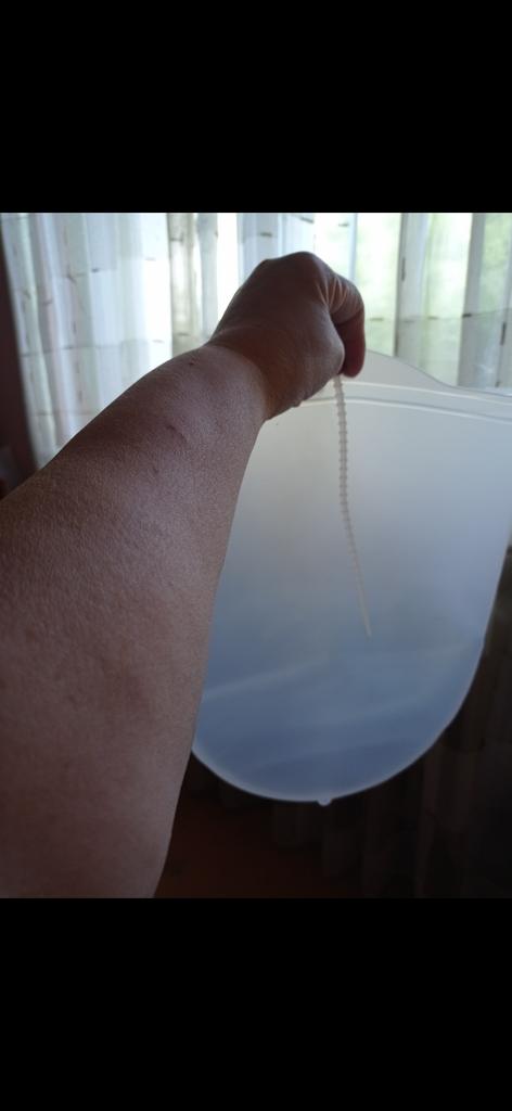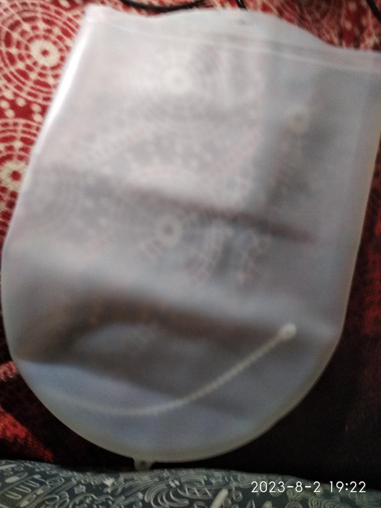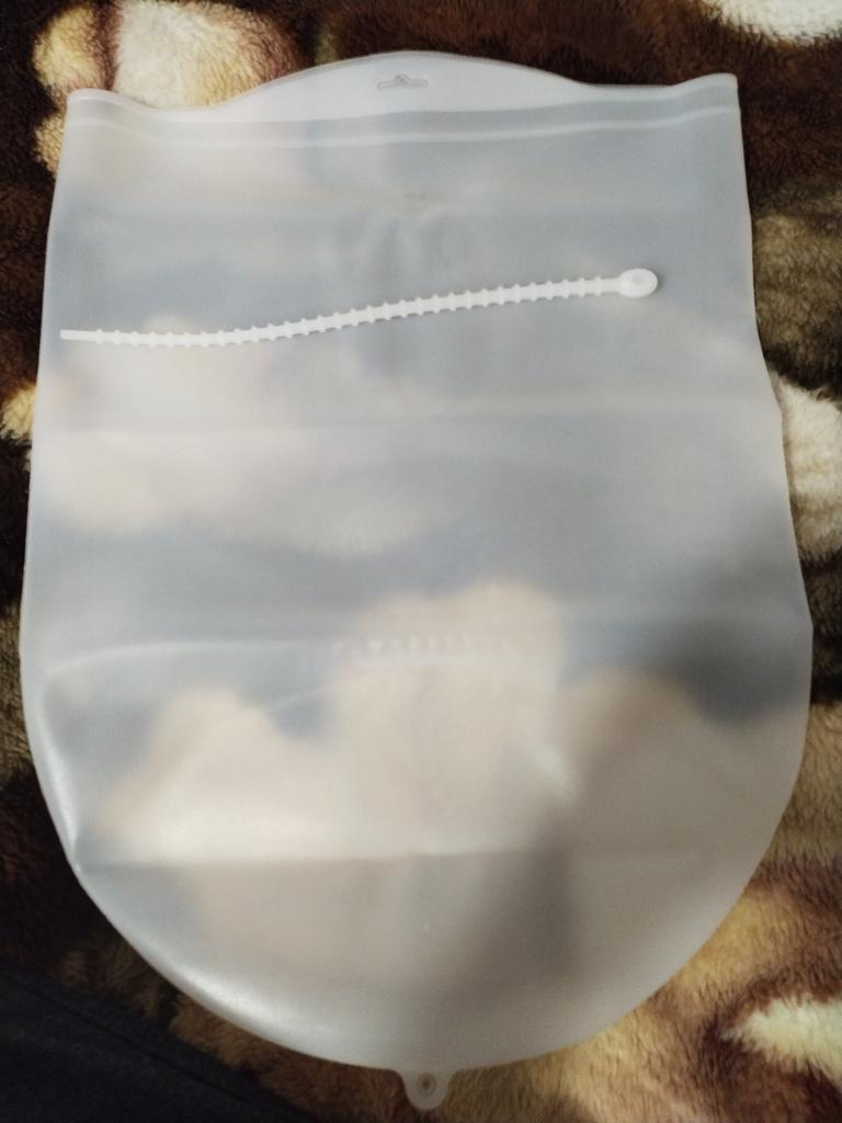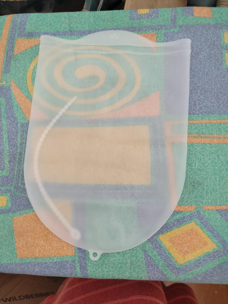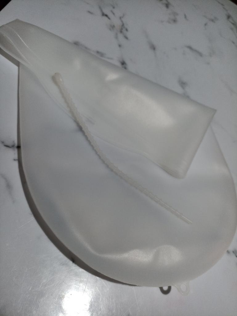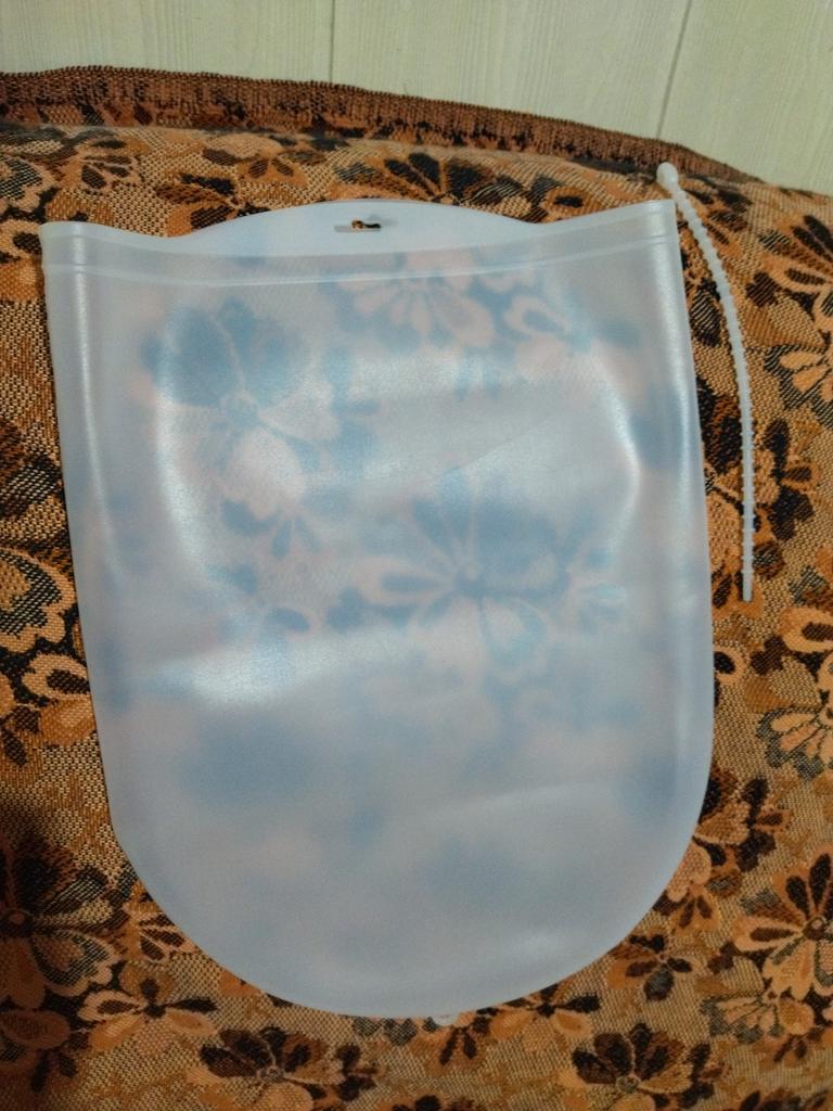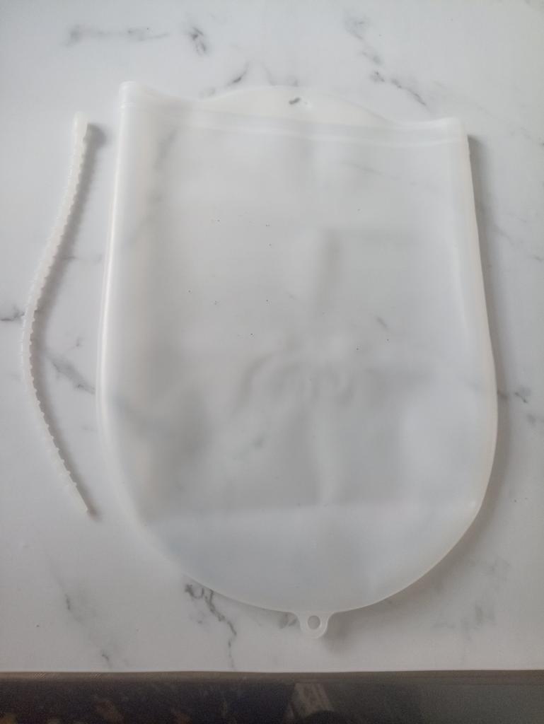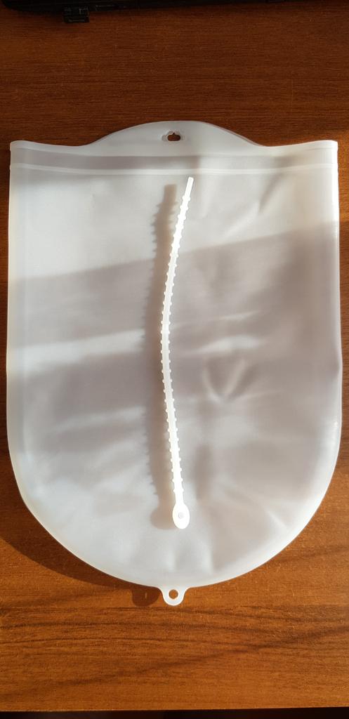 Super bag. Large, fully corresponds to the declared size. Has both top and bottom loops for hanging for drying and storage. And a silicone cord-clamp included. It accommodated dough for lazy dumplings from one kg of sour milk cheese. Very satisfied with the purchase. I recommend the seller.