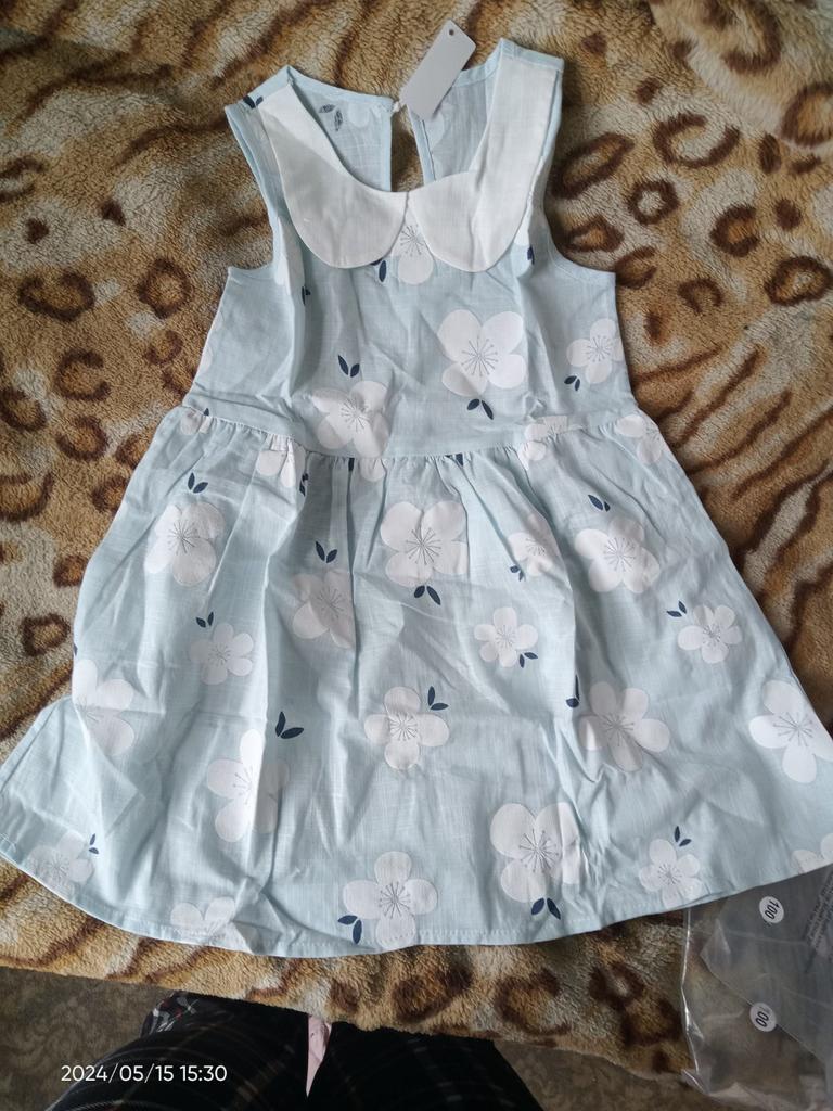 The dress is cotton, white flowers seem to be printed with rubber paint. The look of the dress is delicate, sewn neatly, there is a smell of dampness. It’s still too big for us, no big deal) overall it’s a nice, good dress) thank you)
