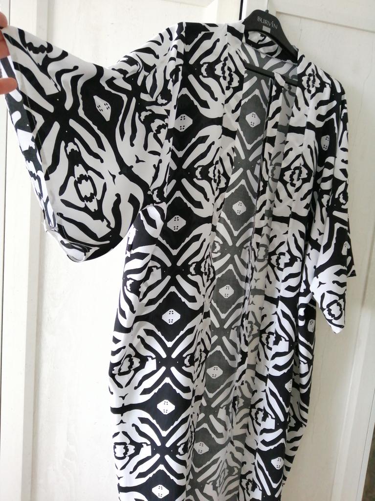 Actually a nice product, but not as was shown in the pictures. The sleeves are about 15 cm shorter than we are let to believe. I was going for sort of a boho look, but it's more like a bathhouse kimono. See the sleeves on the model (who is quite tall), see the sleeves on the mannequin and see the sleeves in my photo (and I have rather standard length arms).