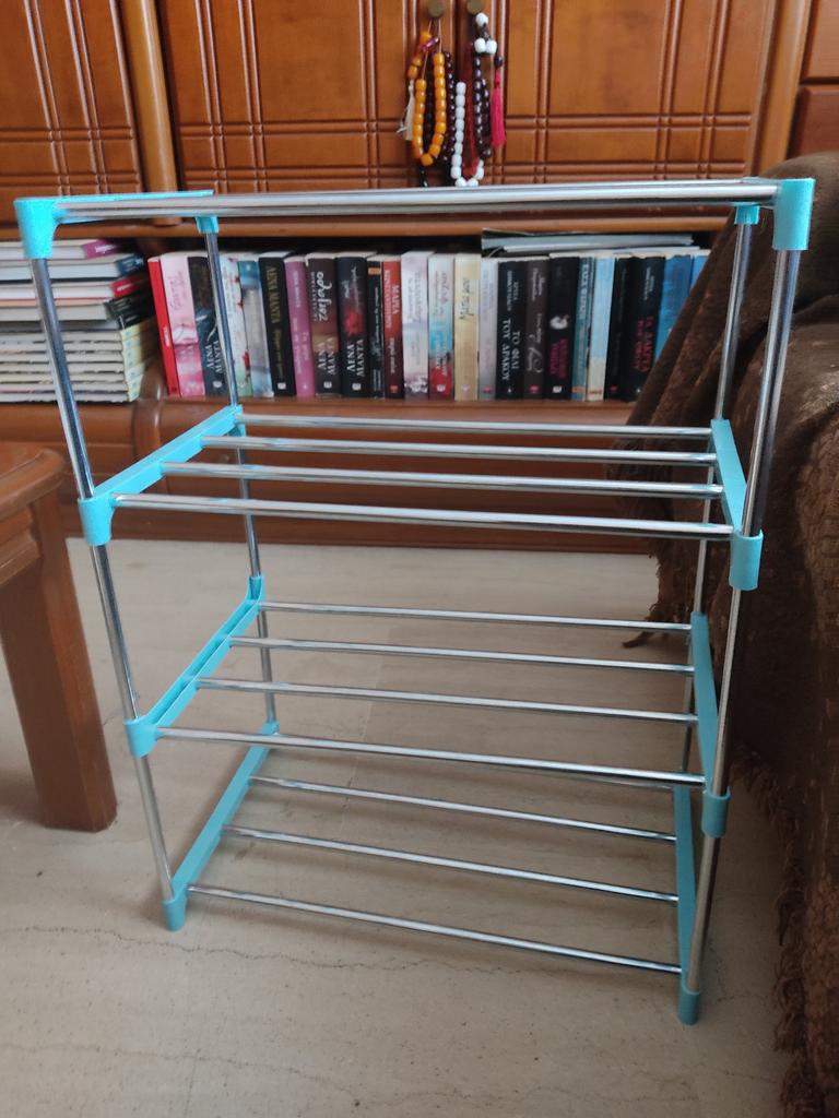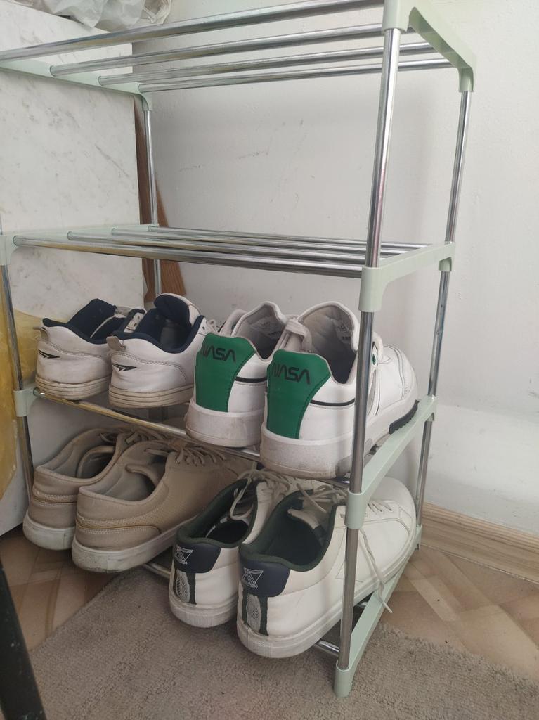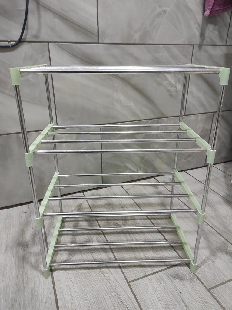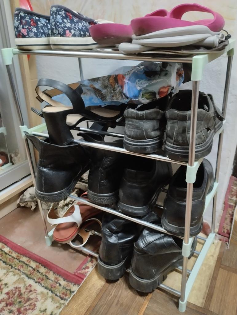 The shelf came in a disassembled package. While collecting, half of the plastic chipped off. Parts are dirty and deformed. The shelf is small, not for adult shoes. Rather, it is for children's, because two pairs barely fit on one shelf. Stand confidently. If you buy it for children's indoor shoes, I do not recommend it.