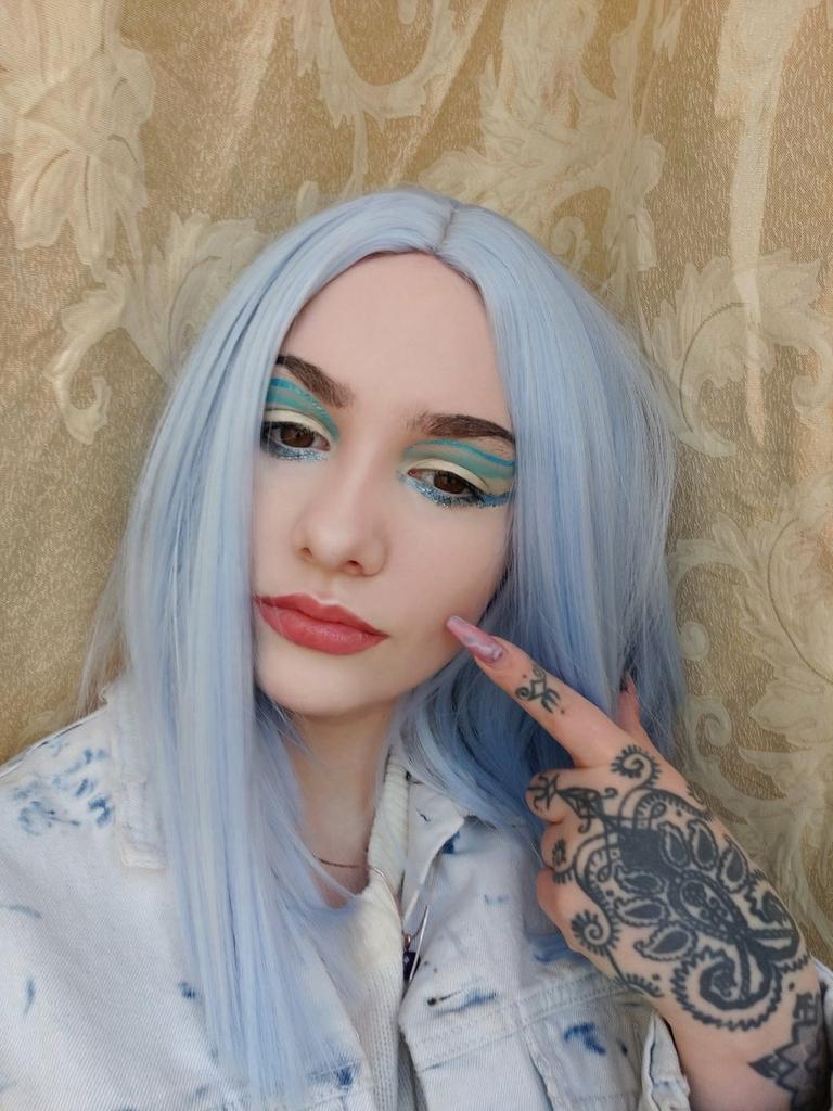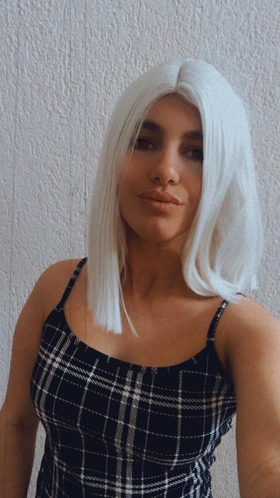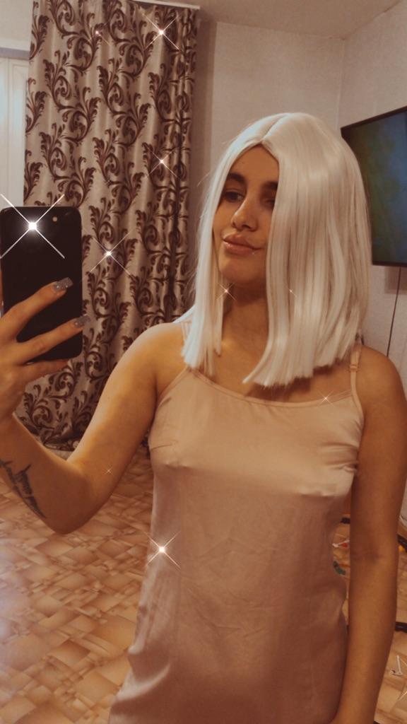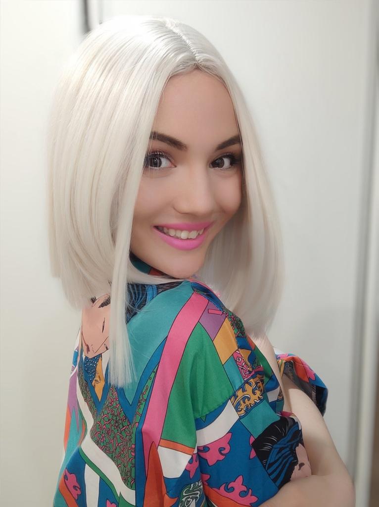 She is incredibly sweet! A security blanket. A little darker than in the seller's photo, but very beautiful I received a small gift with a small temporary tattoo I really like this attention! Very shiny but you can tell it's a wig that won't tie knots I like it very much and the cut is very pretty Also tears off the front of the head so it holds up very well