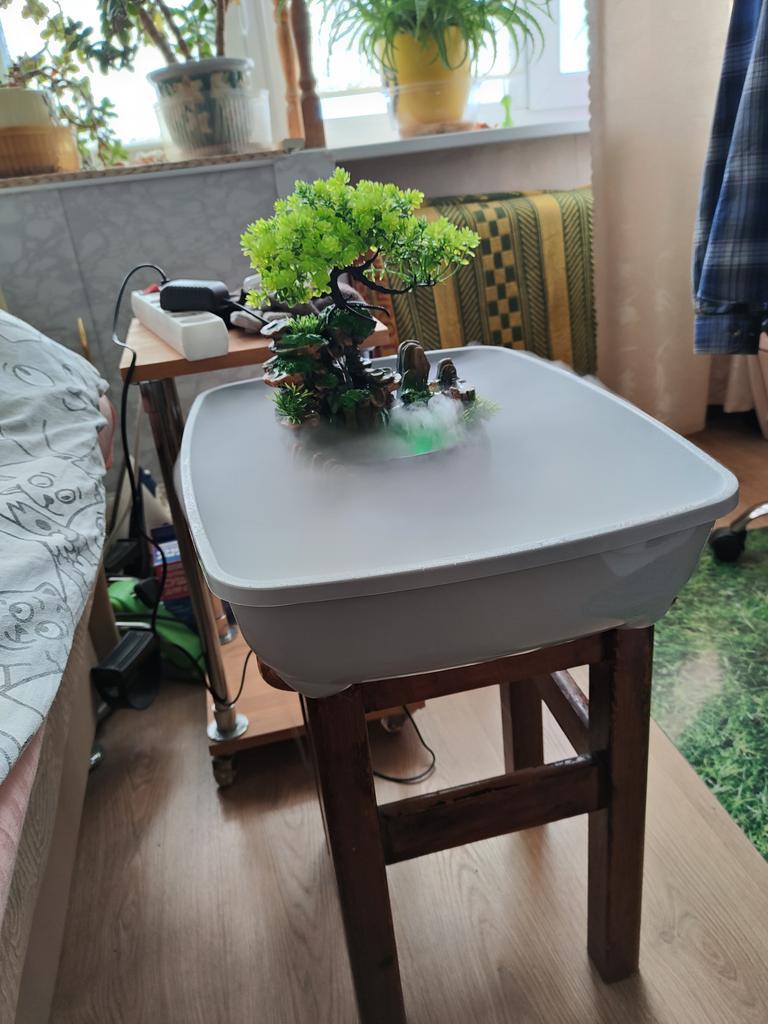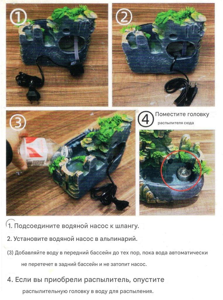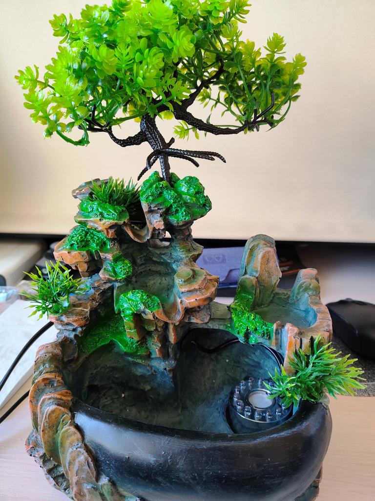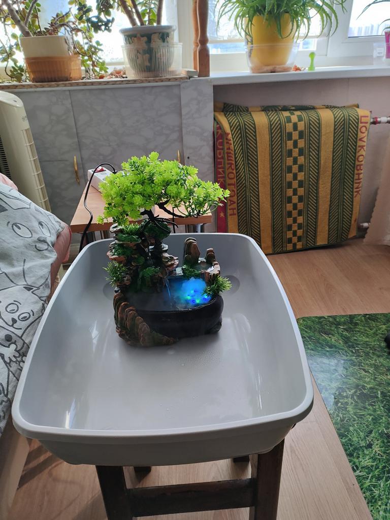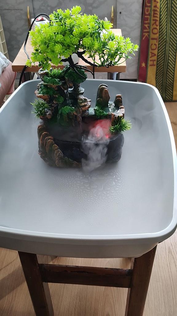 I assembled the fountain, but it's unclear how to insert the tree into the upper part. The hole is small, and the tree's root is large.... Had to cut off the little tail, wrap the root with electrical tape, and insert it into the hole. To prevent the spread of moisture, which pools around, it is advisable to use an animal tray with a high rim. A kitchen tray will not work here. I unexpectedly noticed that in the absence of a draft, a completely fantastic cold sauna effect is achieved. An excellent fountain for the home and relaxation!