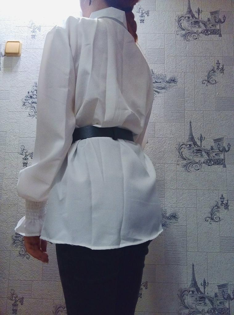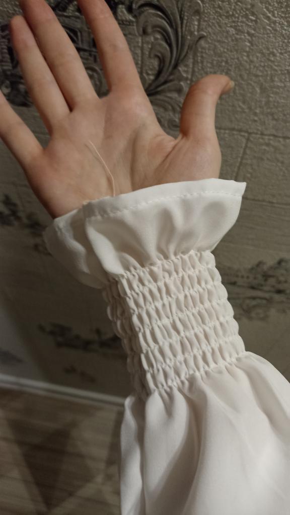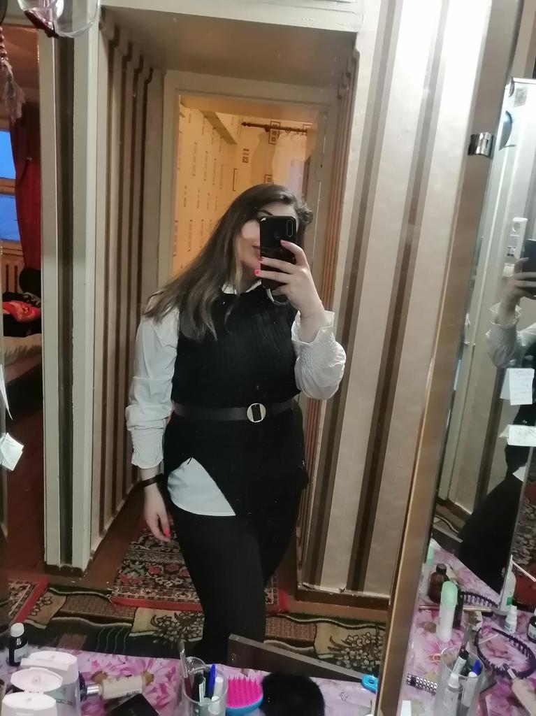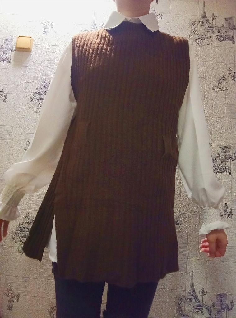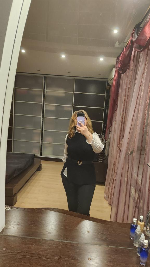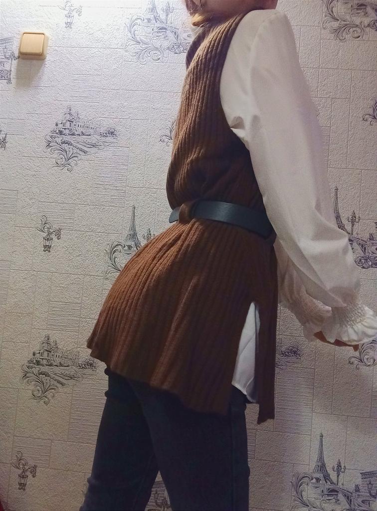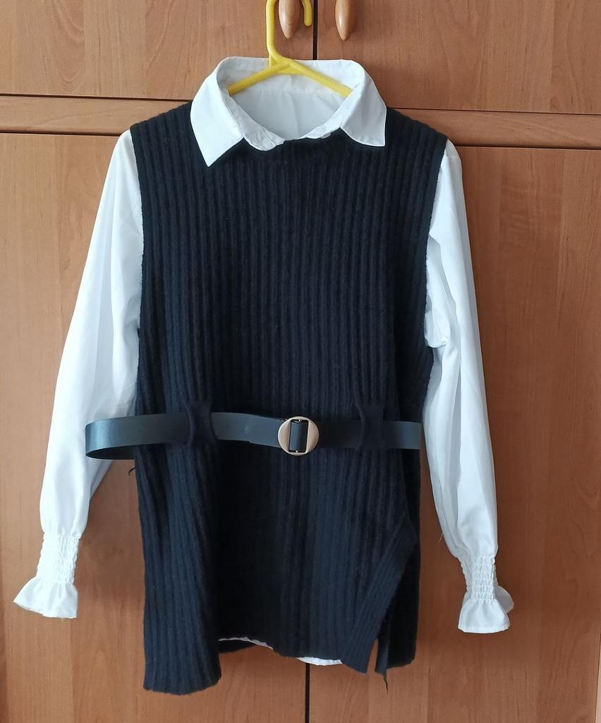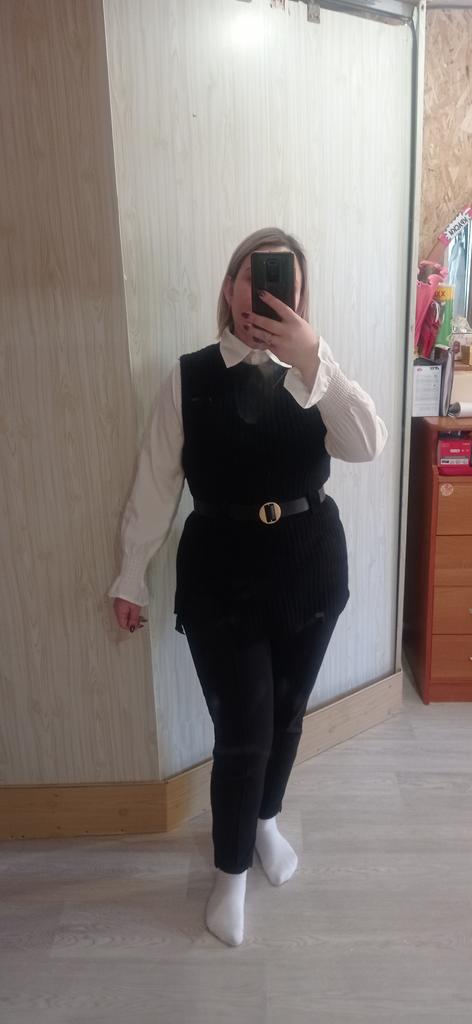 The blouse does not shine through, it fits perfectly, it wrinkles very much, but it steams well. The vest is pleasant to the touch, soft, fits well on the blouse. Belt included.