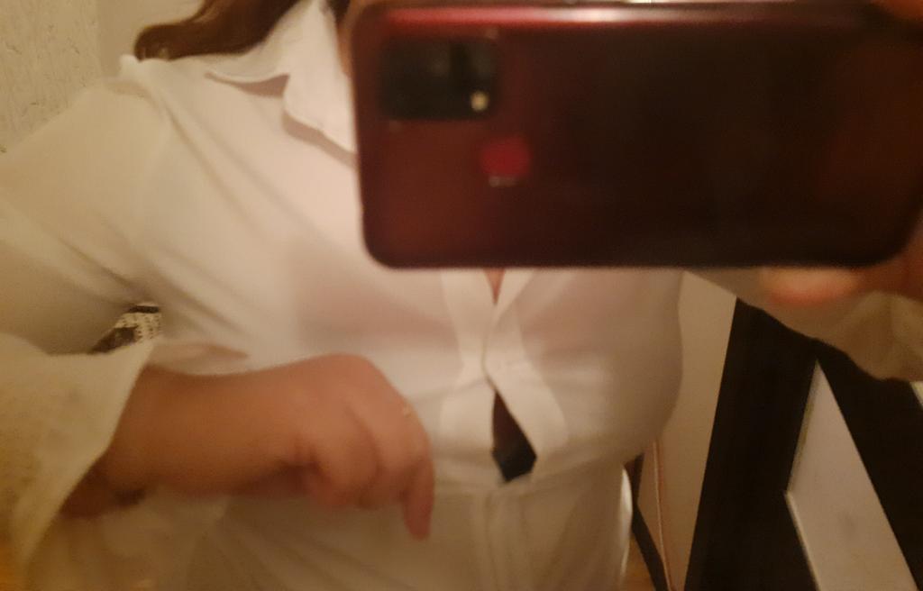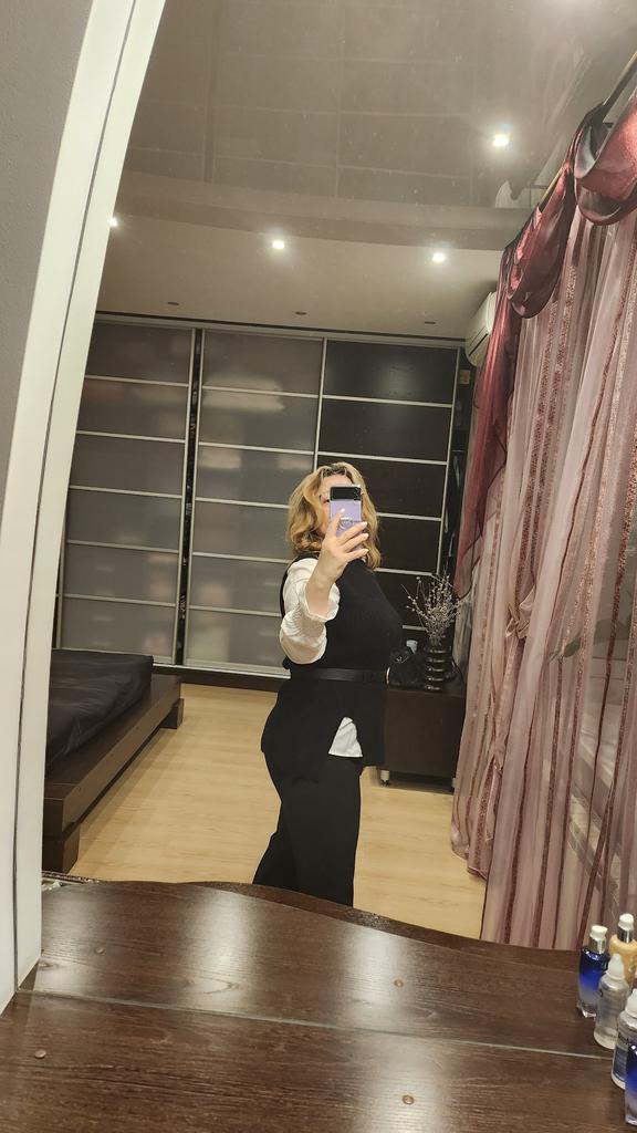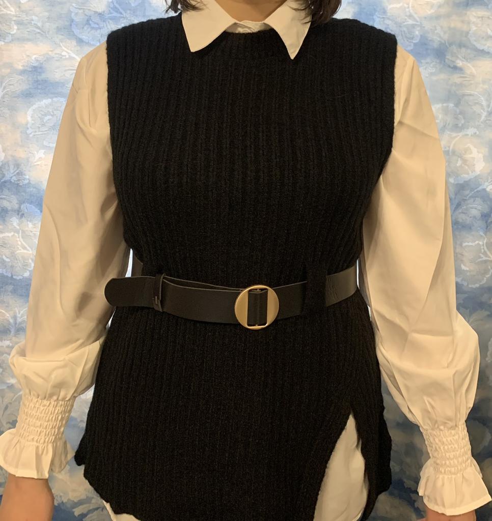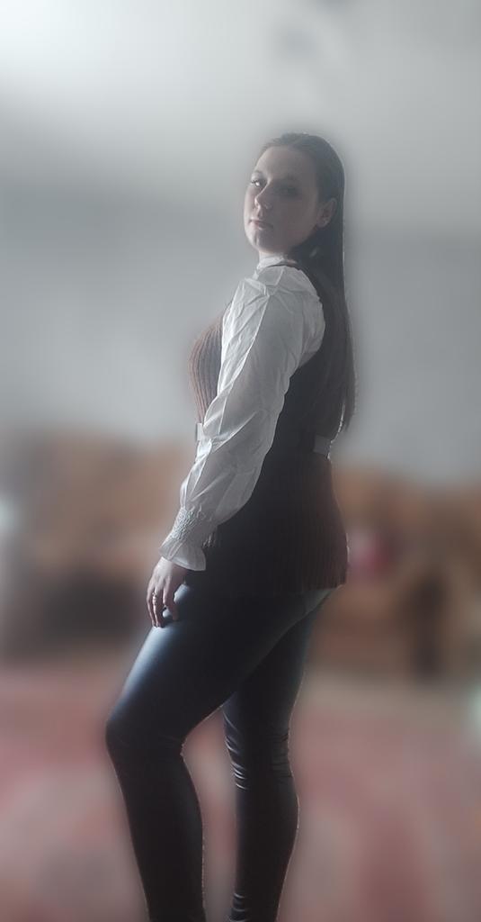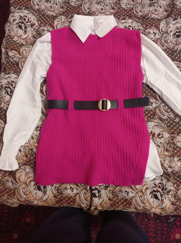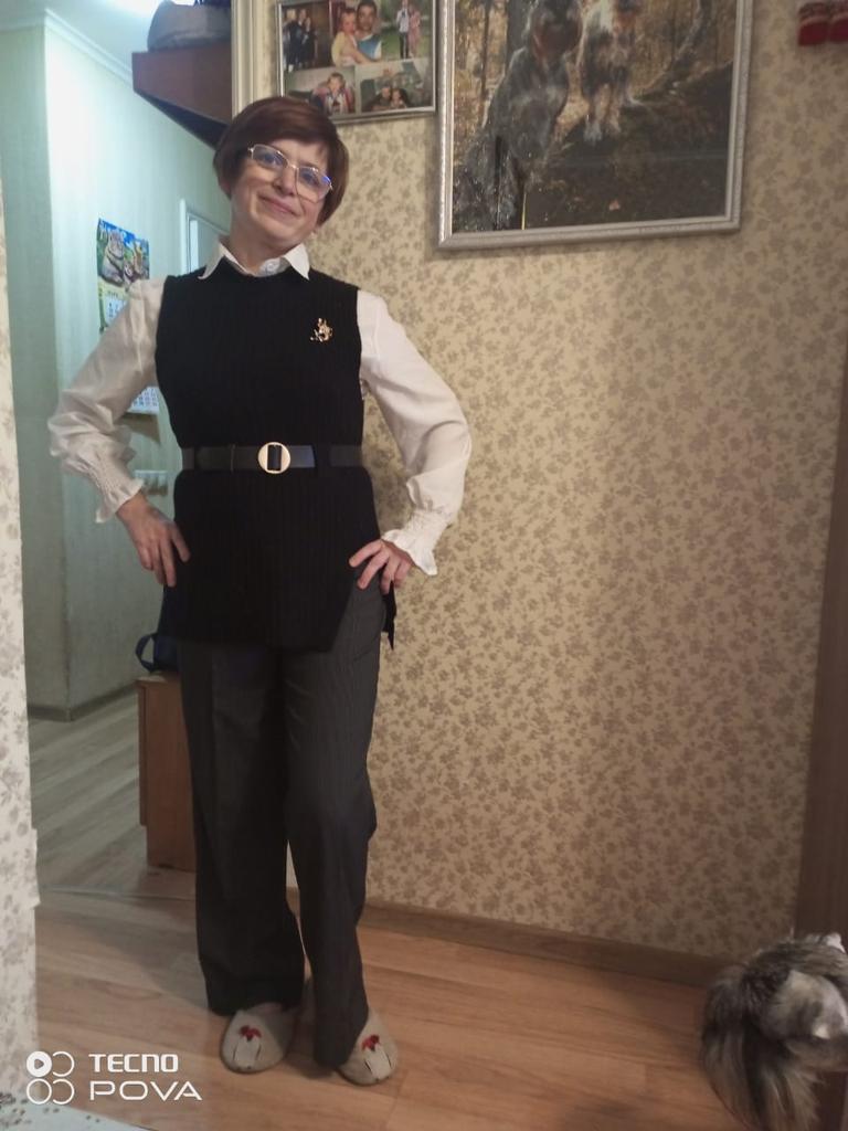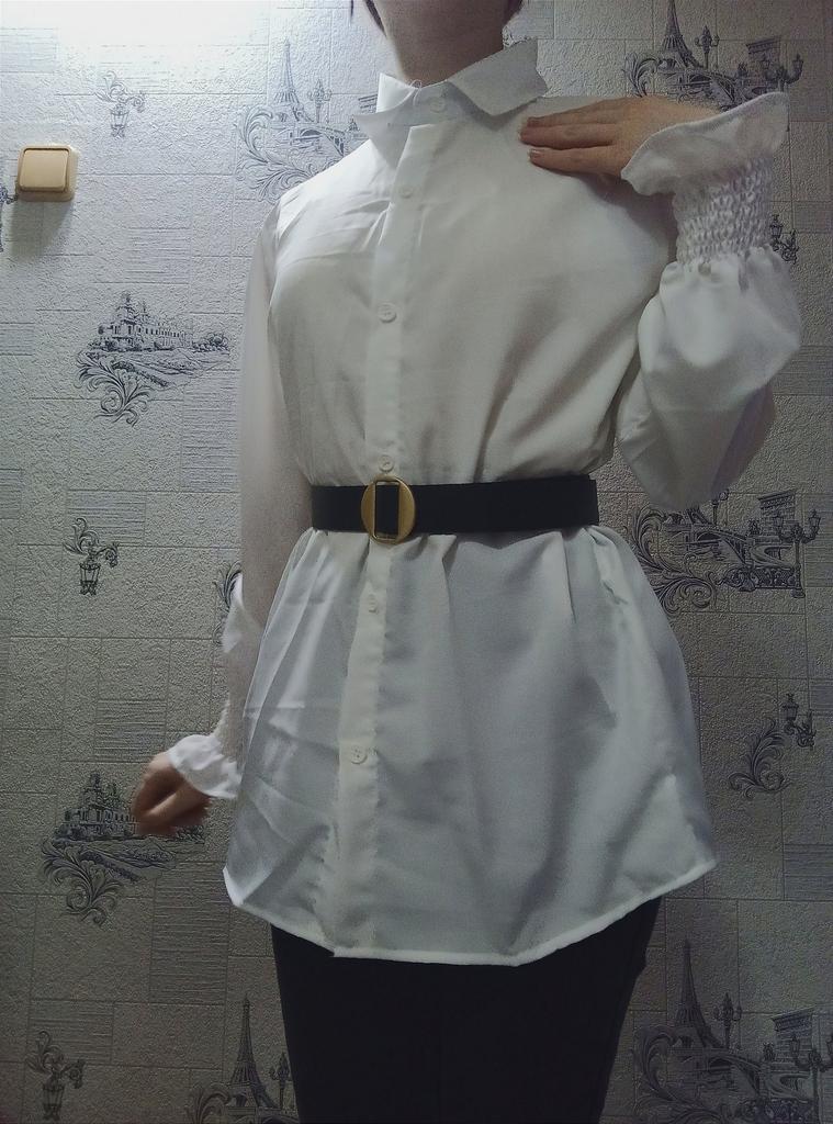The blouse does not shine through, it fits perfectly, it wrinkles very much, but it steams well. The vest is pleasant to the touch, soft, fits well on the blouse. Belt included.