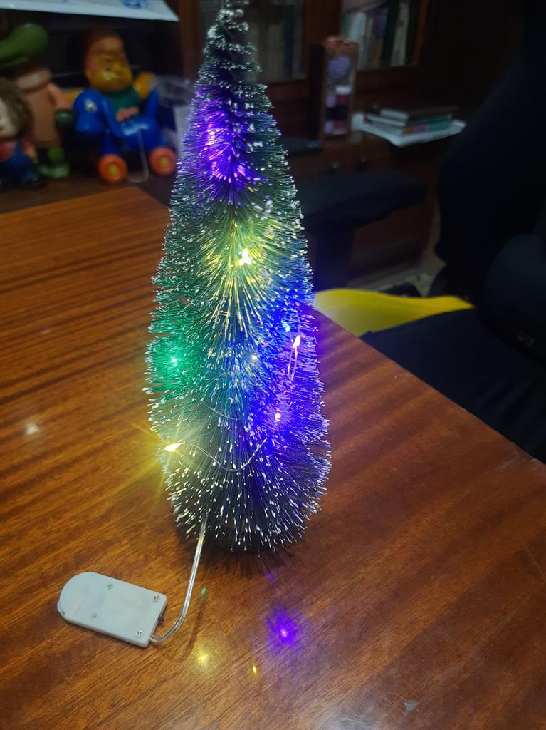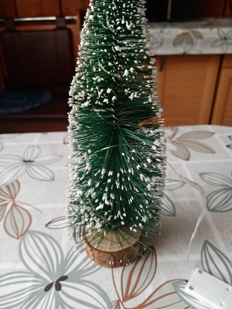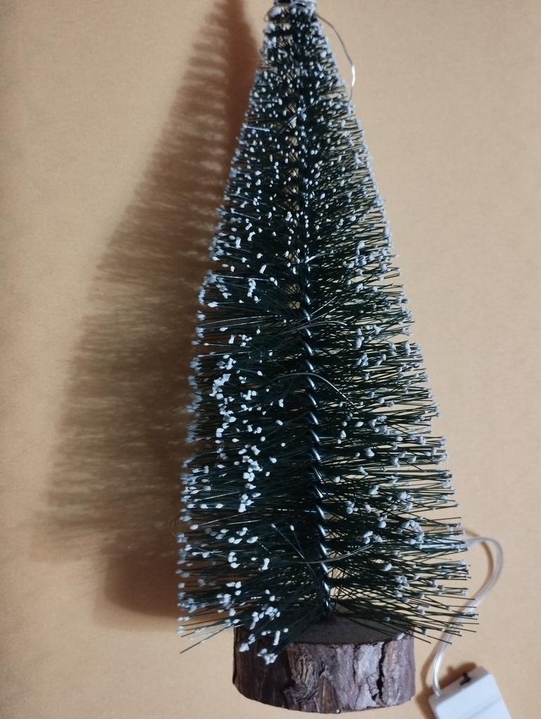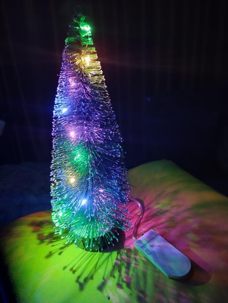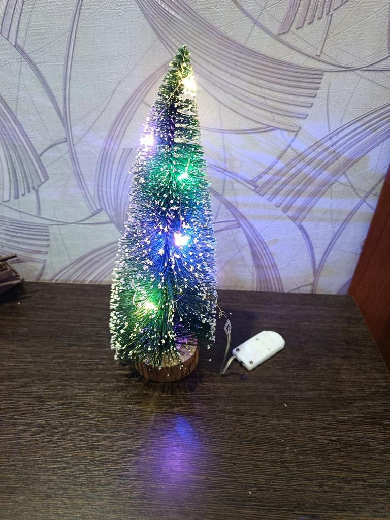 Beautiful little tree on a flexible stem. A string of small colored lights with battery is offered to decorate the tree. Beautiful Christmas decoration.