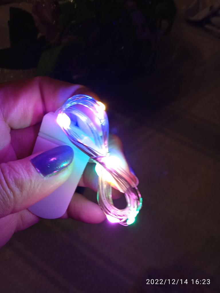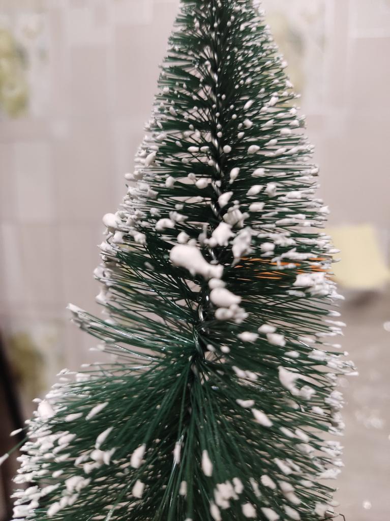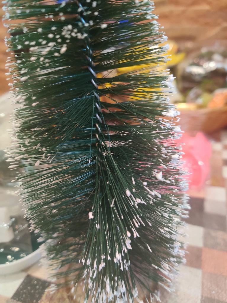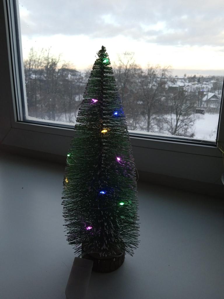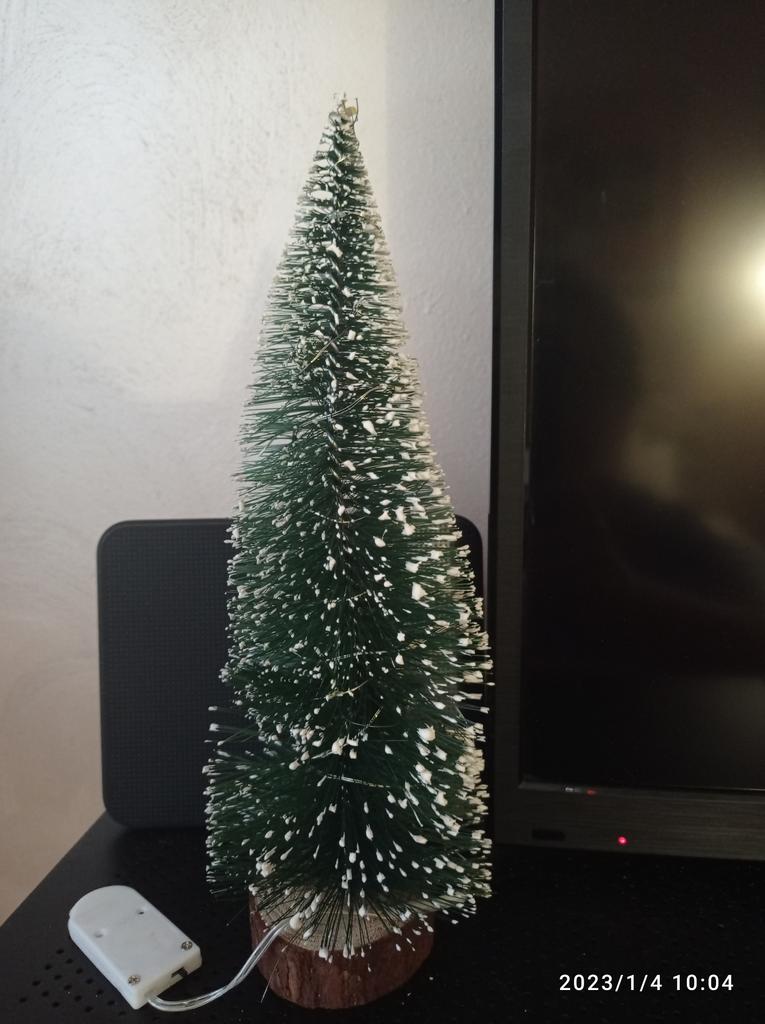 Beautiful little tree on a flexible stem. A string of small colored lights with battery is offered to decorate the tree. Beautiful Christmas decoration.