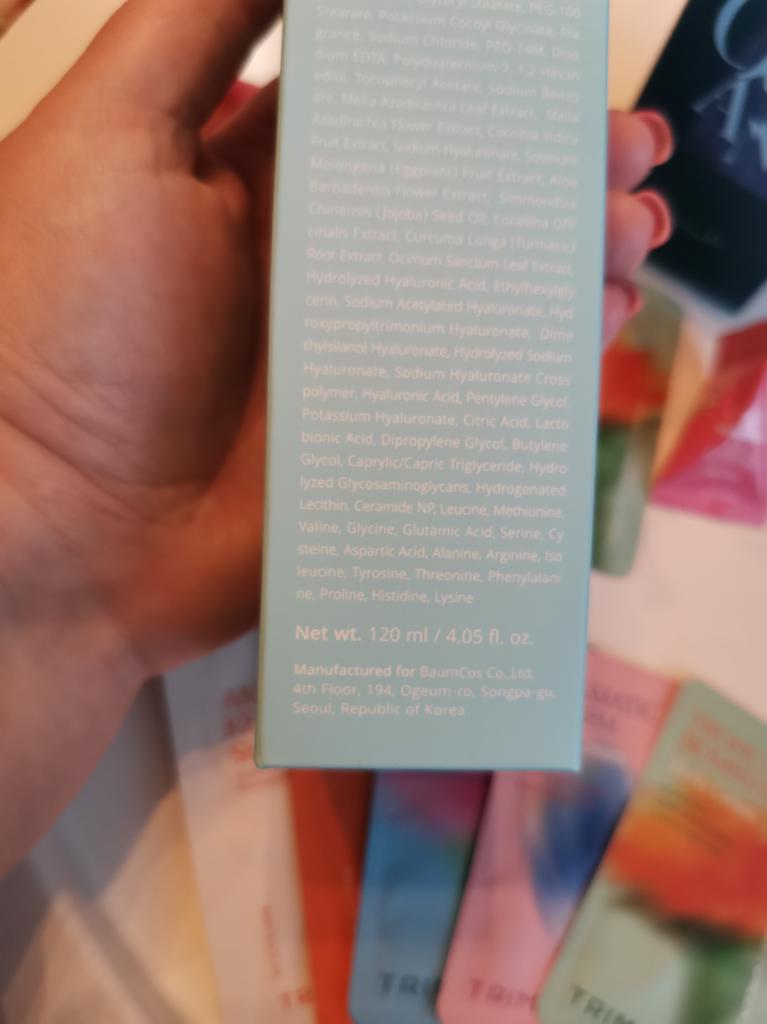 Ingredients: Water, Palmitic Acid, Stearic Acid, Lauric Acid, Glycerin, Myristic Acid, Potassium Hydroxide, PEG-90, Cocamidopropyl Betaine, Glyceryl Stearate, PEG-100 Stearate, Potassium Cocoyl Glycinate, Fragrance, Sodium Chloride, PEG-14M, Disodium EDTA, Polyquaternium-7, 1,2-Hexanediol, Tocopheryl Acetate, Sodium Benzoate, Melia Azadirachta Leaf Extract, Melia Azadirachta Flower Extract, Coccinia Indica Fruit Extract, Sodium Hyaluronate, Solanum Melongena (Eggplant) Fruit Extract, Aloe Barbadensis Flower Extract, Simmondsia Chinensis (Jojoba) Seed Oil, Corallina Officinalis Extract, Curcuma Longa (Turmeric) Root Extract, Ocimum Sanctum Leaf Extract, Hydrolyzed Hyaluronic Acid, Ethylhexylglycerin, Sodium Acetylated Hyaluronate, Hydroxypropyltrimonium Hyaluronate, Dimethylsilanol Hyaluronate, Hydrolyzed Sodium Hyaluronate, Sodium Hyaluronate Crosspolymer, Hyaluronic Acid, Pentylene Glycol, Potassium Hyaluronate, Citric Acid, Lactobionic Acid, Dipropylene Glycol, Butylene Glycol, Caprylic/Capric Triglyceride, Hydrolyzed Glycosaminoglycans, Hydrogenated Lecithin, Ceramide NP, Leucine, Methionine, Valine, Glycine, Glutamic Acid, Serine, Cysteine, Aspartic Acid, Alanine, Arginine, Isoleucine, Tyrosine, Threonine, Phenylalanine, Proline, Histidine, Lysine