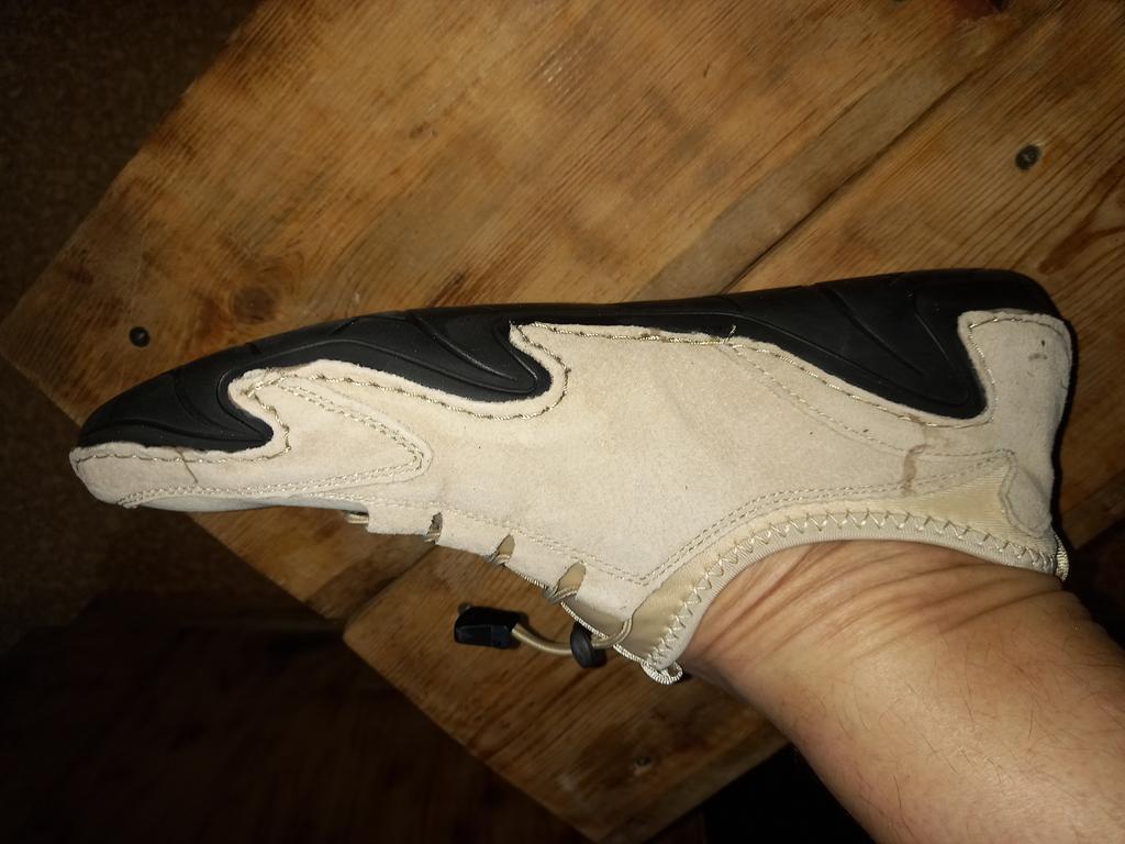 The goods arrived, the size was 44 for my 43, in length with a margin, but a little narrow. Among the disadvantages: there is a part of the rubber sole inside near the big toe, it smears the socks