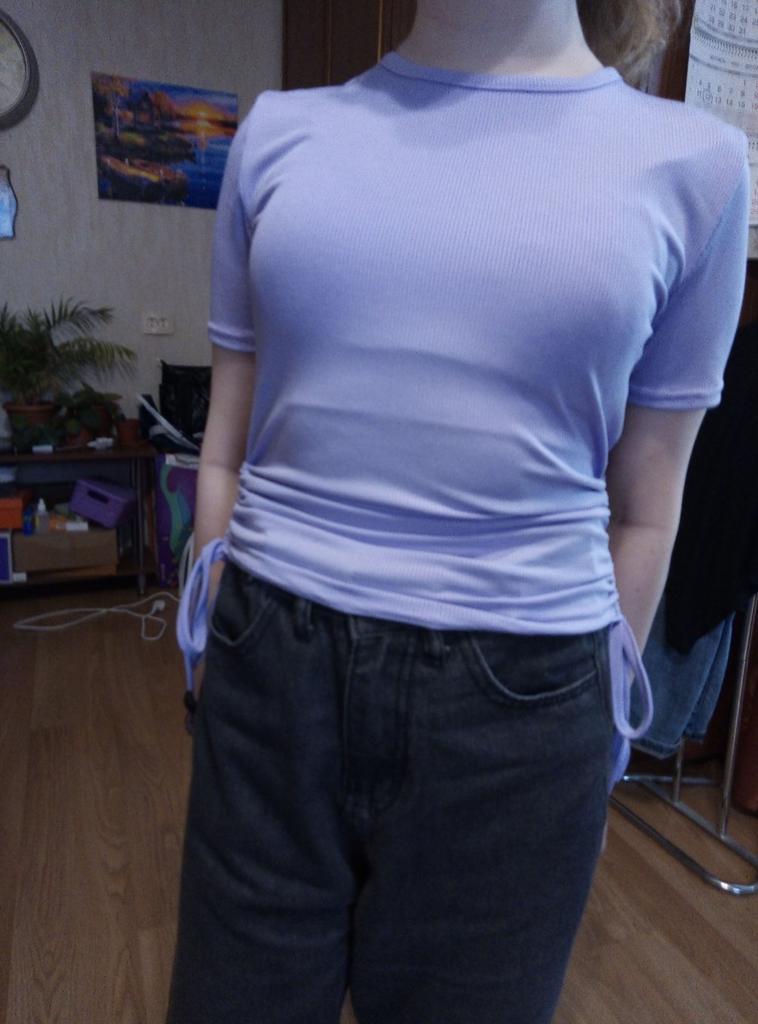 The T-shirt is synthetic, not cotton, as in the description, slippery fabric. There is a visible seam on the front of the neck. A long puff from the very front. After the appeal, they returned 60% of the cost.