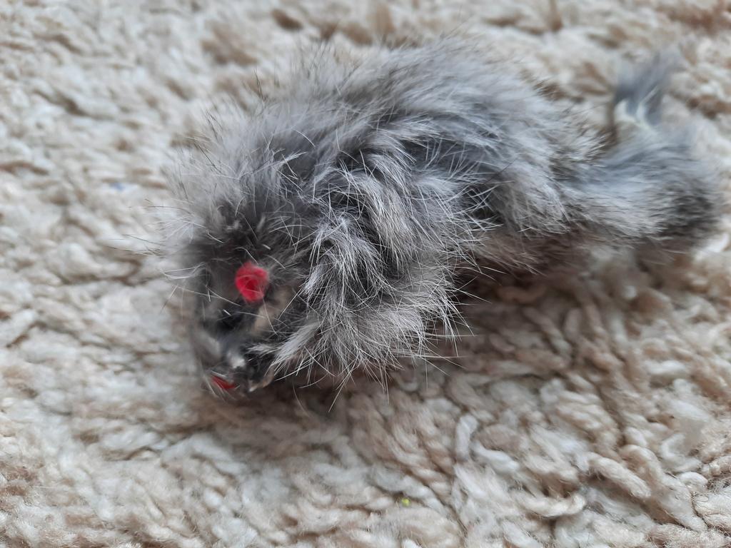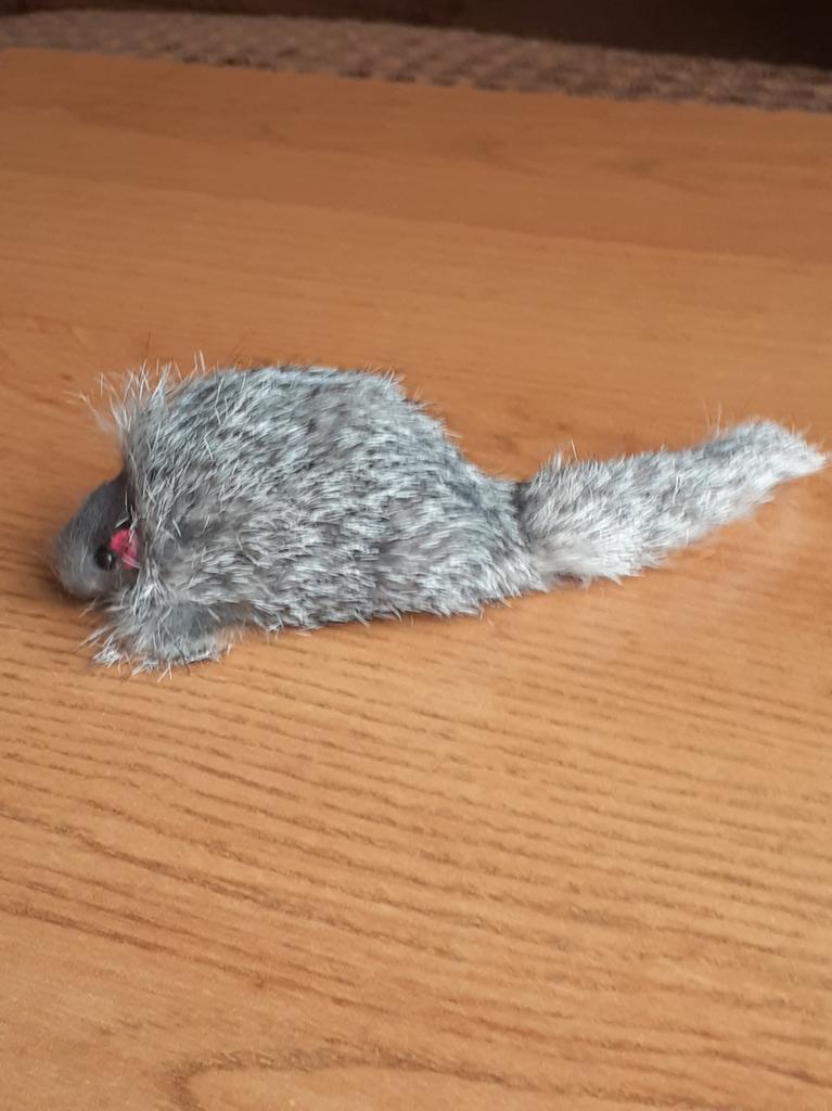 The cat likes mice of all colors, she catches them with pleasure, even jumping, and then plays with them herself, chasing them around the room.