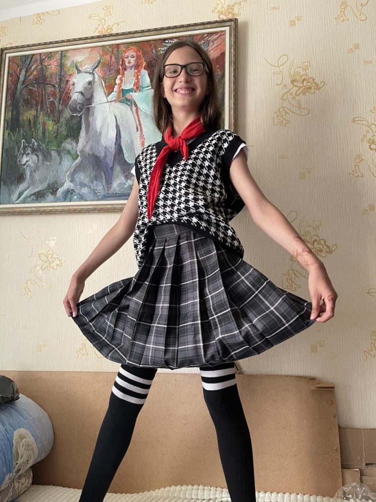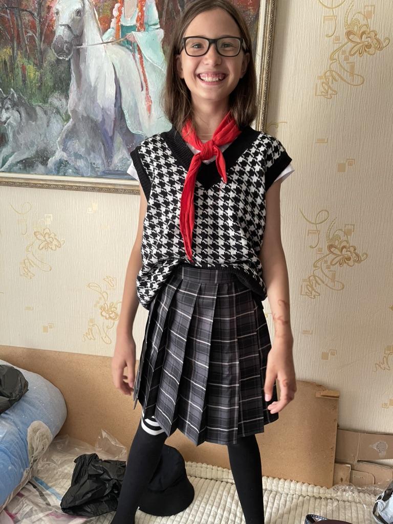 I took a child of 12 years old, she sits not badly with a white blouse. The quality is good, the threads do not stick out.