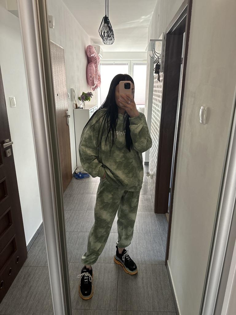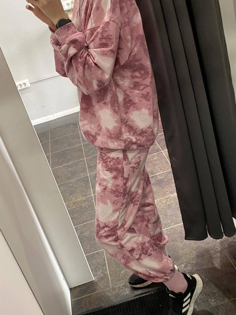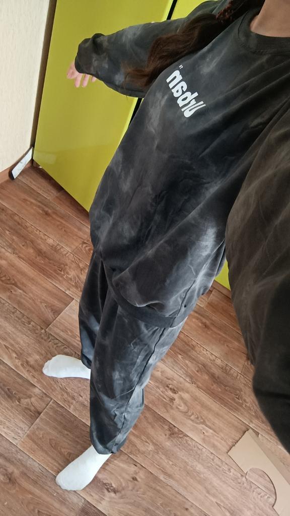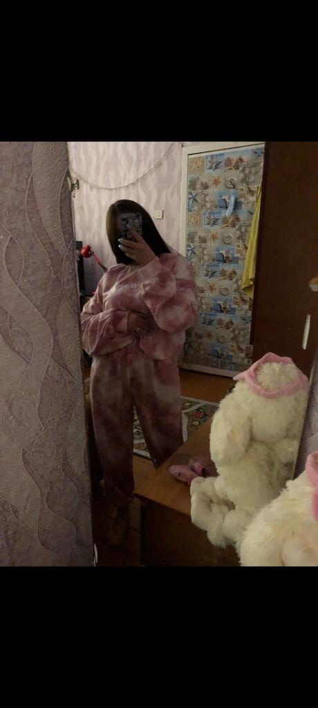 This suit is super stylish)) there is a voluminous jacket and wide trousers. Like in the picture, pink. The fabric is nice.