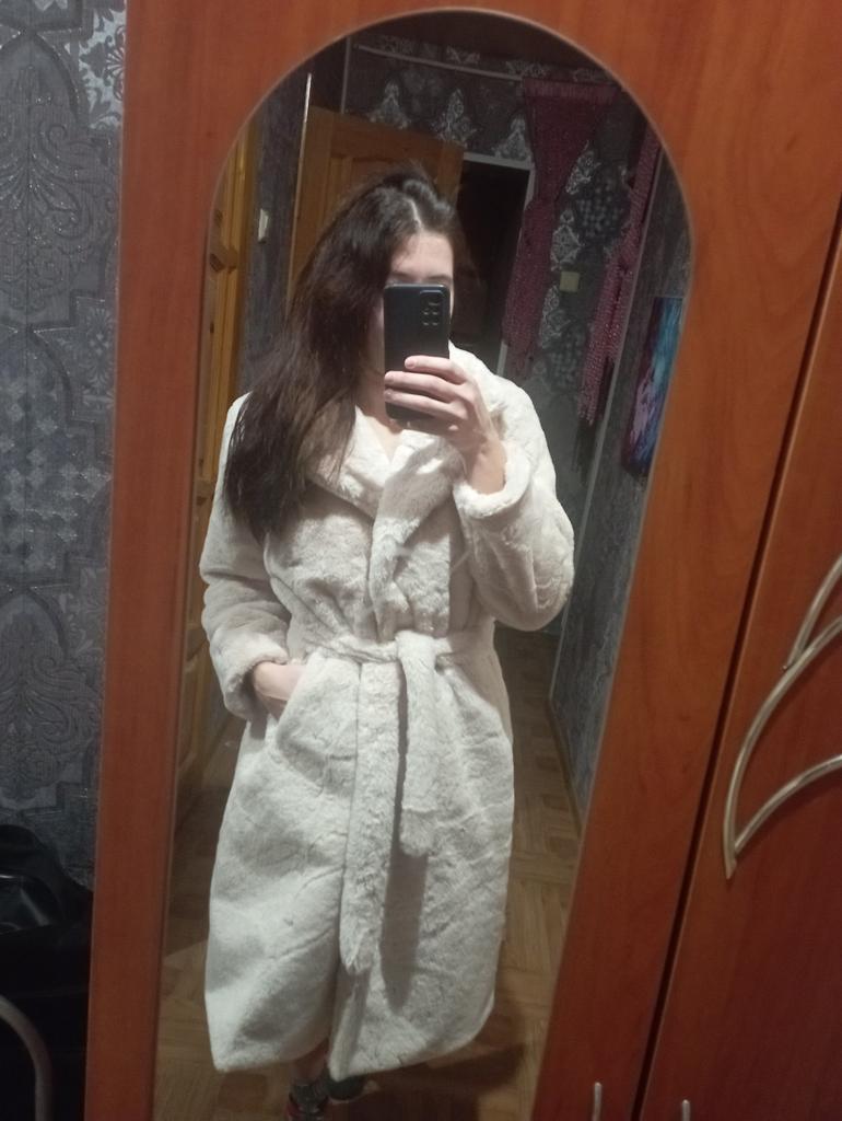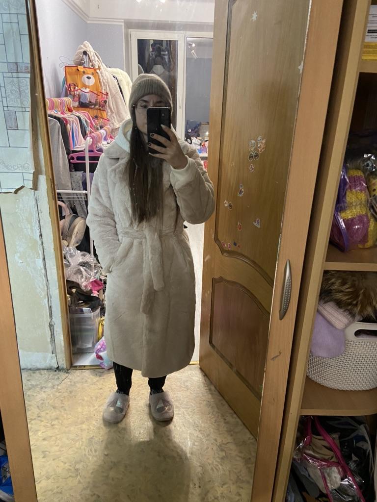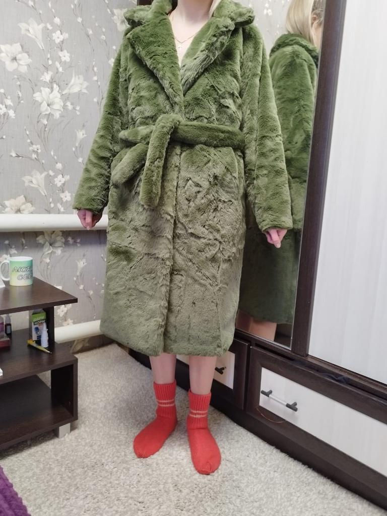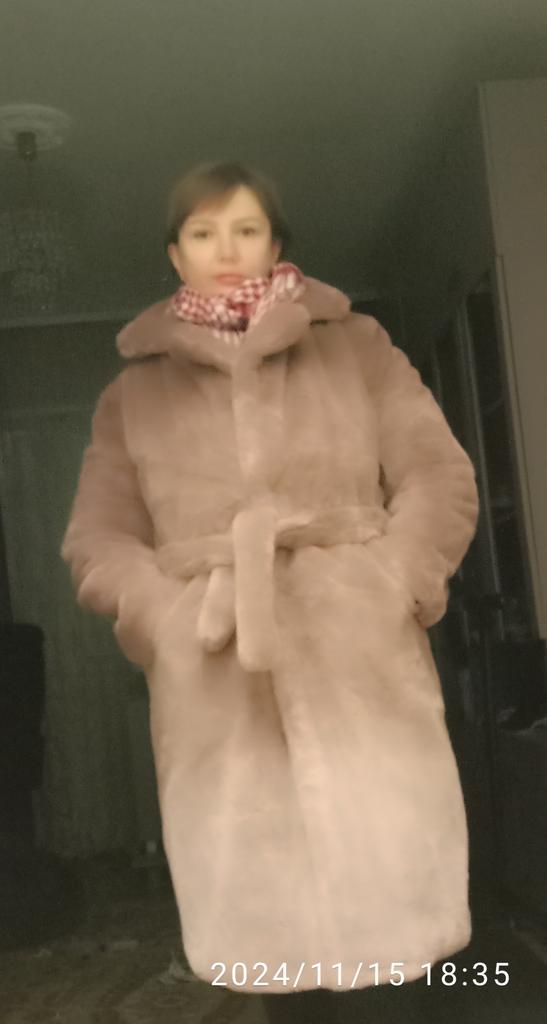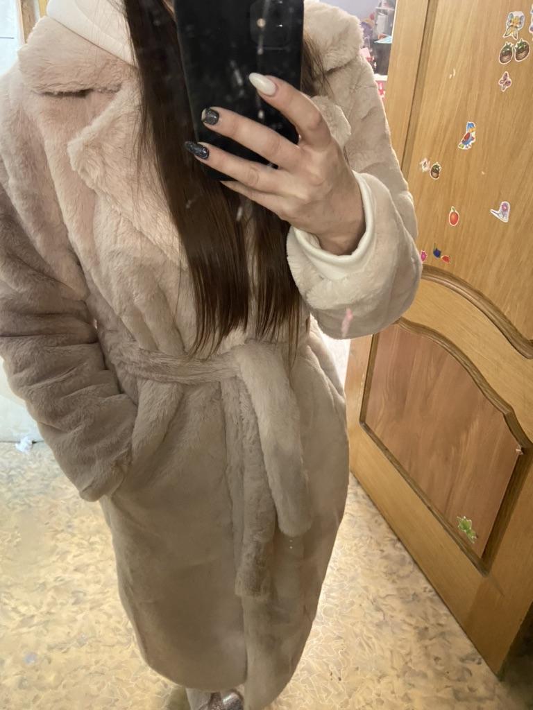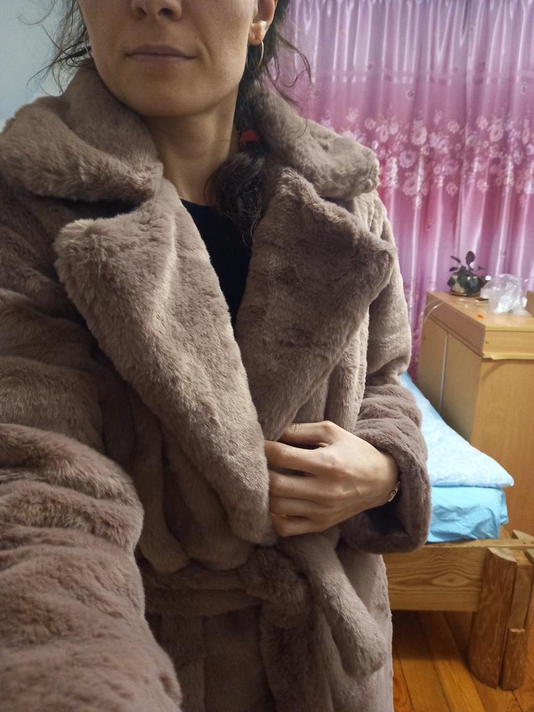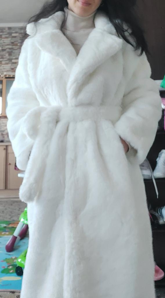 Not a fur coat, but a beauty!!! There are buttons, there is a belt, pockets Long, your legs will be warm Very pleasant to the touch Although light, but very warm