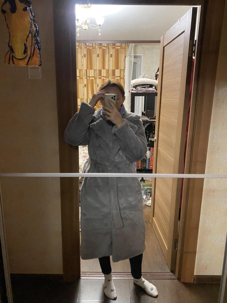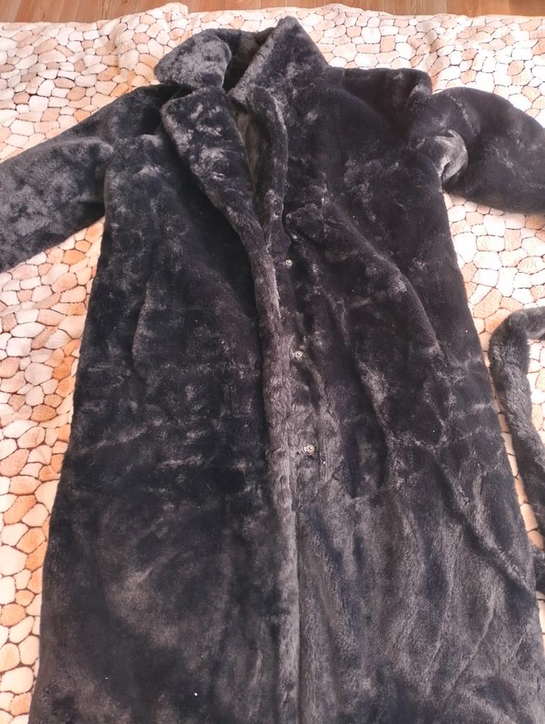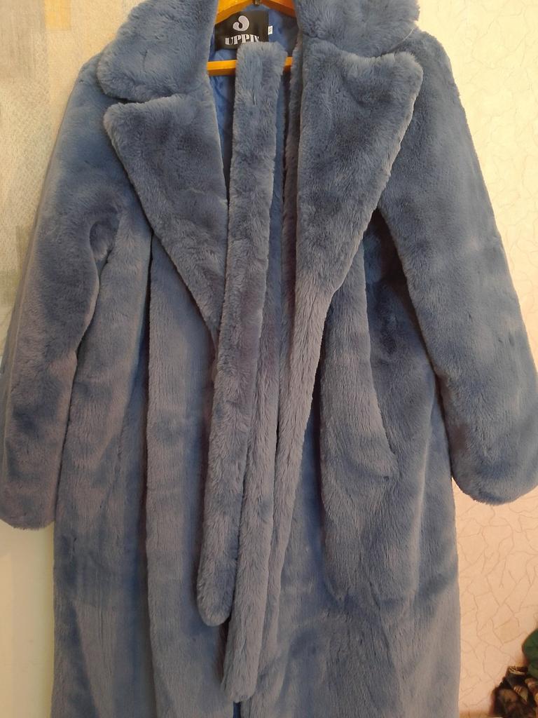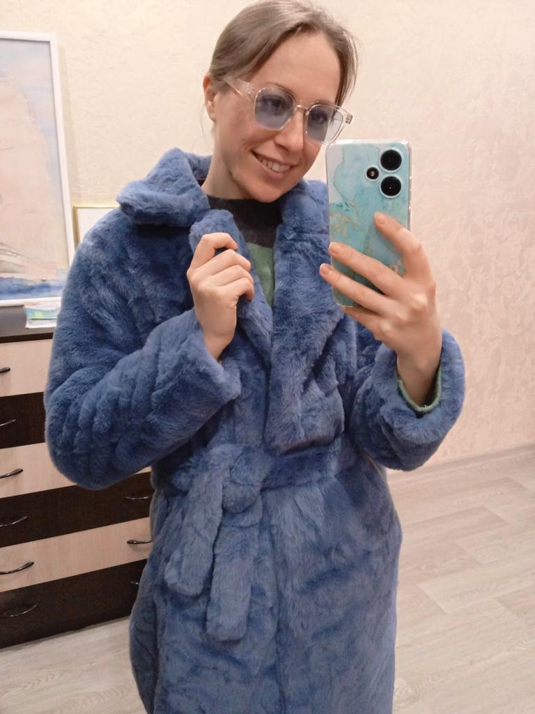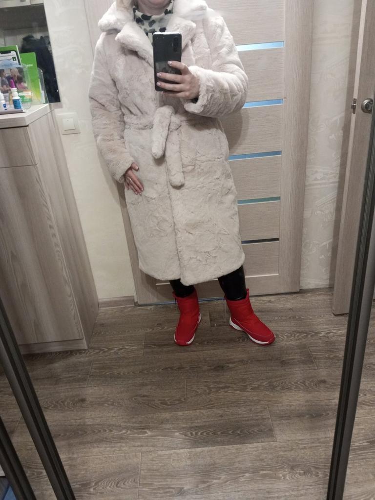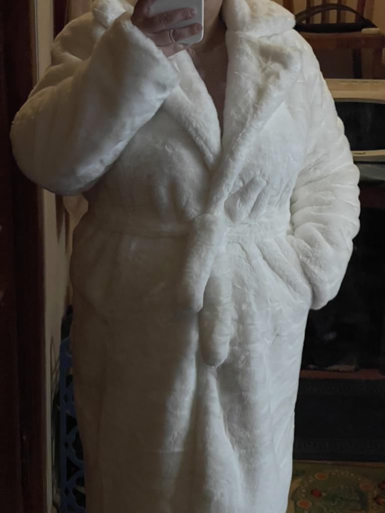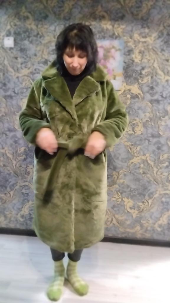 Not a fur coat, but a beauty!!! There are buttons, there is a belt, pockets Long, your legs will be warm Very pleasant to the touch Although light, but very warm