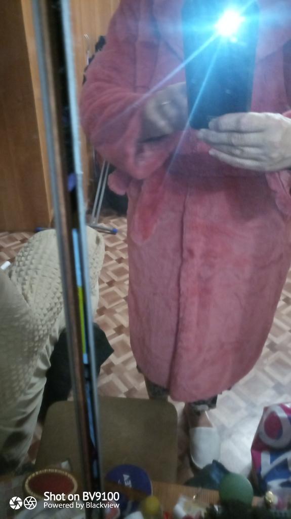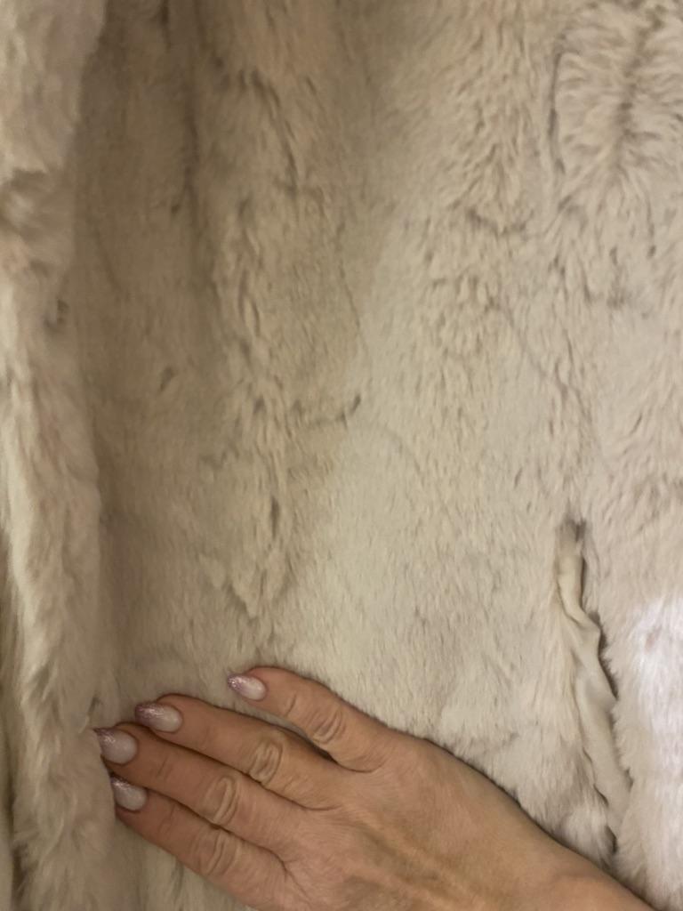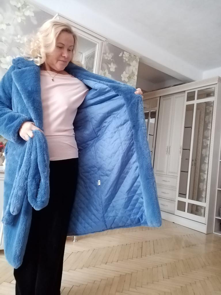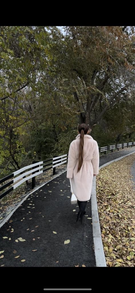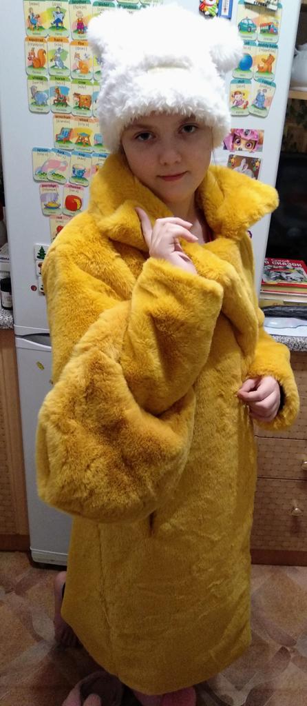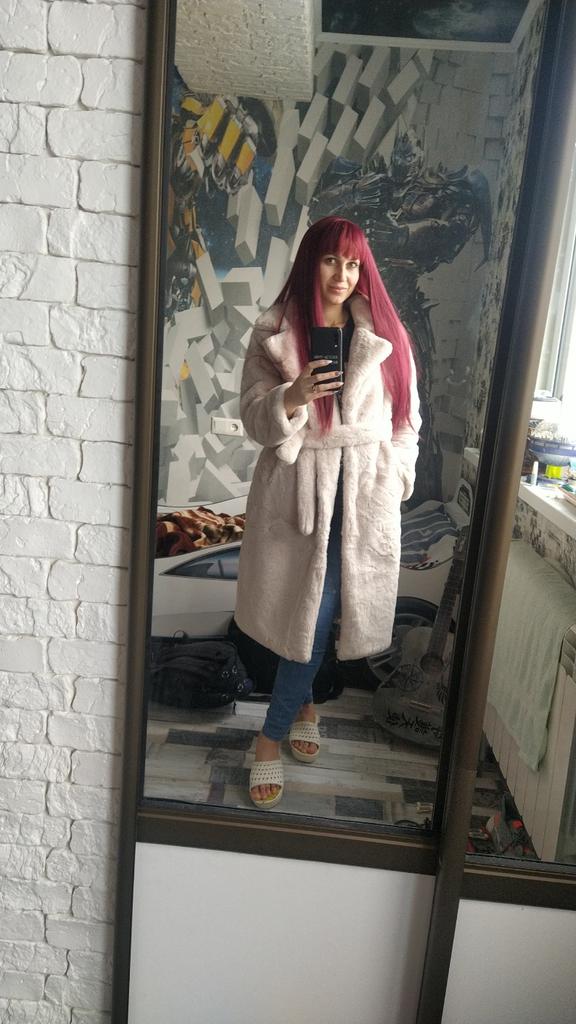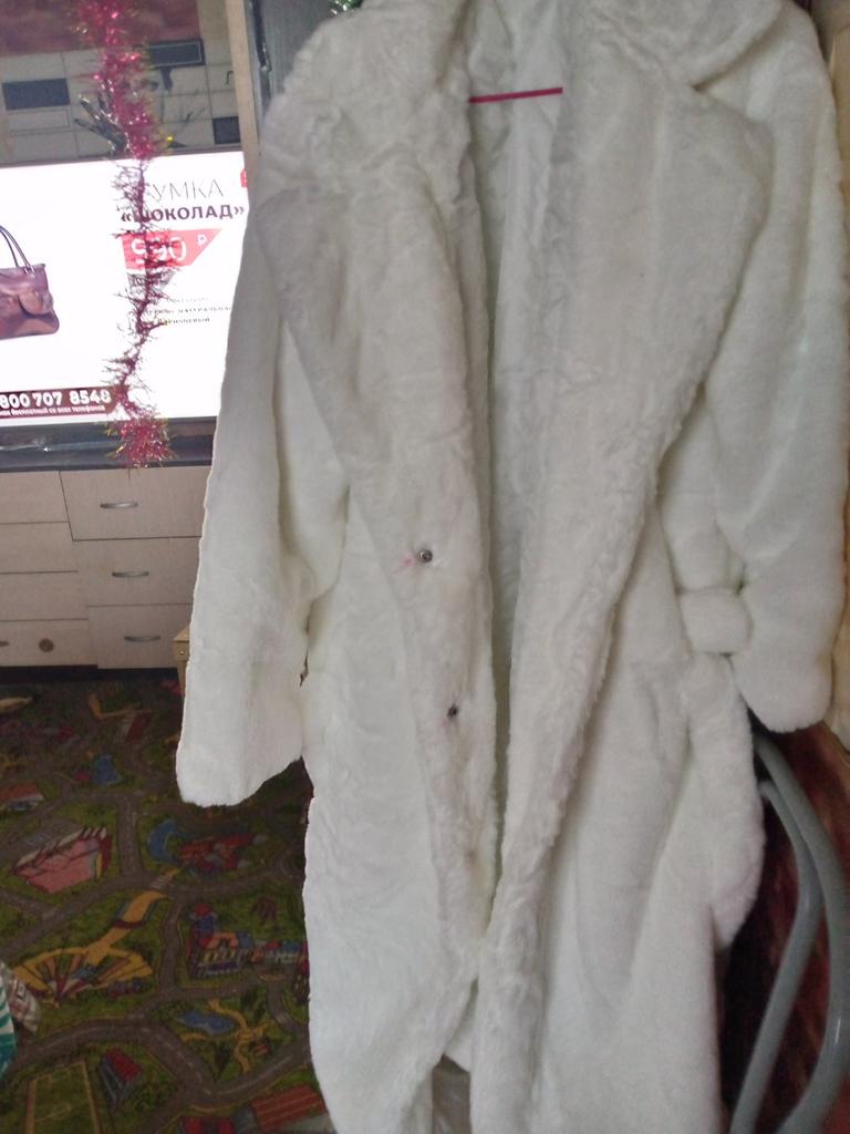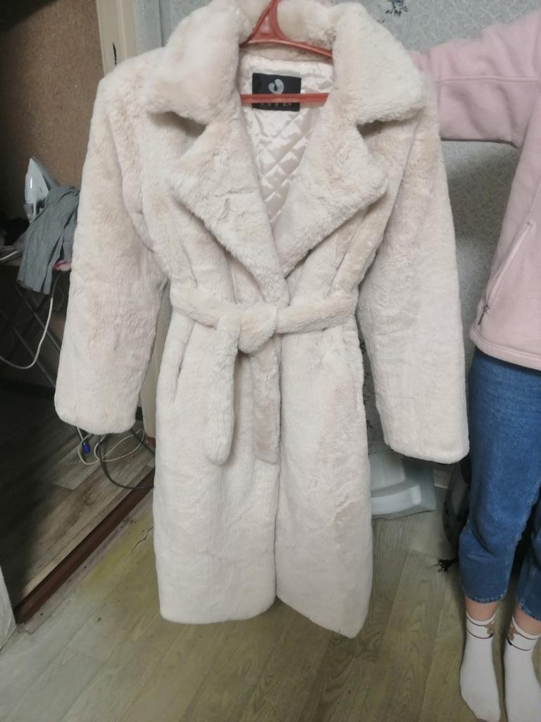 Not a fur coat, but a beauty!!! There are buttons, there is a belt, pockets Long, your legs will be warm Very pleasant to the touch Although light, but very warm