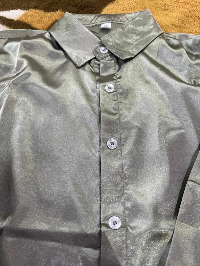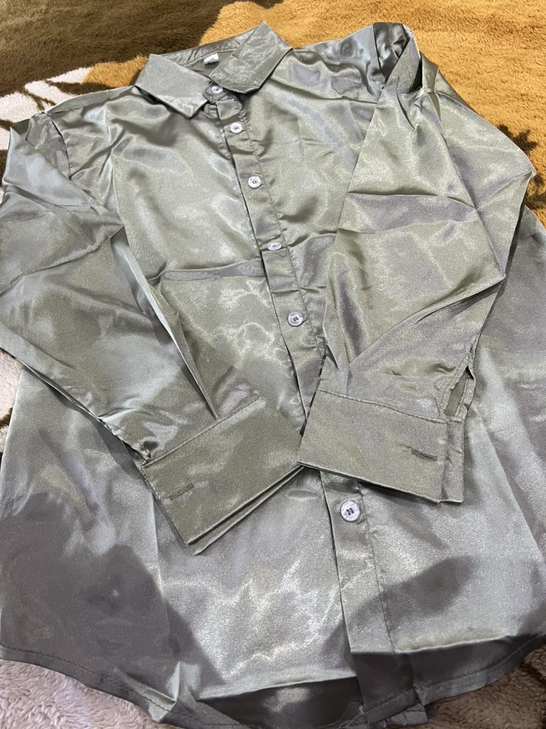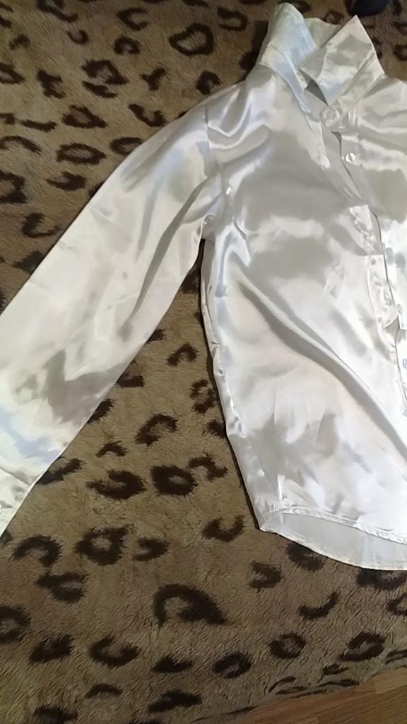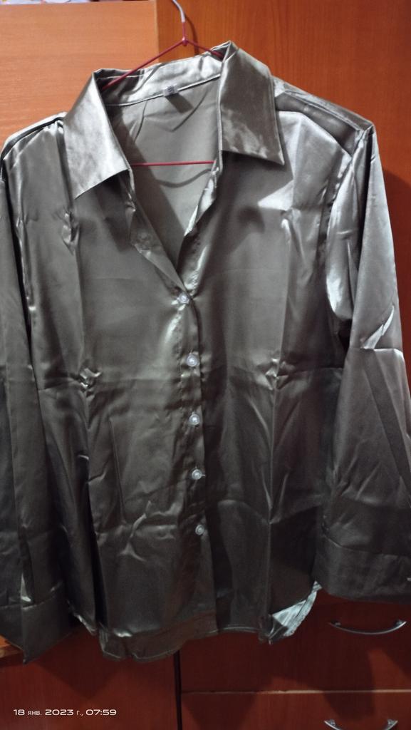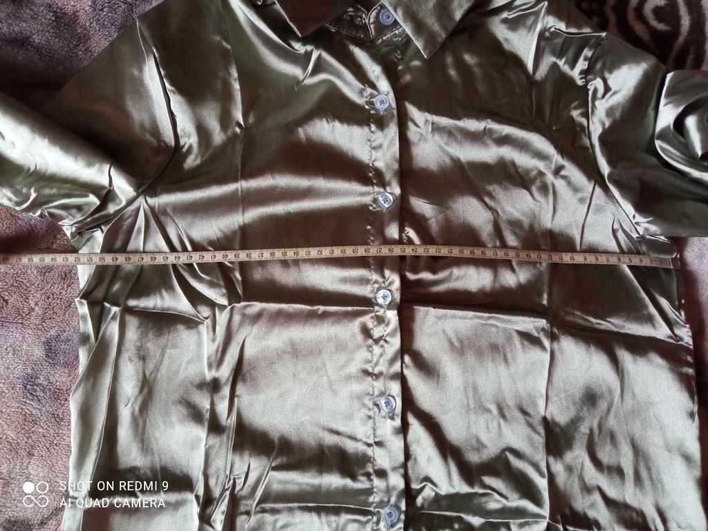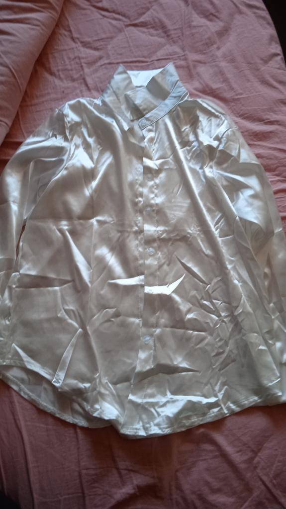 The shirt is satin, I didn’t measure it, it’s so pretty, but an ordinary shirt. It will look great with trousers or a skirt!
