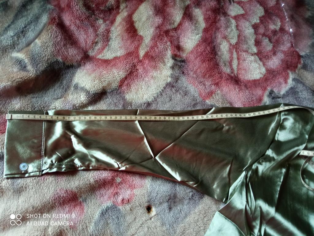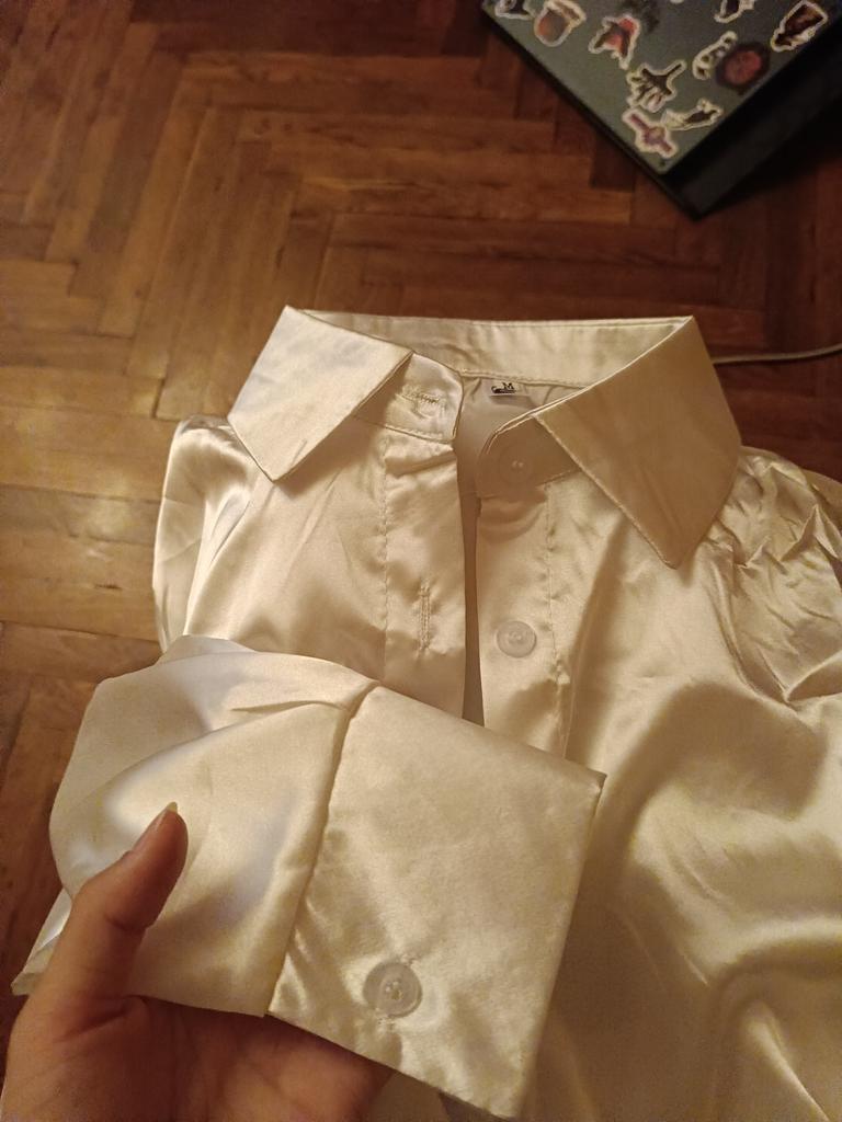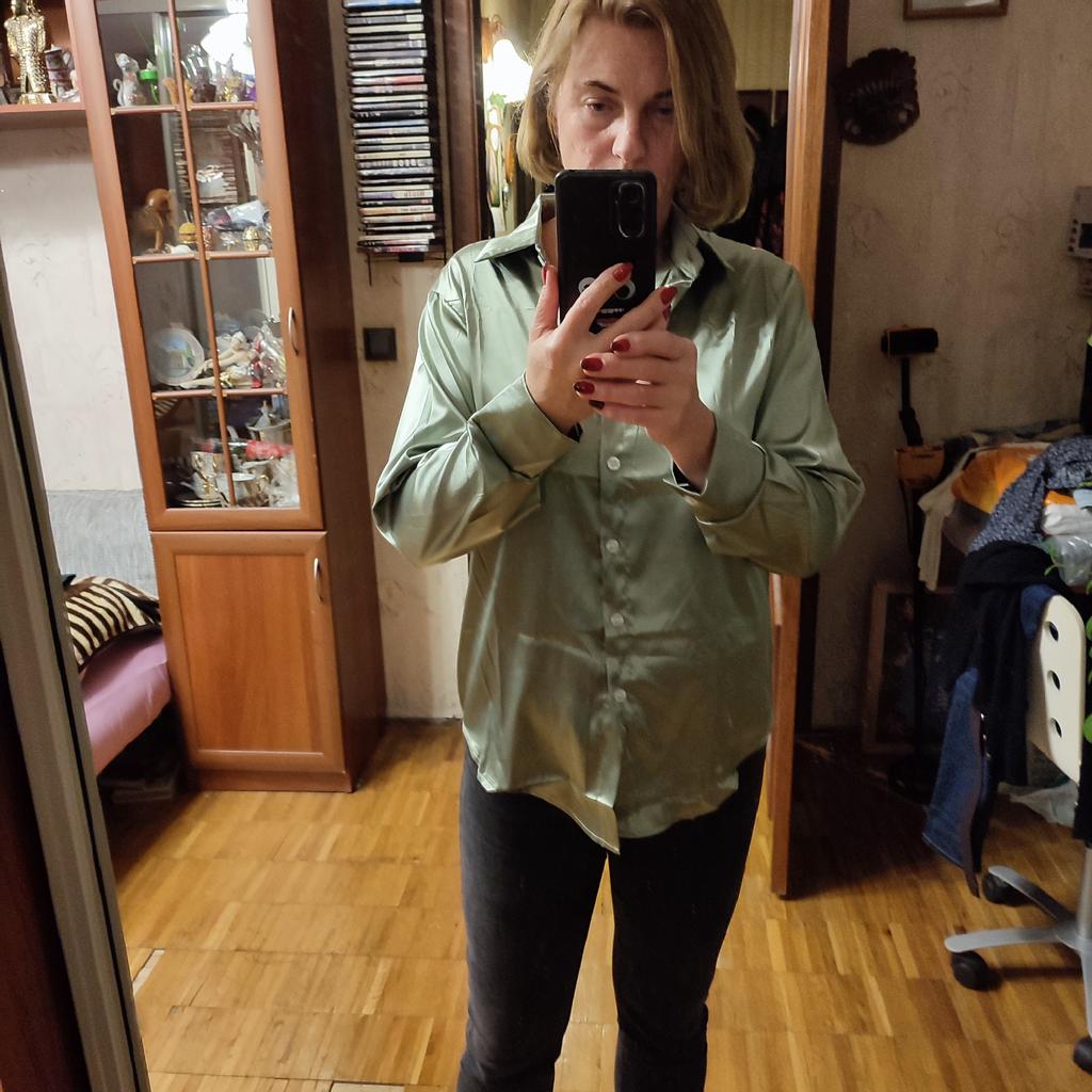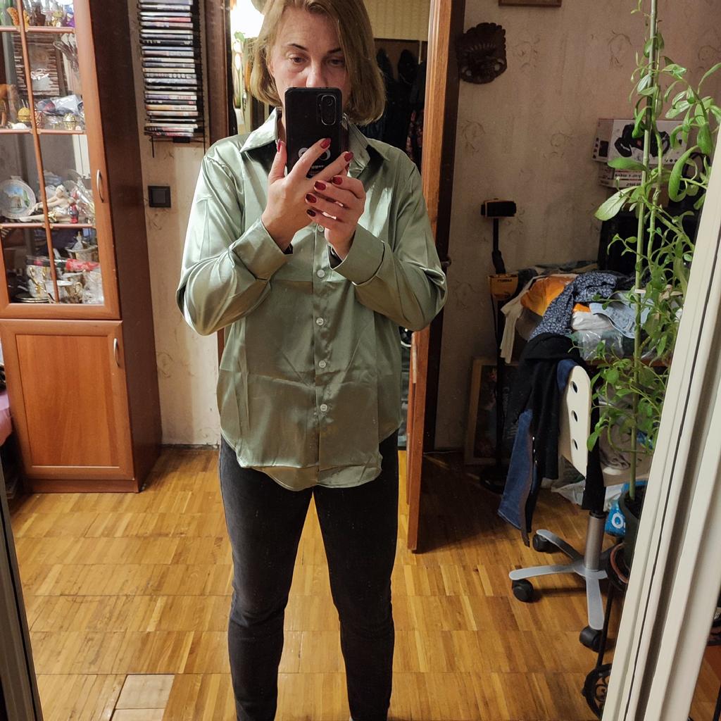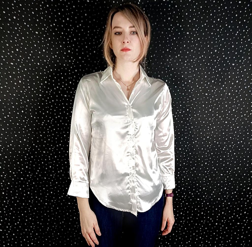 The shirt is satin, I didn’t measure it, it’s so pretty, but an ordinary shirt. It will look great with trousers or a skirt!