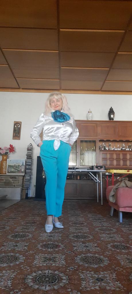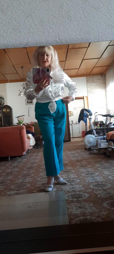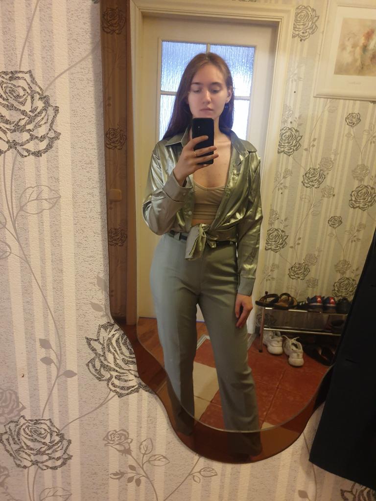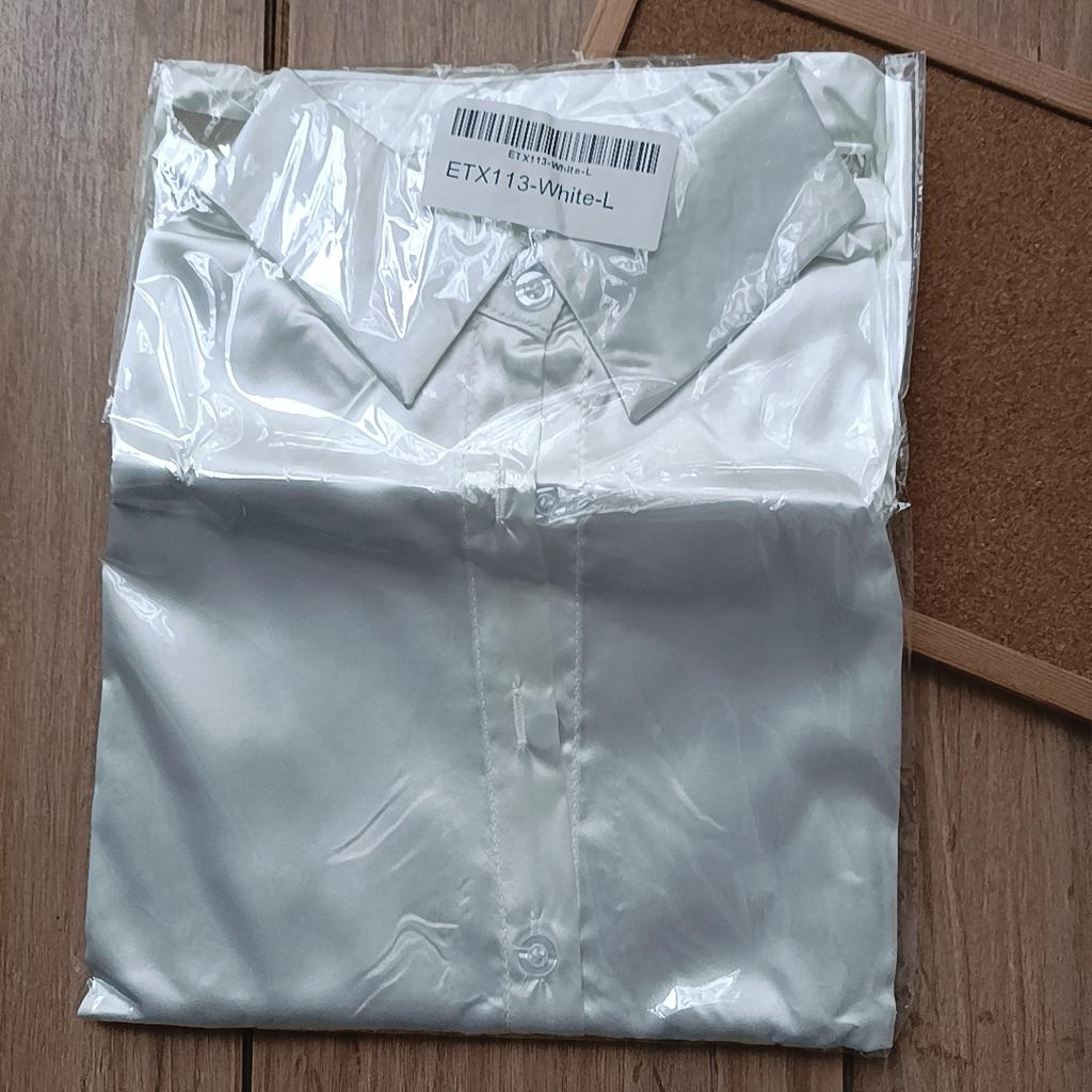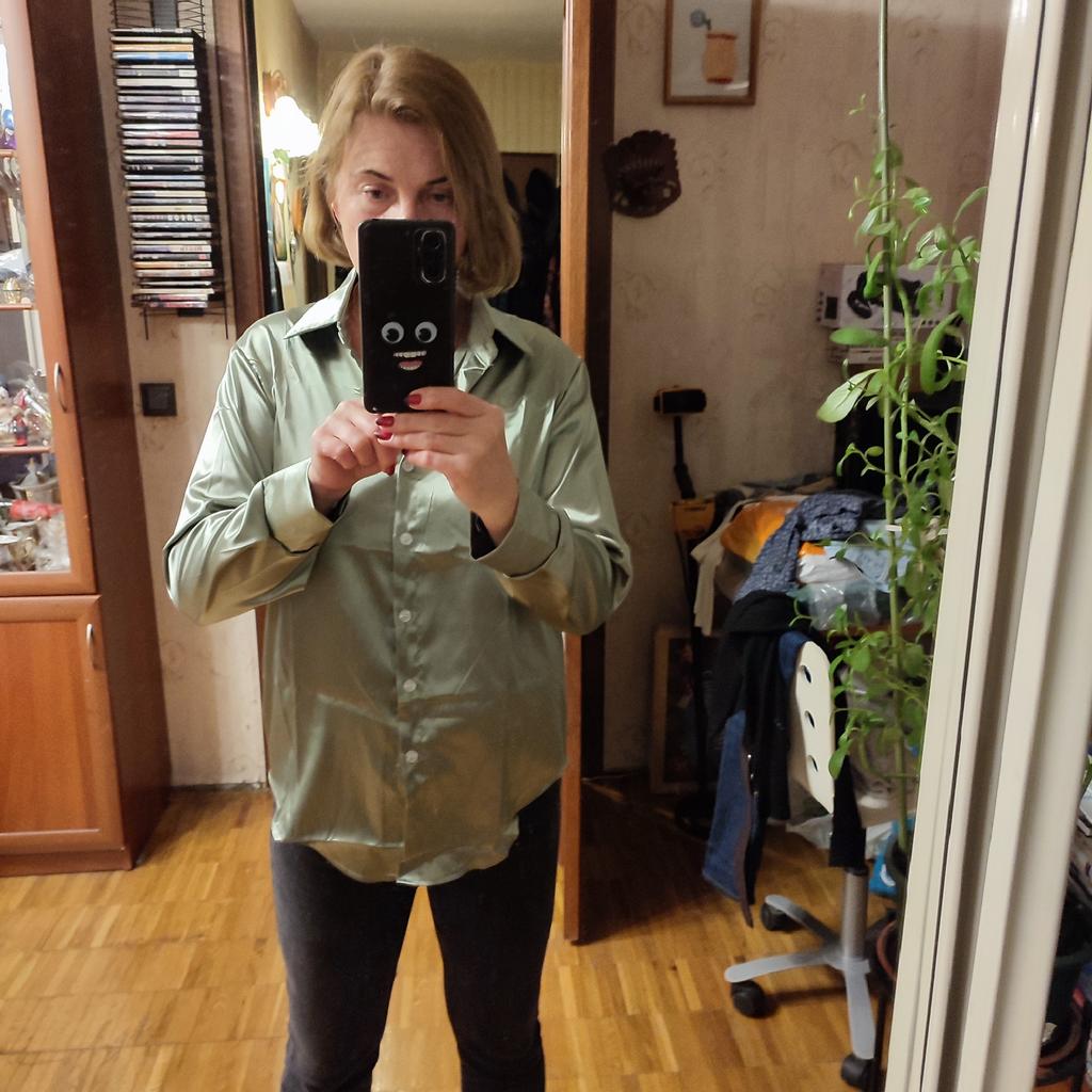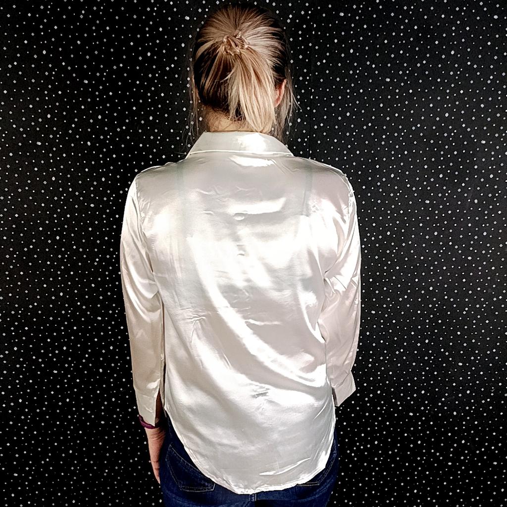The shirt is satin, I didn’t measure it, it’s so pretty, but an ordinary shirt. It will look great with trousers or a skirt!
