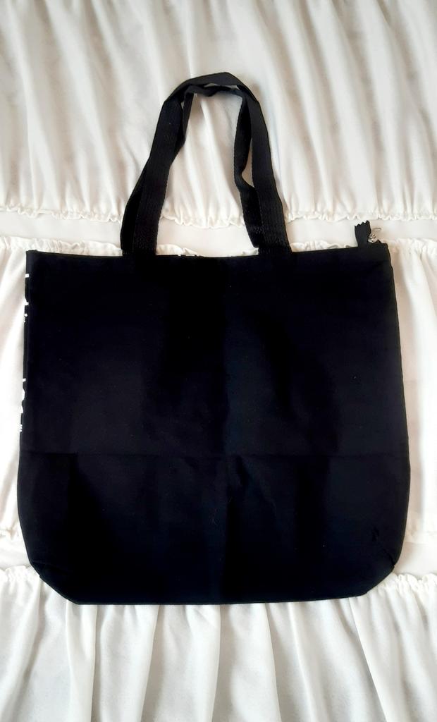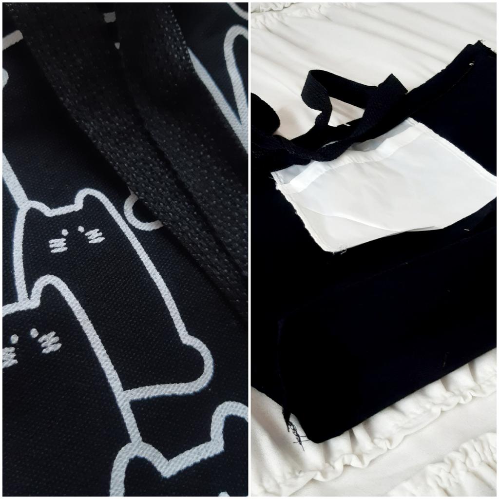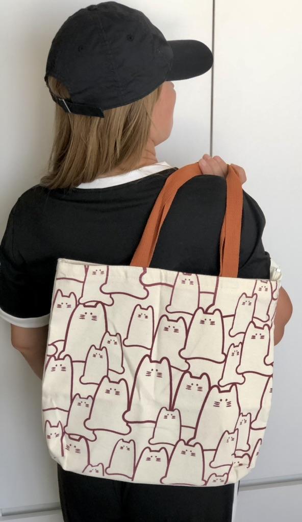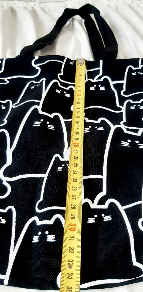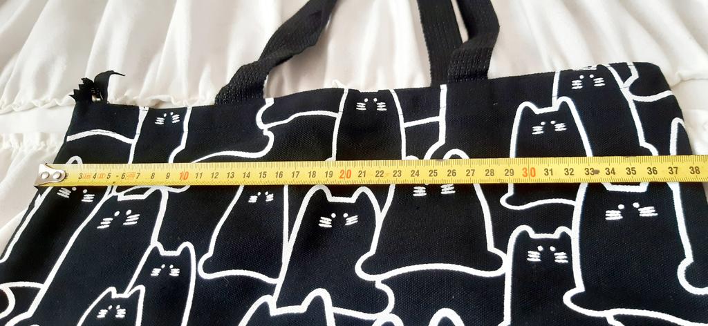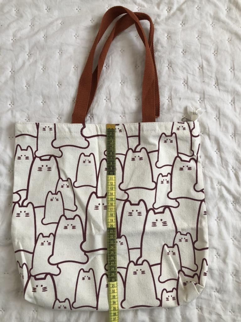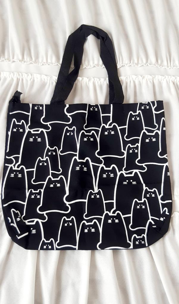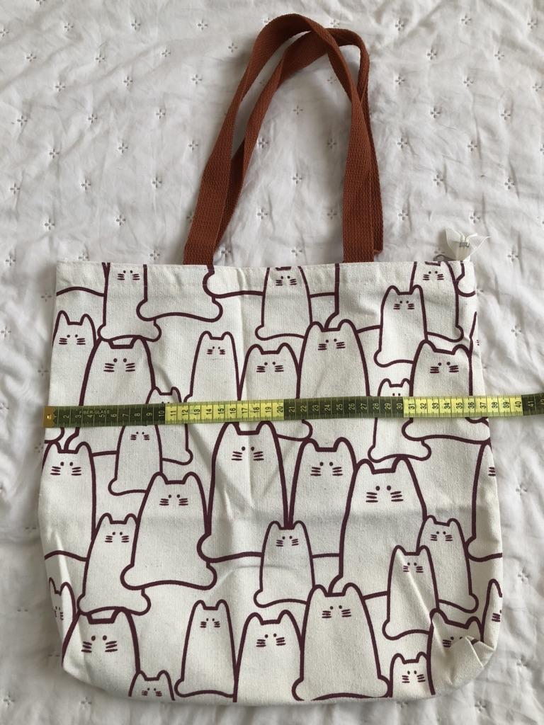 The shopper bag is nice. Not too big for me. Roomy shopper. and a cool cat print. Inside a small pocket, the bag closes with a zipper