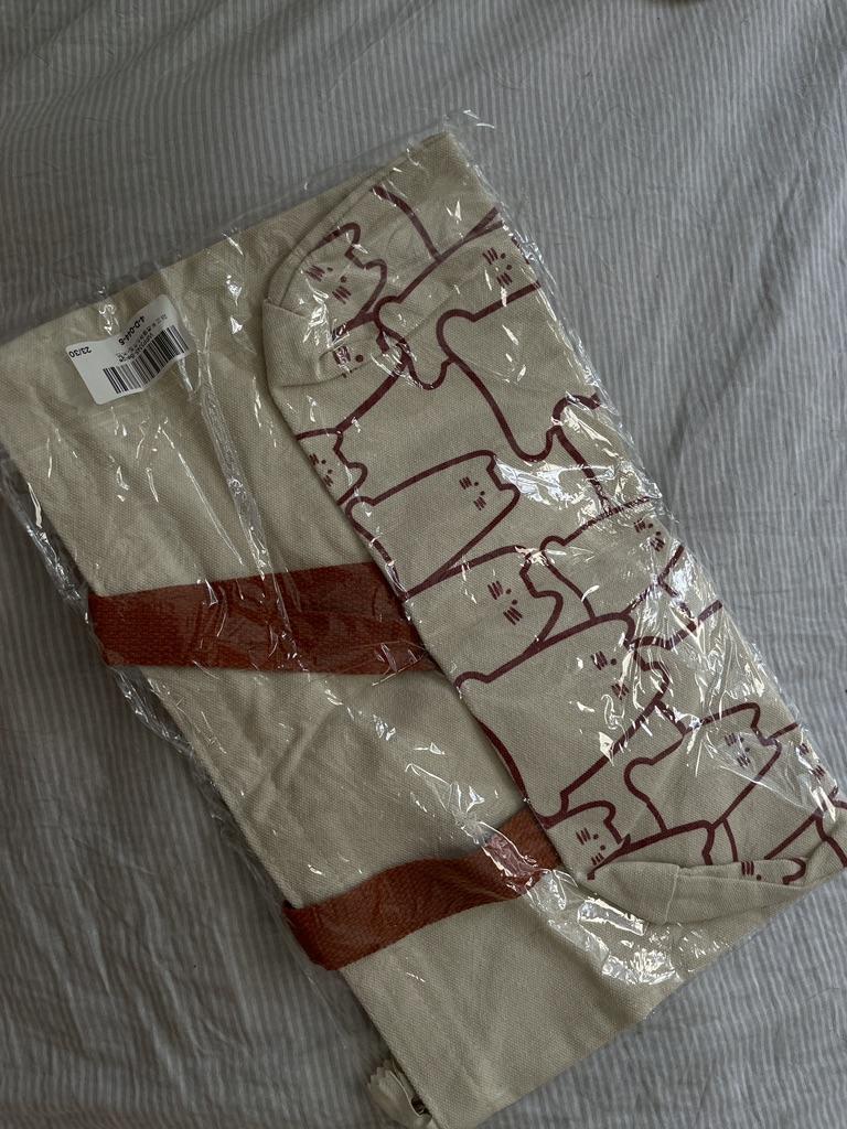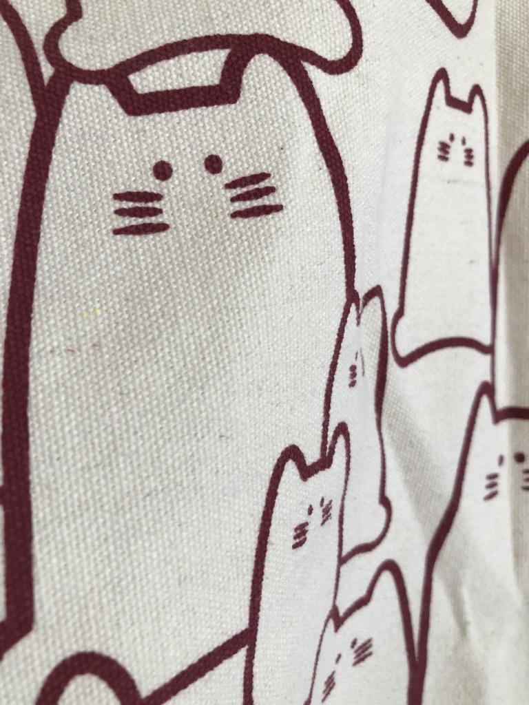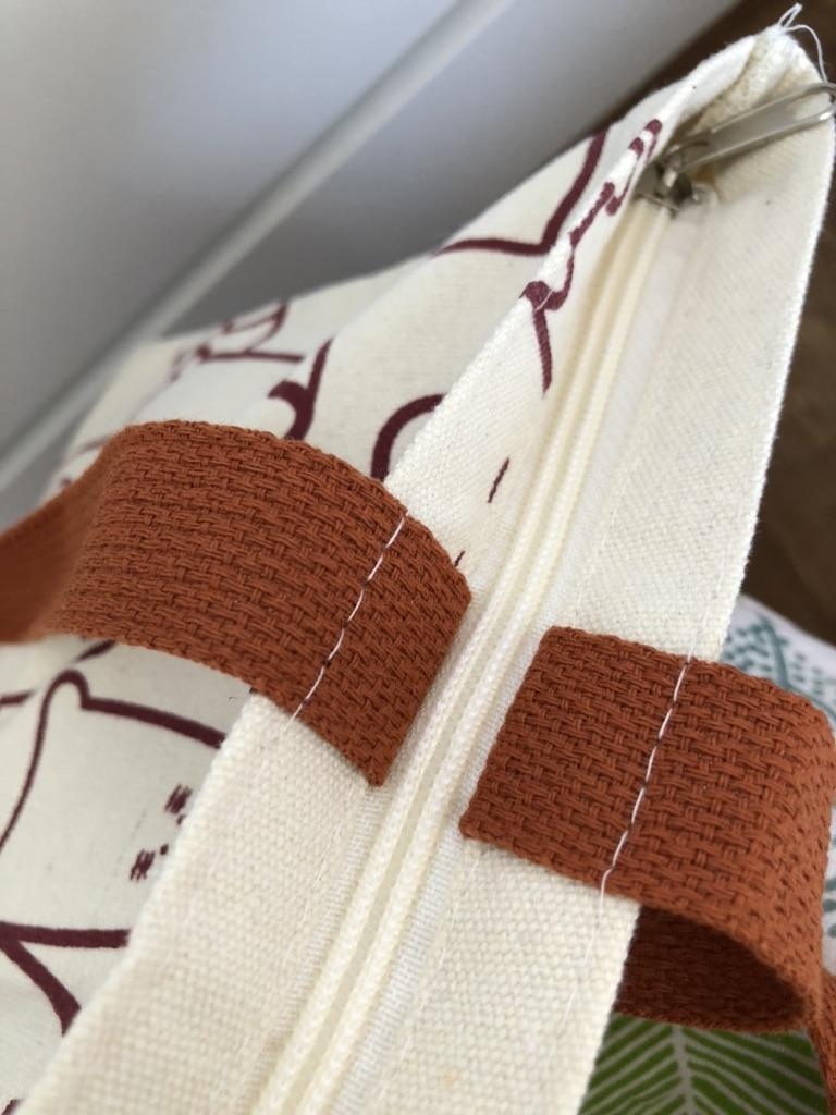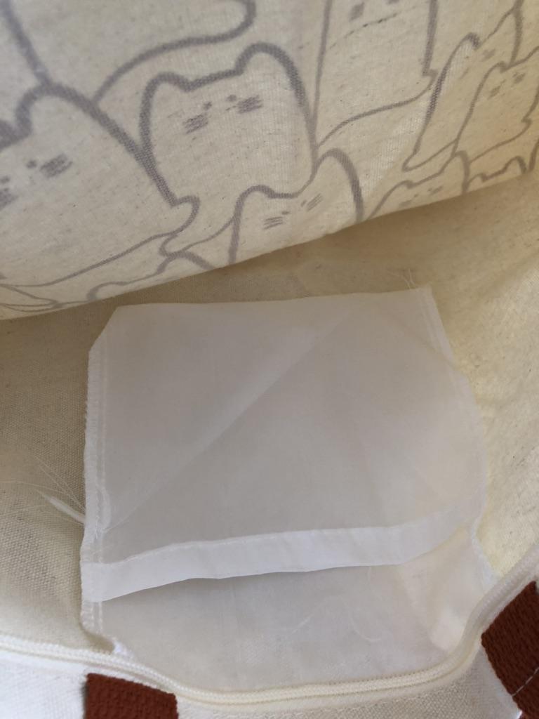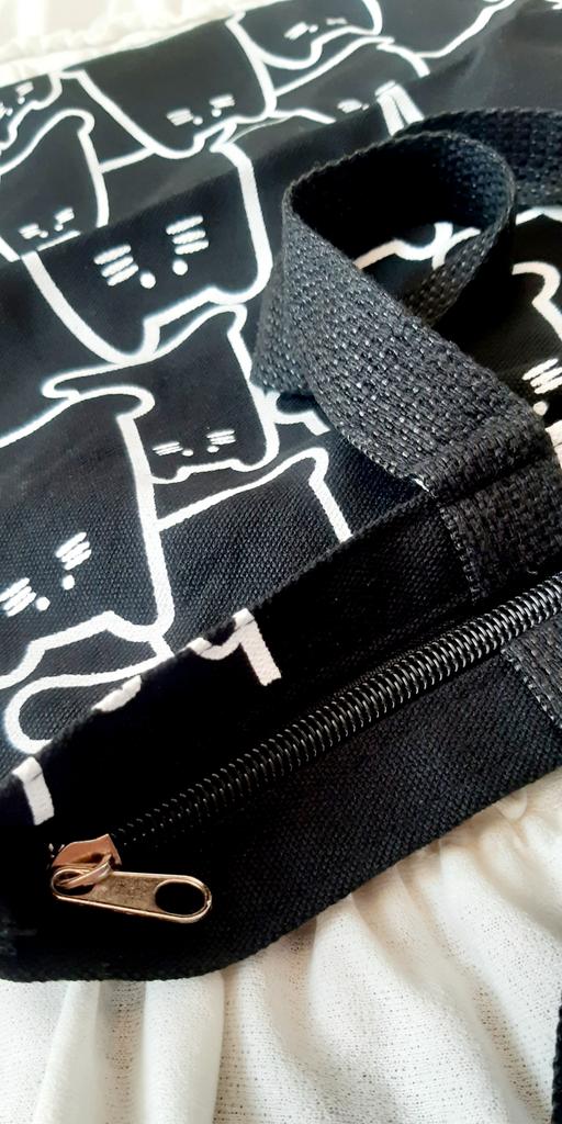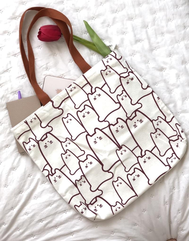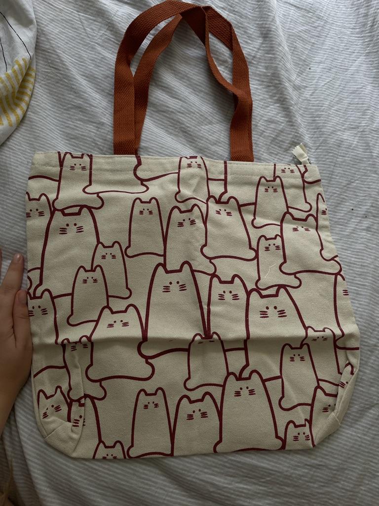 The shopper bag is nice. Not too big for me. Roomy shopper. and a cool cat print. Inside a small pocket, the bag closes with a zipper