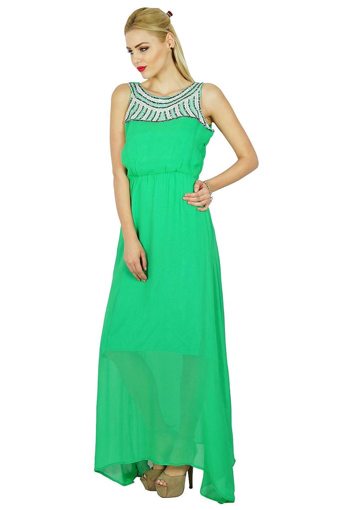 This is a long maxi dress designed by the skilled artisans at Bimba for casual wear purpose as well as for party wear purpose. Sleeveless, this long dress comes in a solid pattern but with adorable sequin work around the neckline. This long maxi dress has been made of one of the most stylish fabrics georgette that makes the dress a must have piece for all your wardrobes. Hurry and grab this piece and win compliments in a get together.