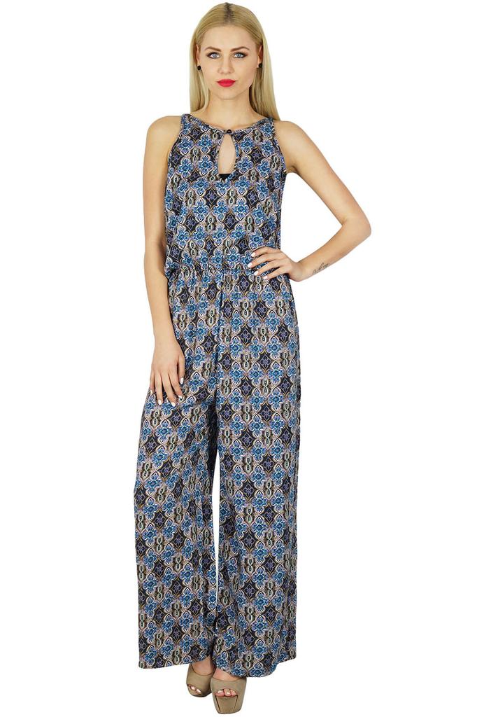 This is a Bimba made rayon jumpsuit that comes with a front key hole. Full in length and sleeveless this Blue and Grey colored jumpsuit has adorable floral patterns that you can flaunt in any occasion, be it casual or formal.