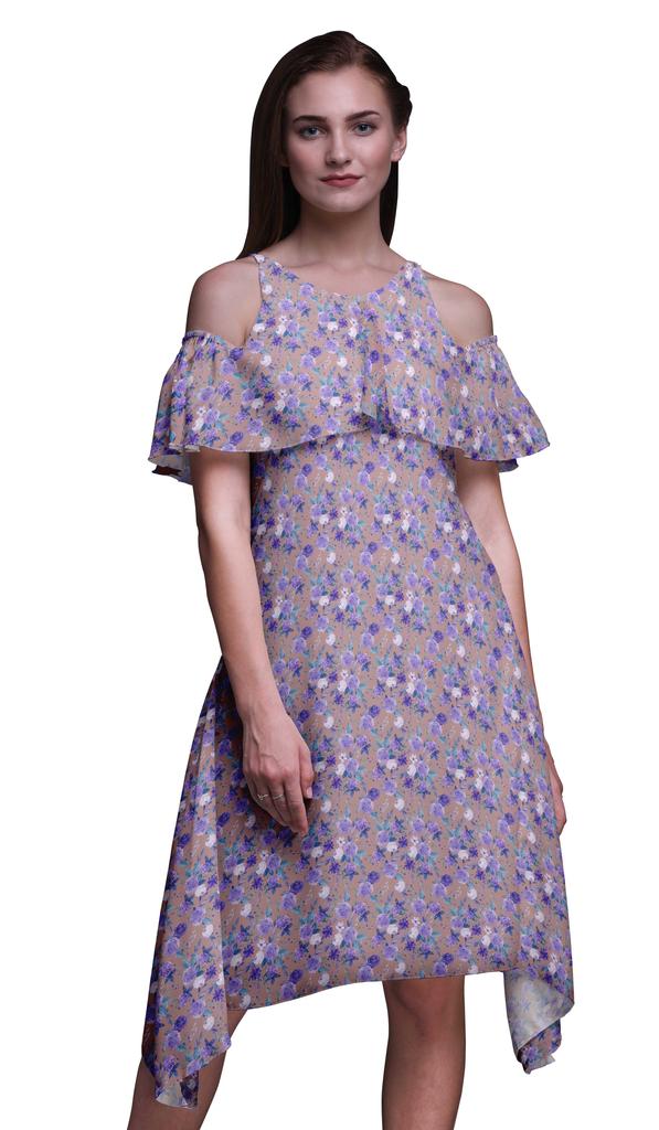 Bimba Floral Print Cold Shoulder Women Swing Tunic Flutter Sleeve Midi