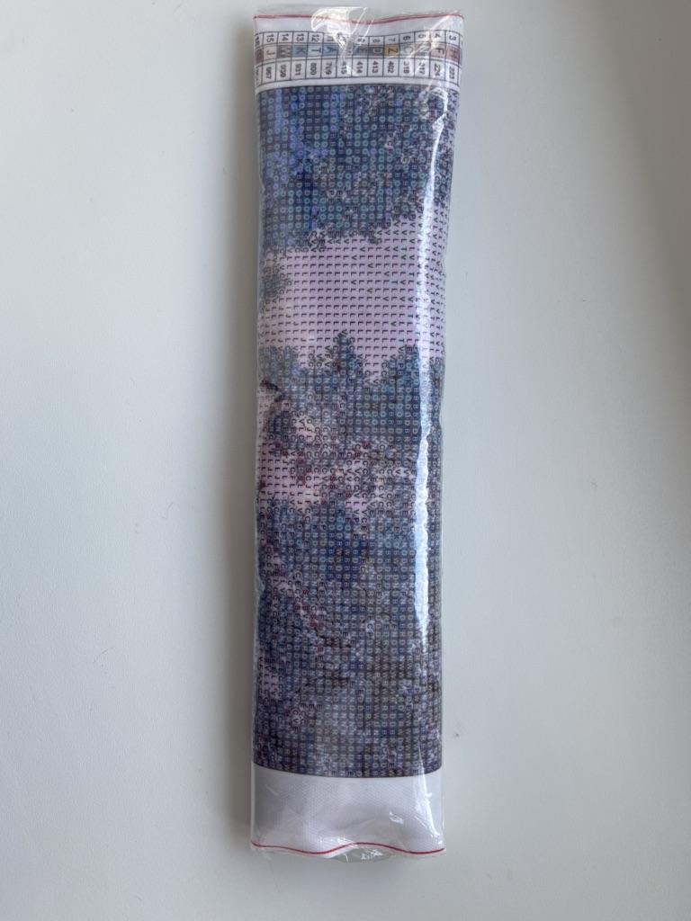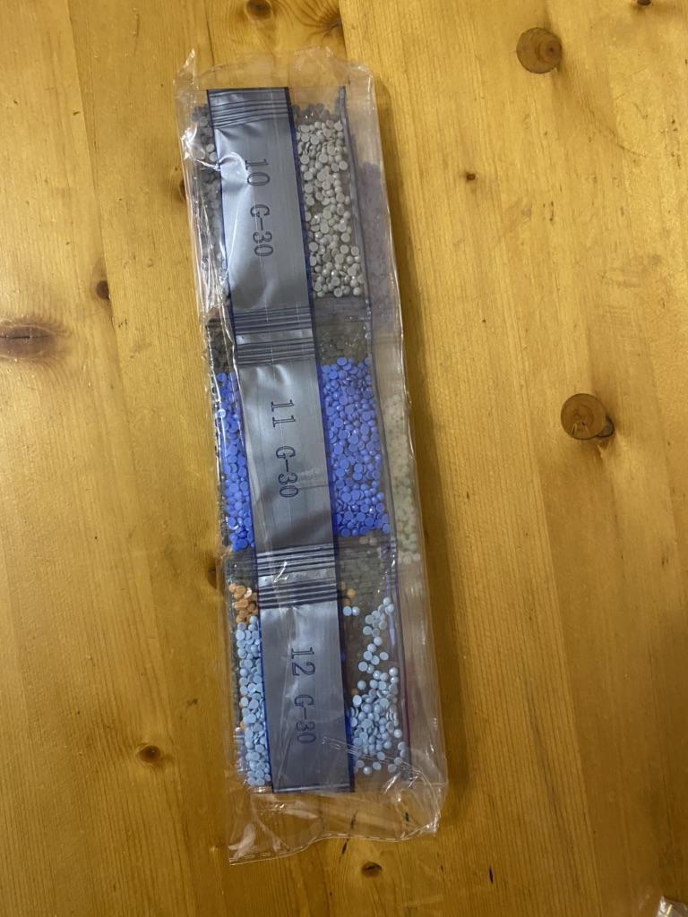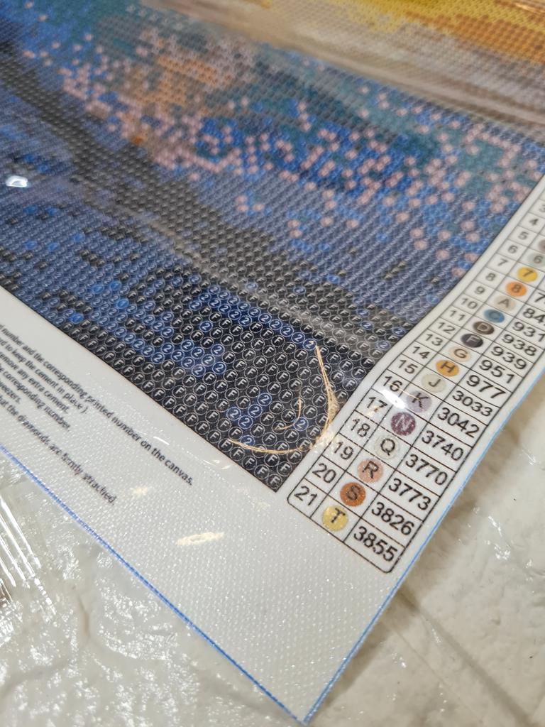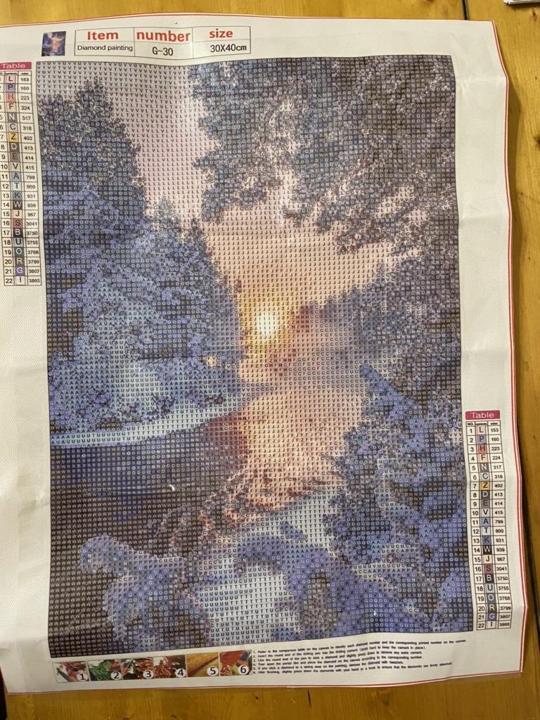 Assembling this landscape is harder than assembling kitten faces. The letters and numbers on the adhesive backing are hard to see, especially in the dark areas. I started assembling it, but have put the work aside for now.