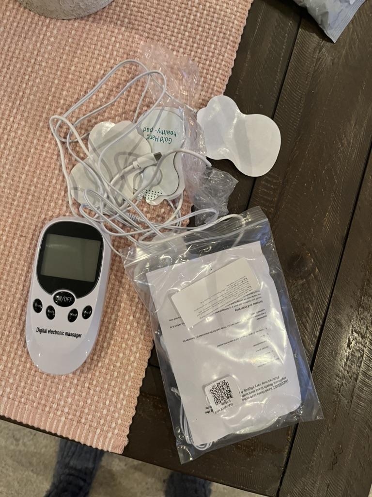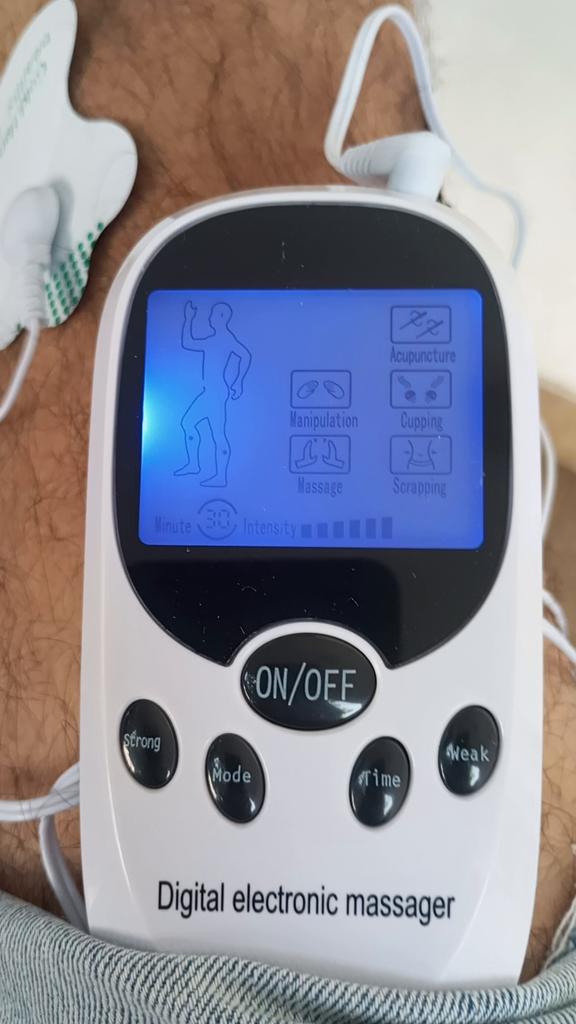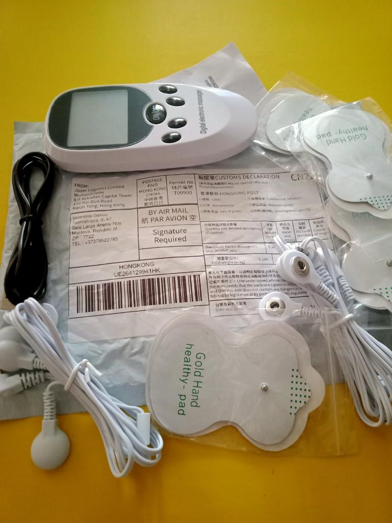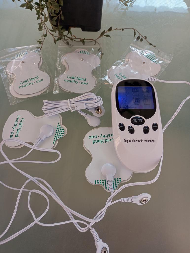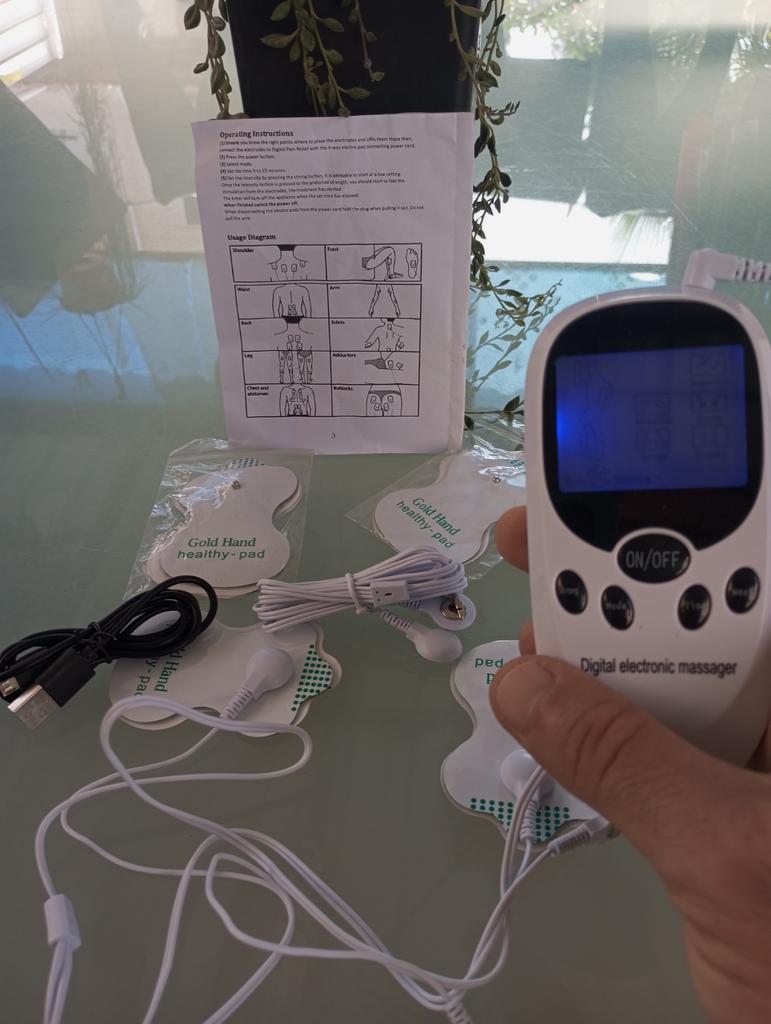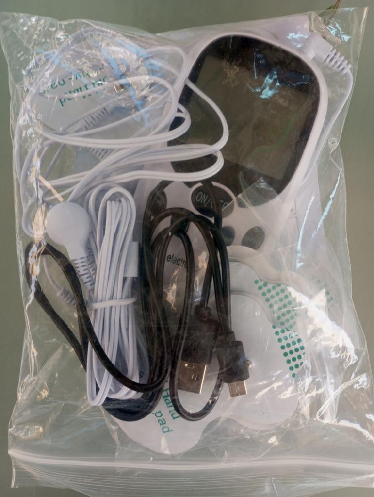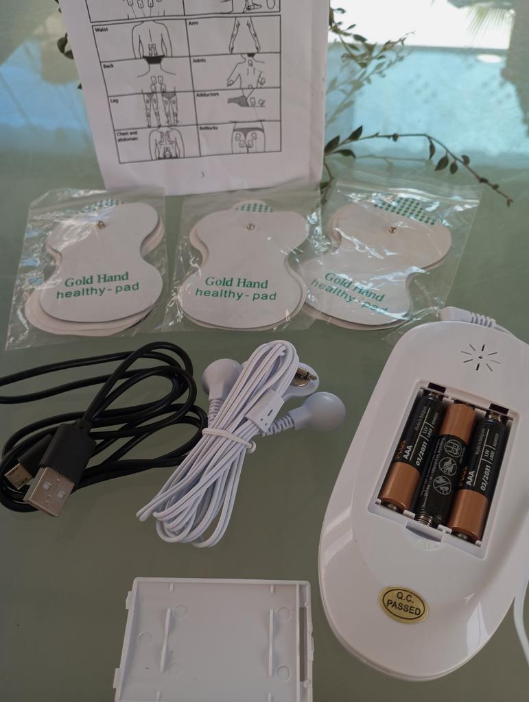 Excellent device for home physiotherapy. I already had one, and this one works both on batteries and from a charger. Included is a USB charging cord, 2 cords with 4 electrodes at the end and 8 self-adhesive pads.
