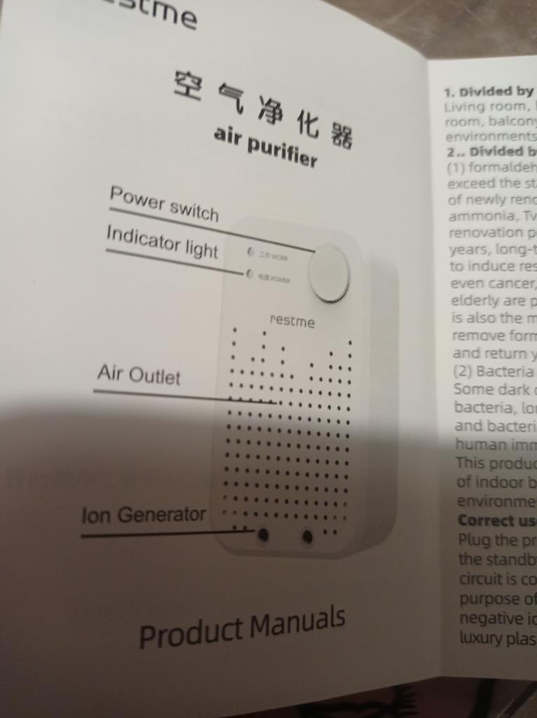 I received an air purifier that is a fake, on which it says 'restme plus', although the seller's photos show the basic version on which it says 'restme' and the improved version on which it says 'restme pro'. Moreover, on the photos displayed on the website, the device emits negative ions with 800w in the basic version and 2000w in the improved version. On the fake that I received, it says 2w. In addition, in the product description it appears that the fan of the air purifier works silently, or the fake one sent to me does not have a fan. Finally, instead of a bulb that emits ultraviolet light, the one sent to me has a blue LED and, when you plug it in, it doesn't make any noise and you don't feel any breeze.