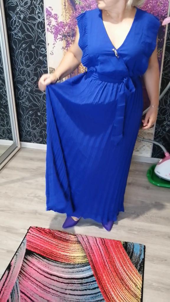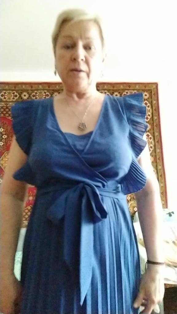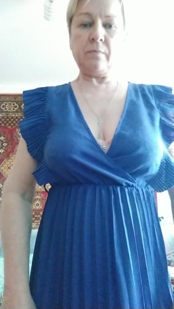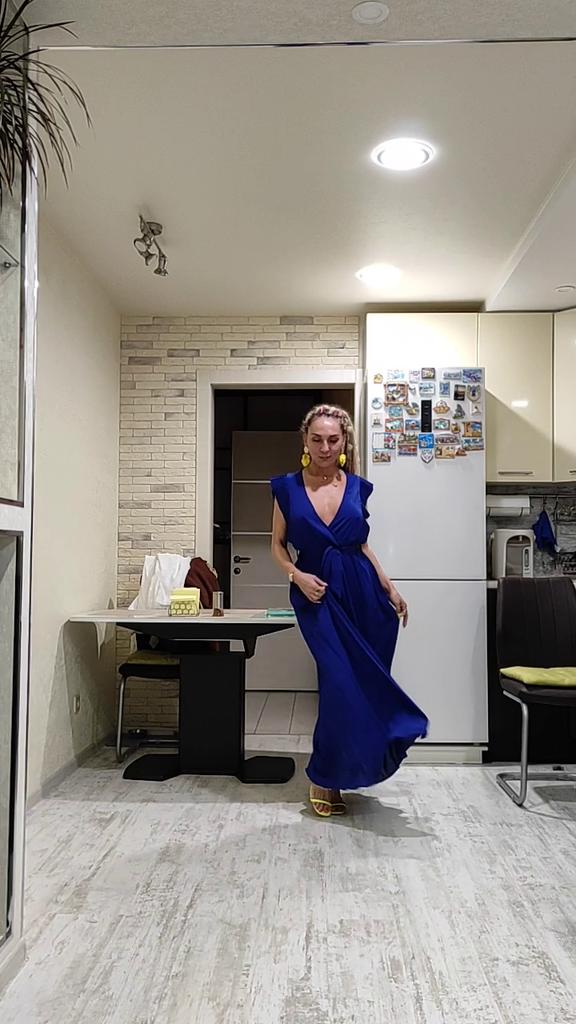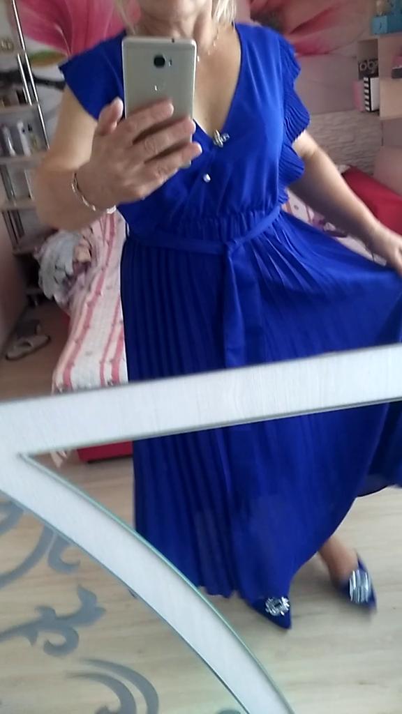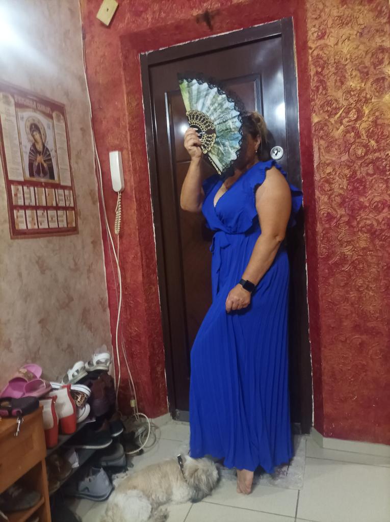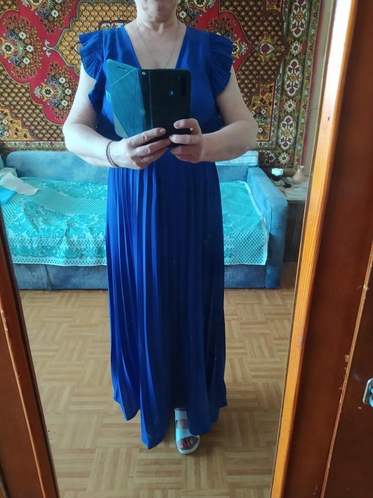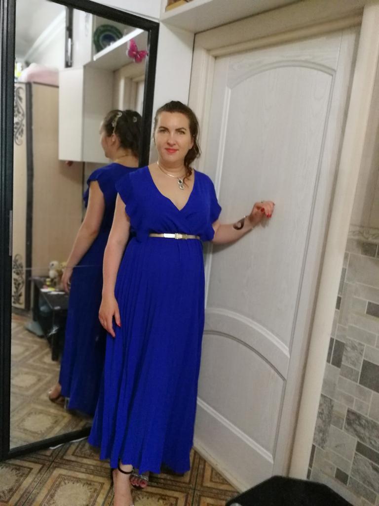 The dress is wonderful, the size is right, the color is deep blue, I have already removed the length. All that remains is to steam it, the fabric is thick, it holds its shape well