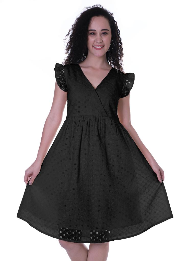* Features: Comfortable gathered V neck Schiffli dress with frill sleeves.