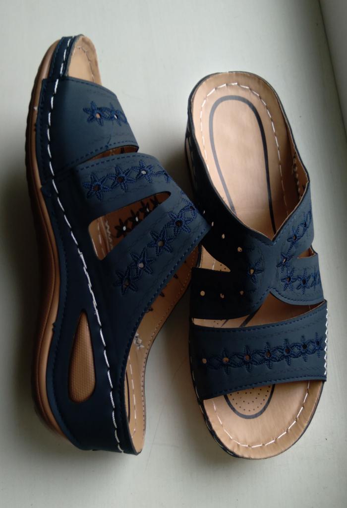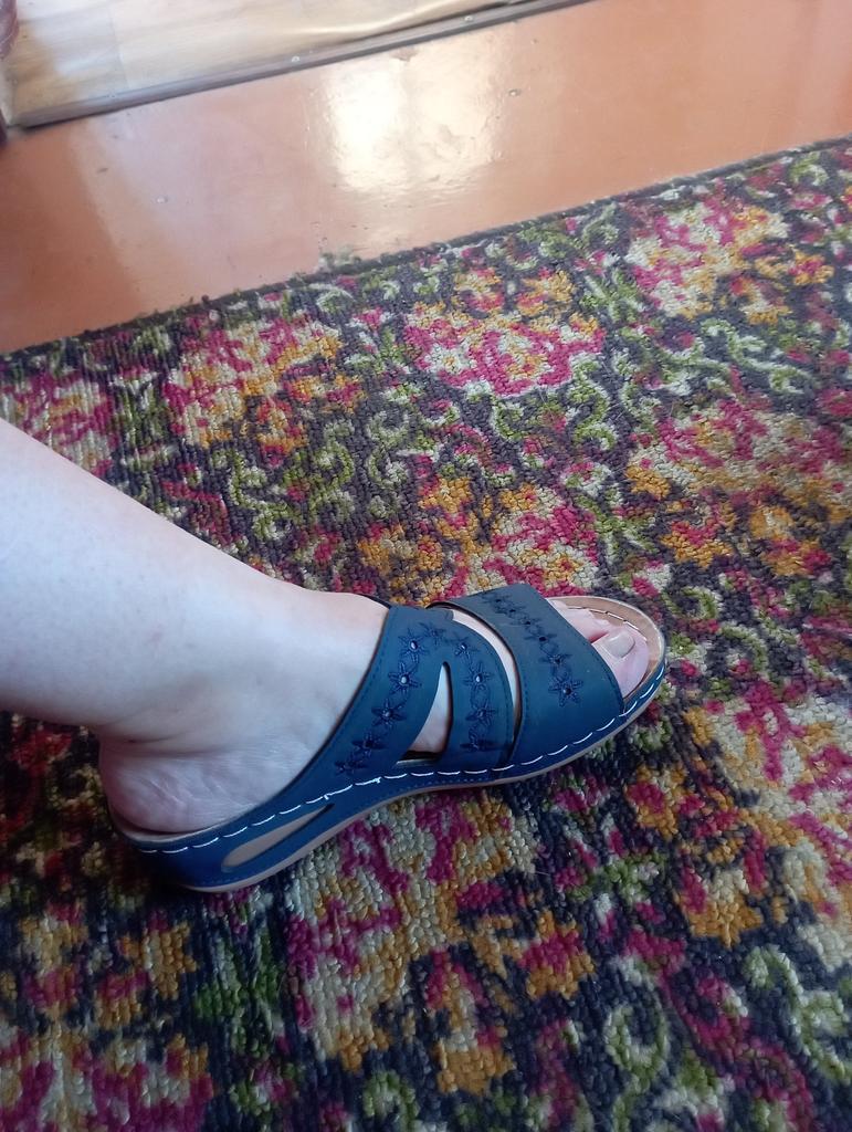 Sandals with an open heel, size 38, fit 37. They are sewn with high quality from some artificial material. But very light, but... on a grand scale. I have a standard foot, they are too wide for me. I think in the summer, when the foot is wet and a little swollen, they will be comfortable. In any case, it will be useful to walk around the house. This is better than greeting guests in slippers.