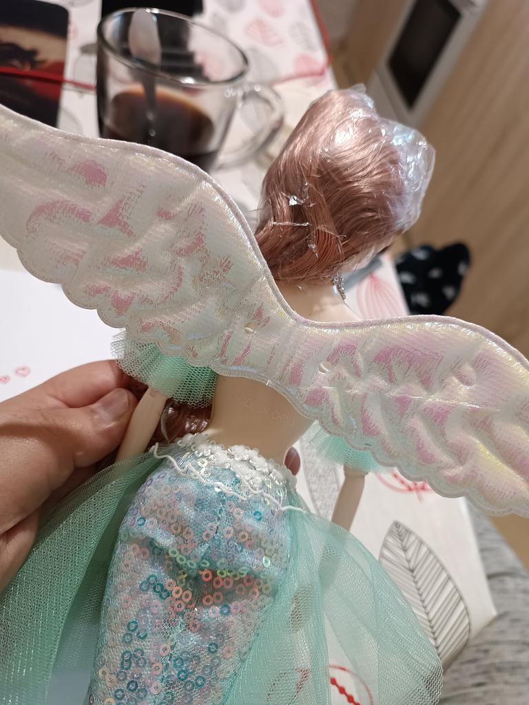 The doll is as in the photo, rather big, the wings are on Velcro, you can remove them, the child is happy