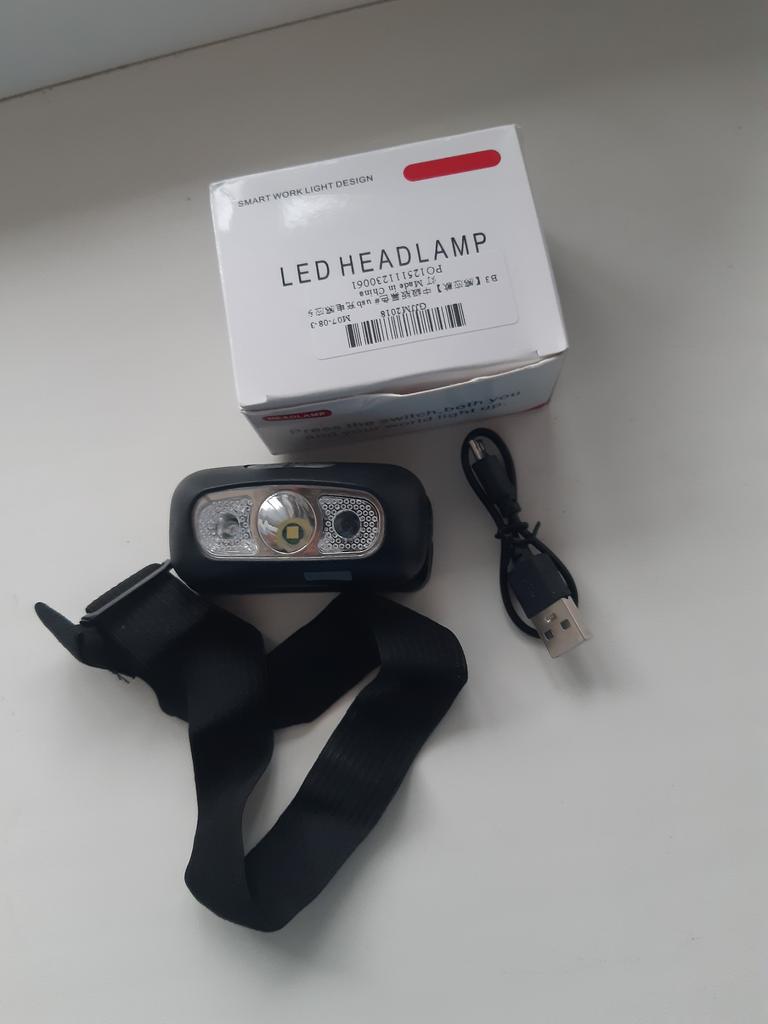 Packed in its own box. Charged It has two levels of brightness in static mode and in the on-off mode by raising the hand. It also reacts to approaching any object to a distance of about 7 cm. When charging, there is a charge/completion indication. The angle of inclination on the head changes and is fixed. Rubber of tolerable quality. Micro USB charging port. It has a directed beam, shines far ahead, illuminates unevenly nearby. A flashlight for walking in the dark on flat roads. It has a pale red indication in hand up mode.