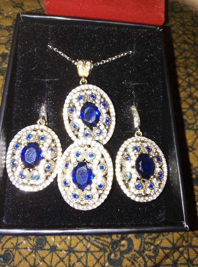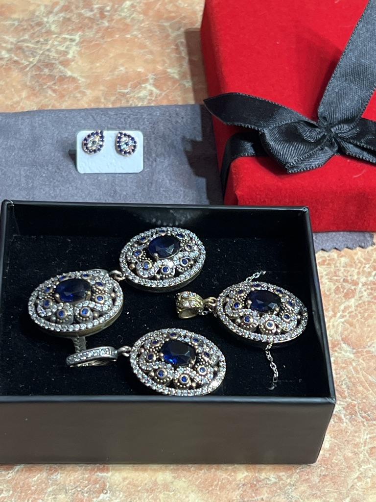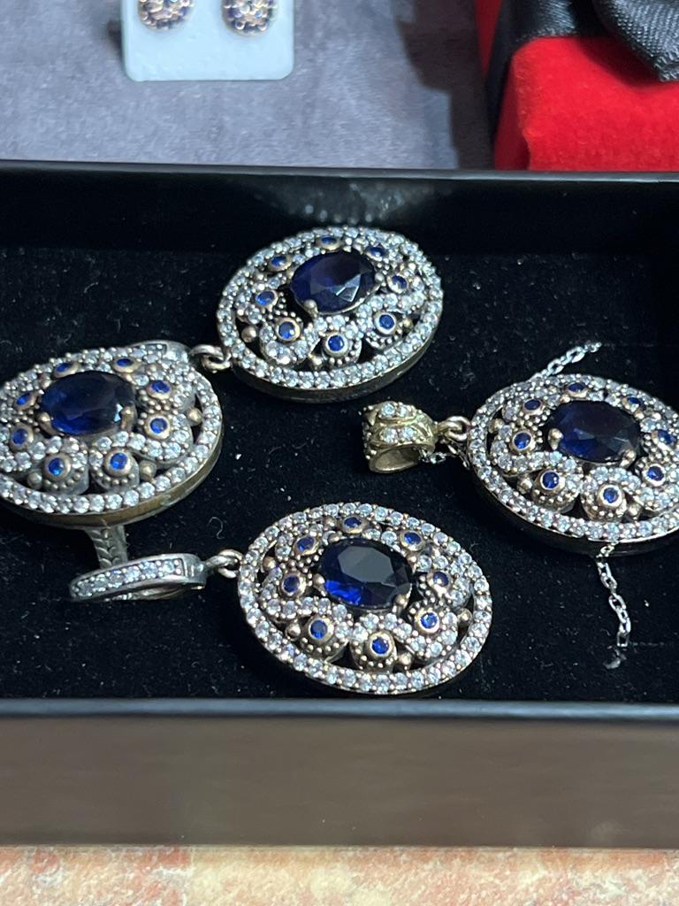 Handmade Sapphire Stone Jewelry Set, Turkish Silver Jewelry, Ottoman Style Silver Sets, 925 Sterling Silver Sets, Hand Craft Jewelry