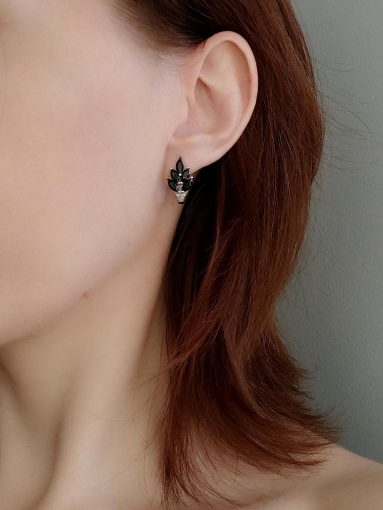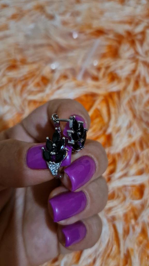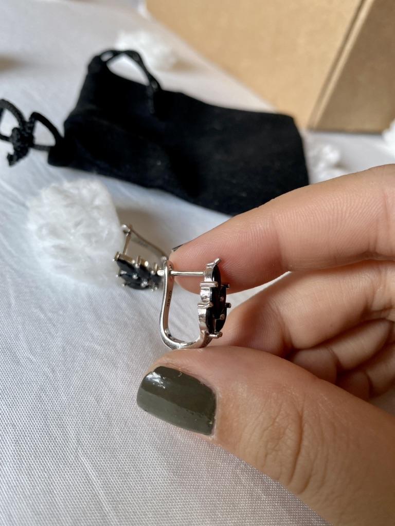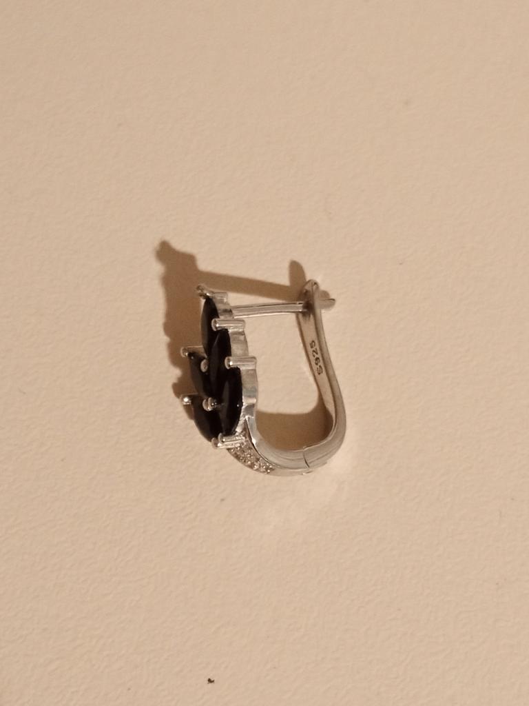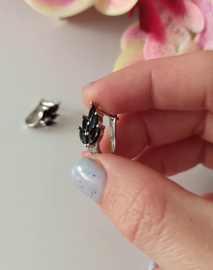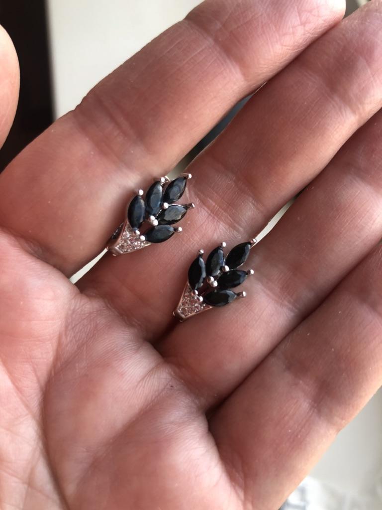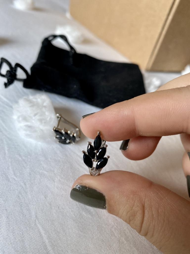 These earrings are an ideal accessory for any look due to their versatility and design.. In a silver color with black stones, they are a very elegant jewel and combine perfectly with both elegant and sophisticated looks and more casual looks for day to day.. The presentation is also very good. They came in a little black velvet bag so I also think it's a great gift idea. They have very good quality and the leaf-shaped design seems beautiful and original to me. Bring engraved numbering 925. The size is ideal, they are also light, do not weigh and therefore do not deform the ear. 🚚 Shipping was fast, it took about a week to get home. 📦 They came in a box and inside this the little bag. In addition, the earrings came in a plastic bag. They arrived in perfect condition. 🖤 Very good quality and great design. 100% recommendable
