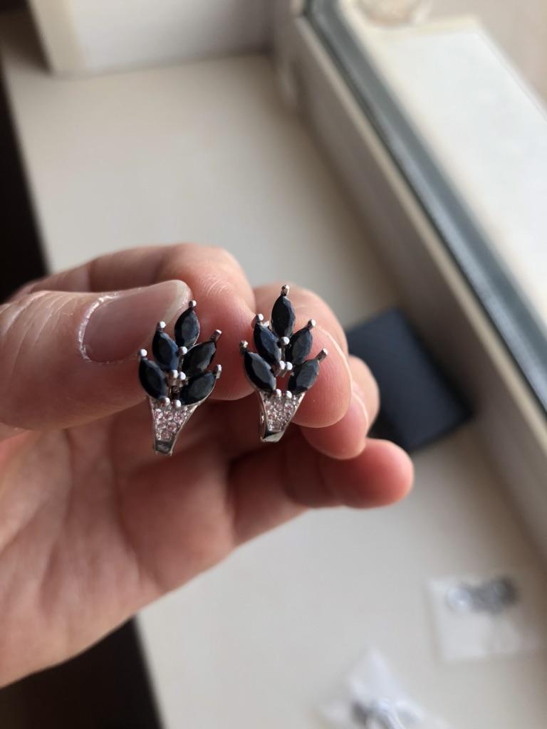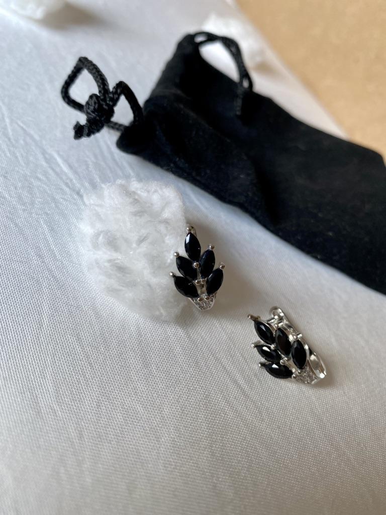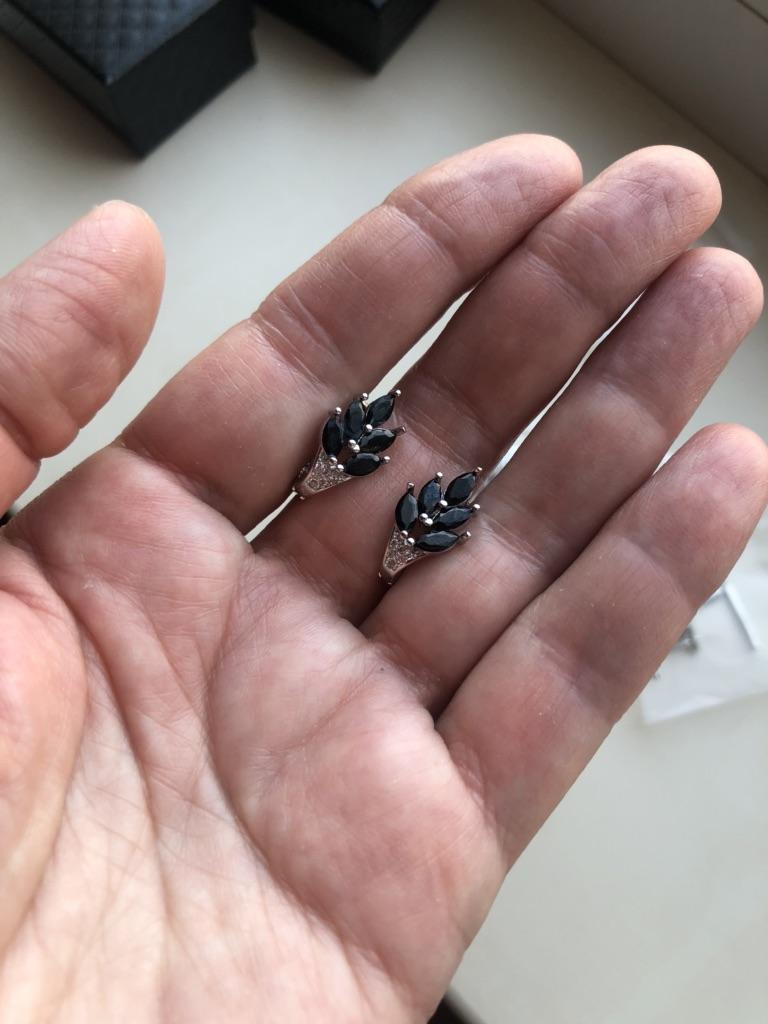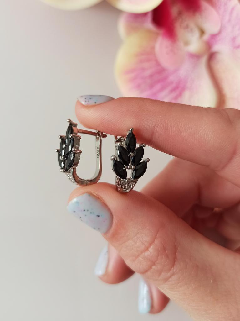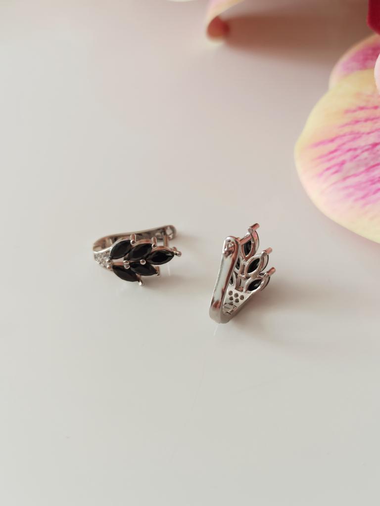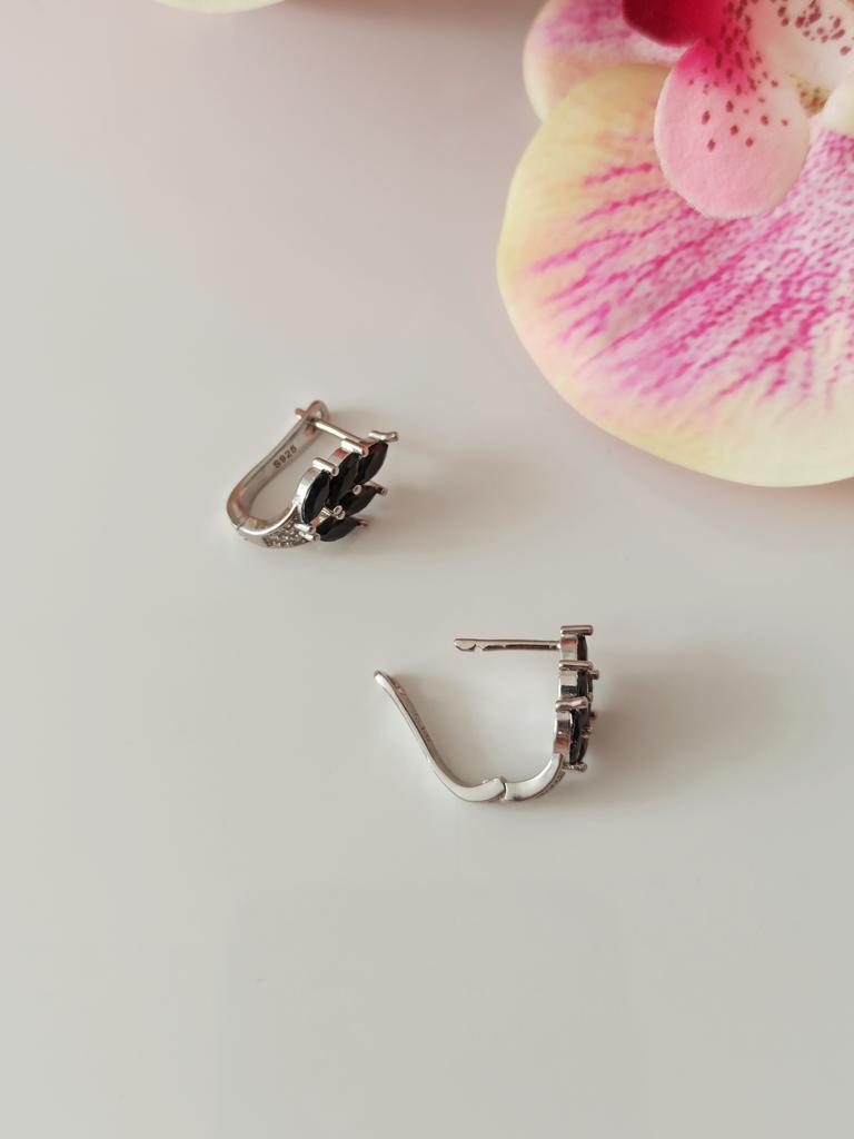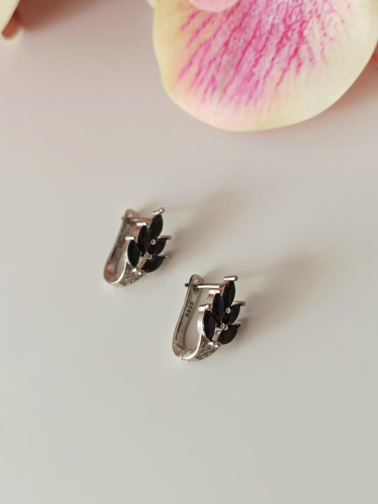 These earrings are an ideal accessory for any look due to their versatility and design.. In a silver color with black stones, they are a very elegant jewel and combine perfectly with both elegant and sophisticated looks and more casual looks for day to day.. The presentation is also very good. They came in a little black velvet bag so I also think it's a great gift idea. They have very good quality and the leaf-shaped design seems beautiful and original to me. Bring engraved numbering 925. The size is ideal, they are also light, do not weigh and therefore do not deform the ear. 🚚 Shipping was fast, it took about a week to get home. 📦 They came in a box and inside this the little bag. In addition, the earrings came in a plastic bag. They arrived in perfect condition. 🖤 Very good quality and great design. 100% recommendable