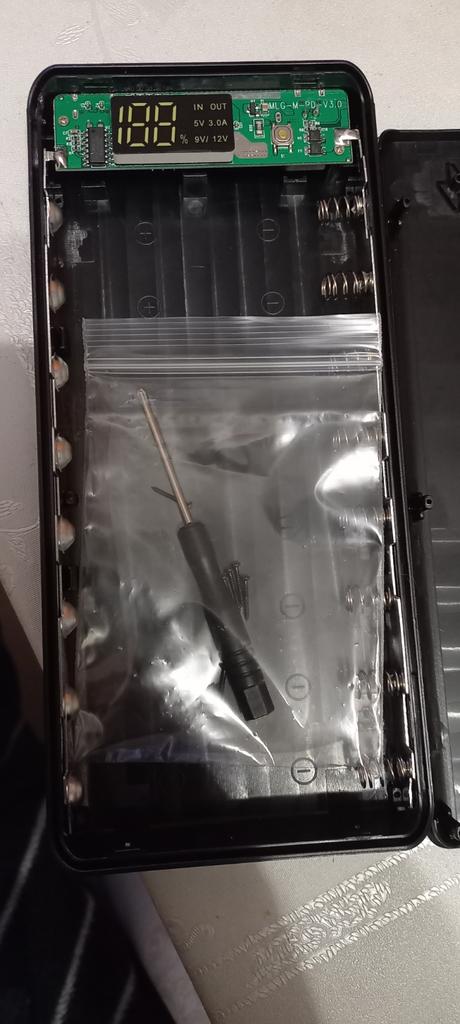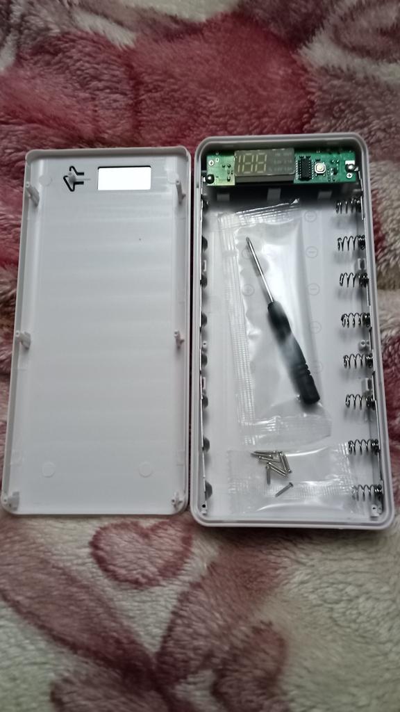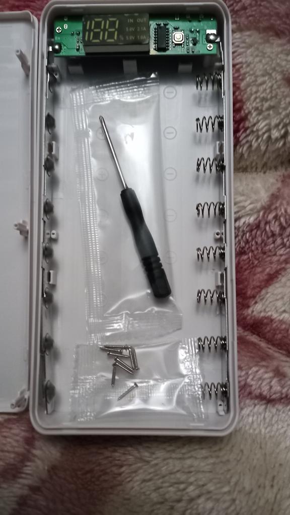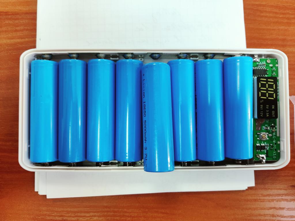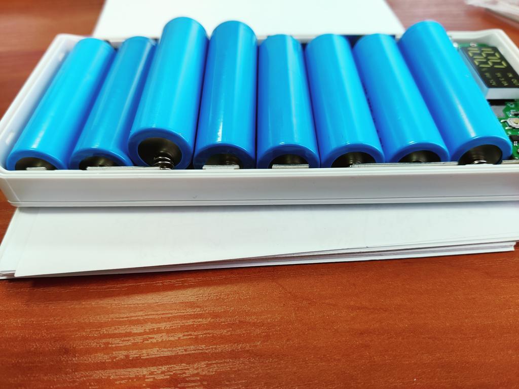 Quite a nice thing, even a screwdriver was sent inside, the material is pleasant to the touch, it works even with one battery, it does not require the full number of batteries. But there is one but, I inserted 8 lithium-ion batteries, which I just bought and left to charge overnight, as it was 38%, in the morning it remained, not even 1% was added. The indicator in is blinking, that is, input, but the charge does not go.