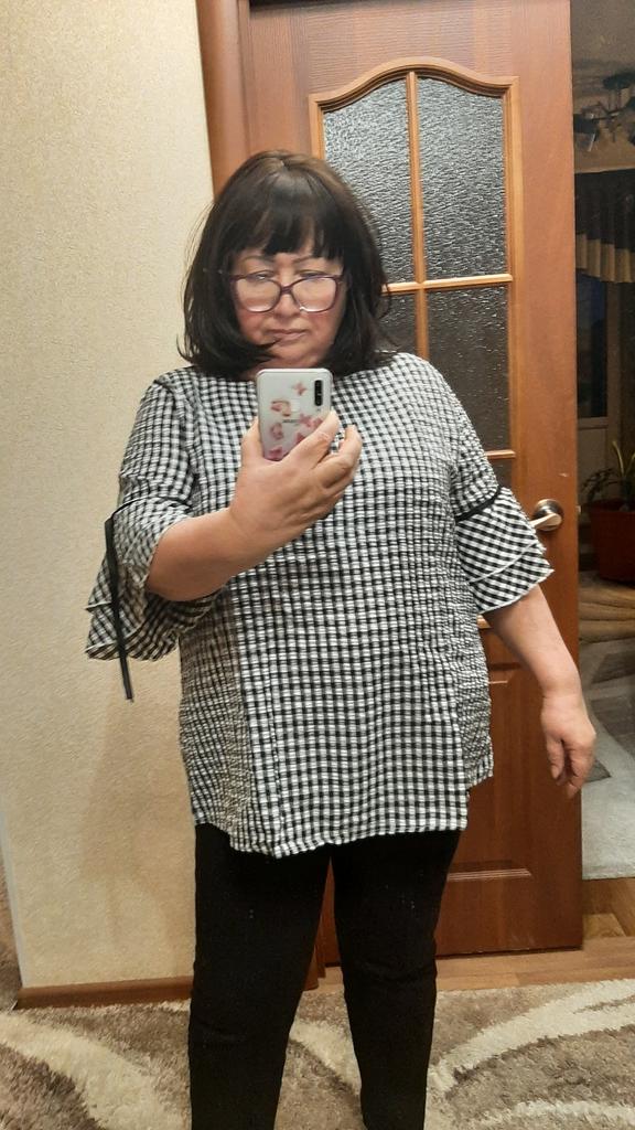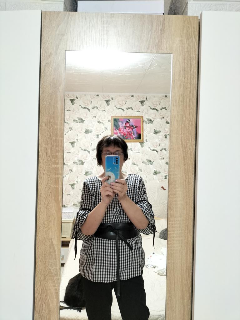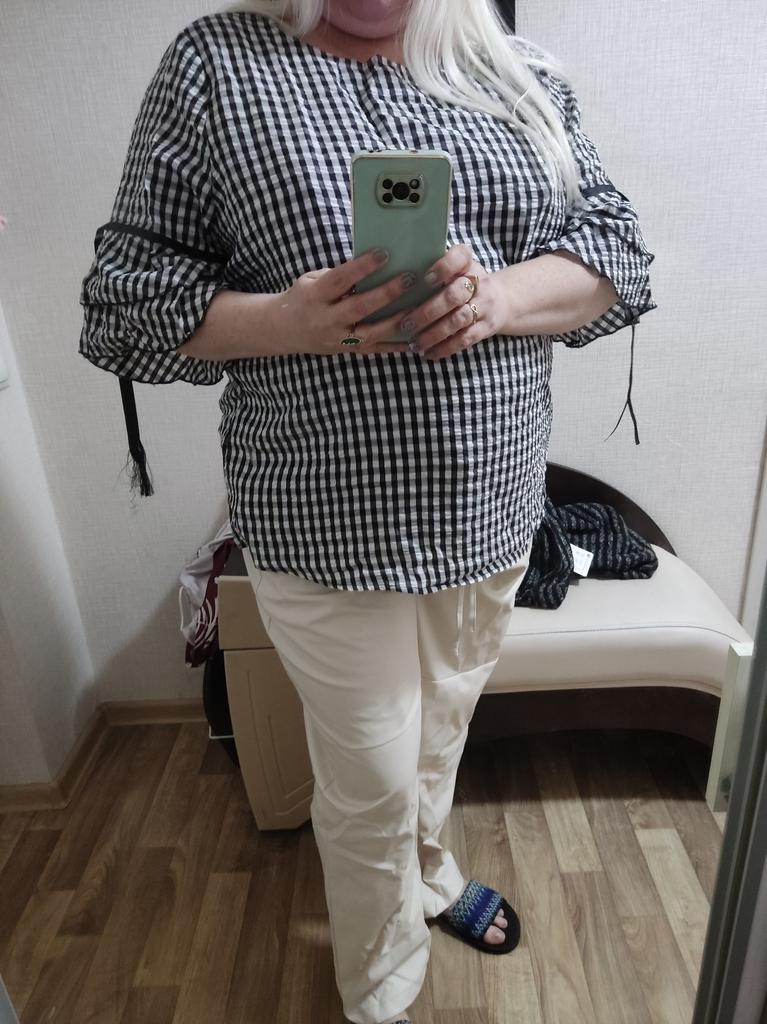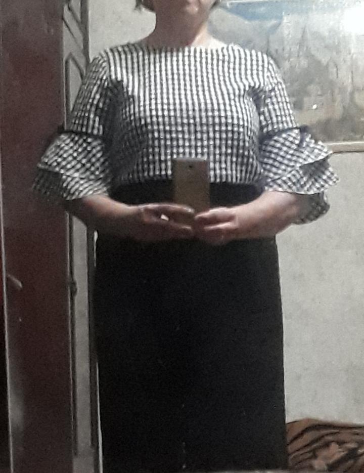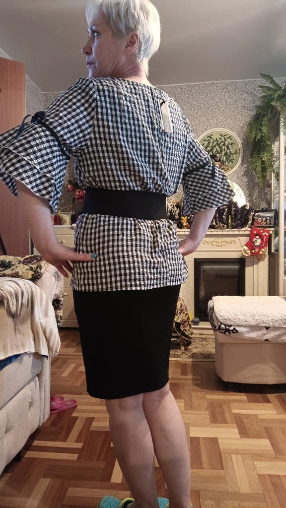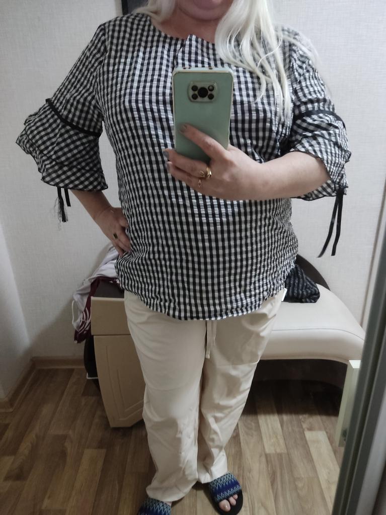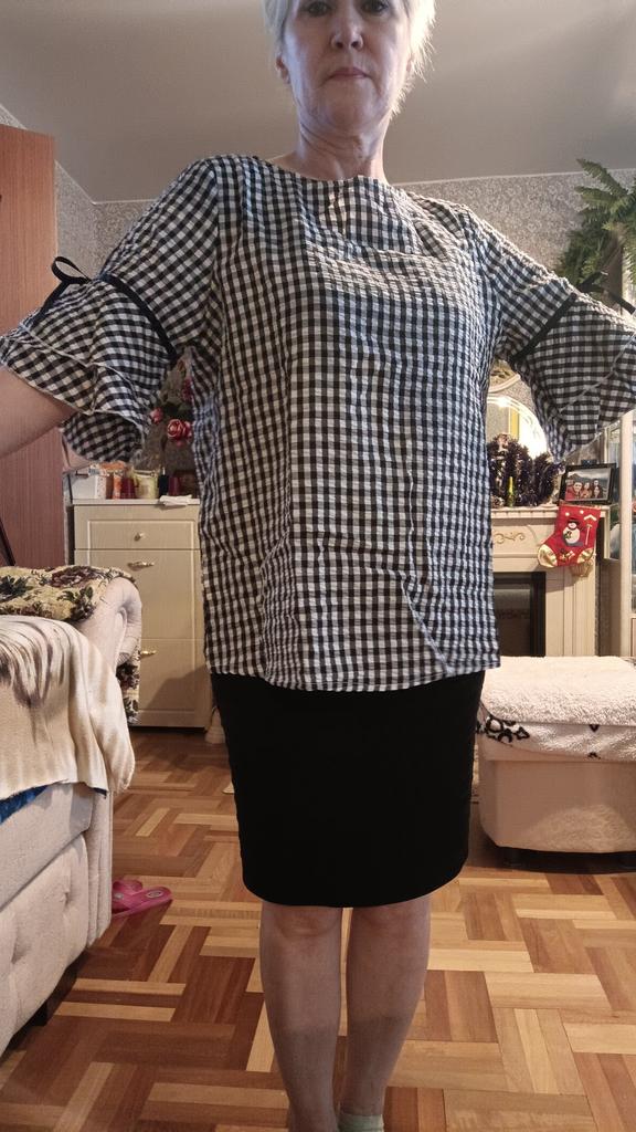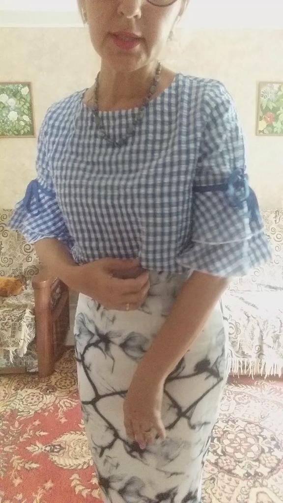 The blouse is normal, the only drawback is the lack of bust darts, the blouse constantly slides back, and I have to pull it down frequently. Otherwise, the material is light, it doesn't need ironing after washing, and it doesn't wrinkle.