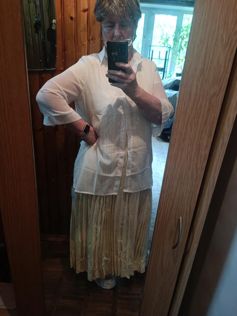 It looks good in the picture. In reality it is very electrified. The length is unclear, I will try to shorten it and wear it as a blouse under a jacket.